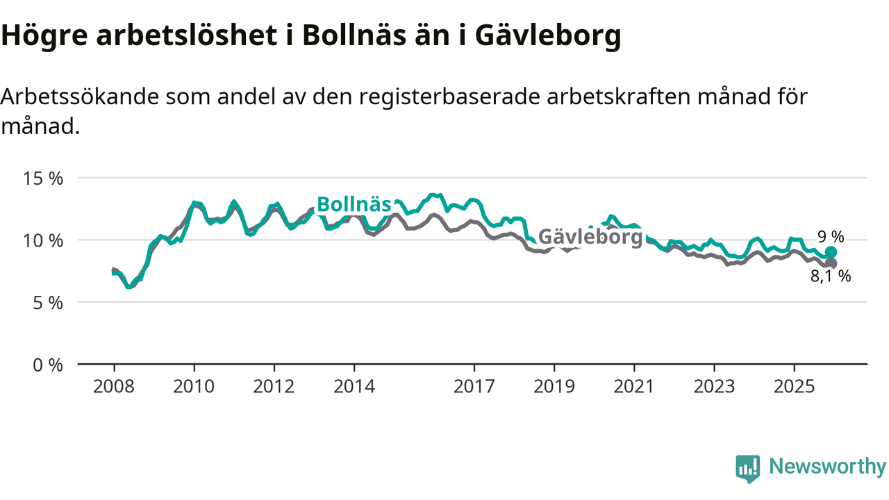 Graf: Arbetslöshet i Bollnäs kommun och Gävleborgs län