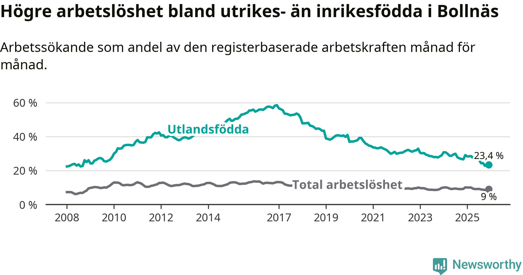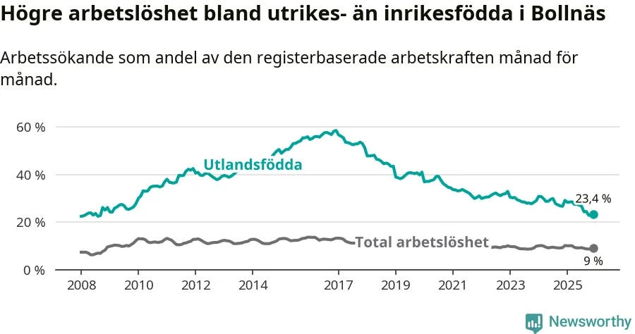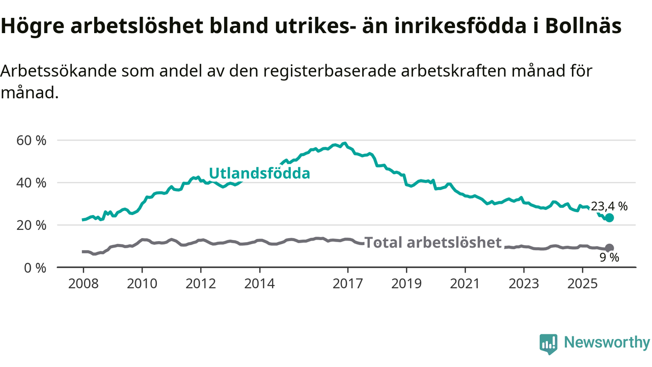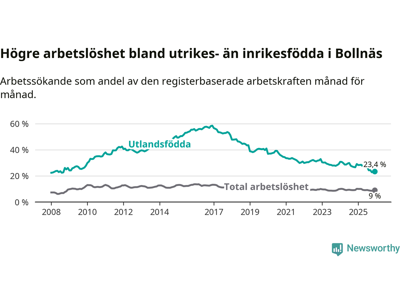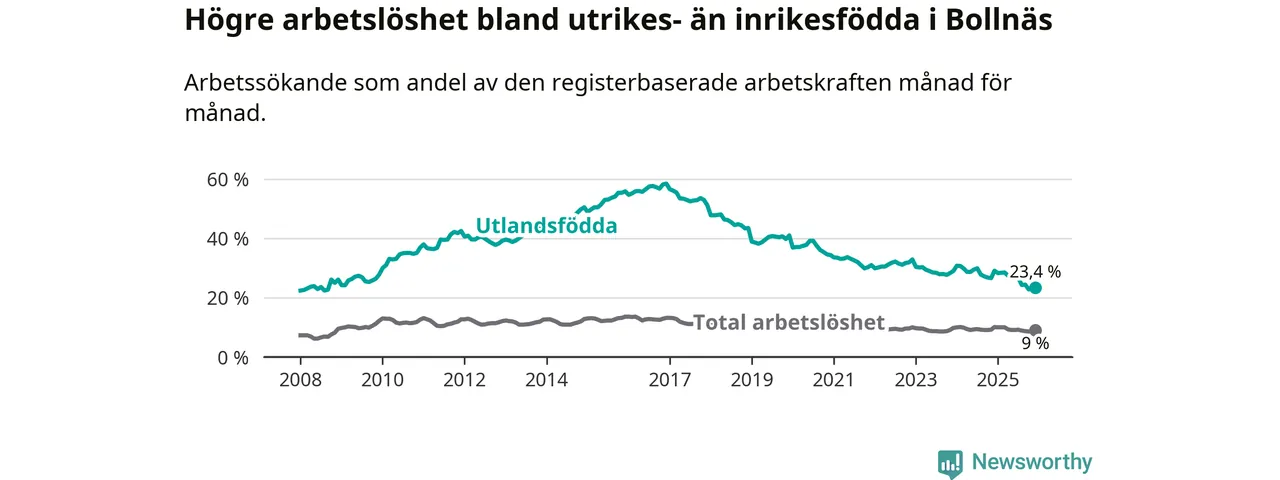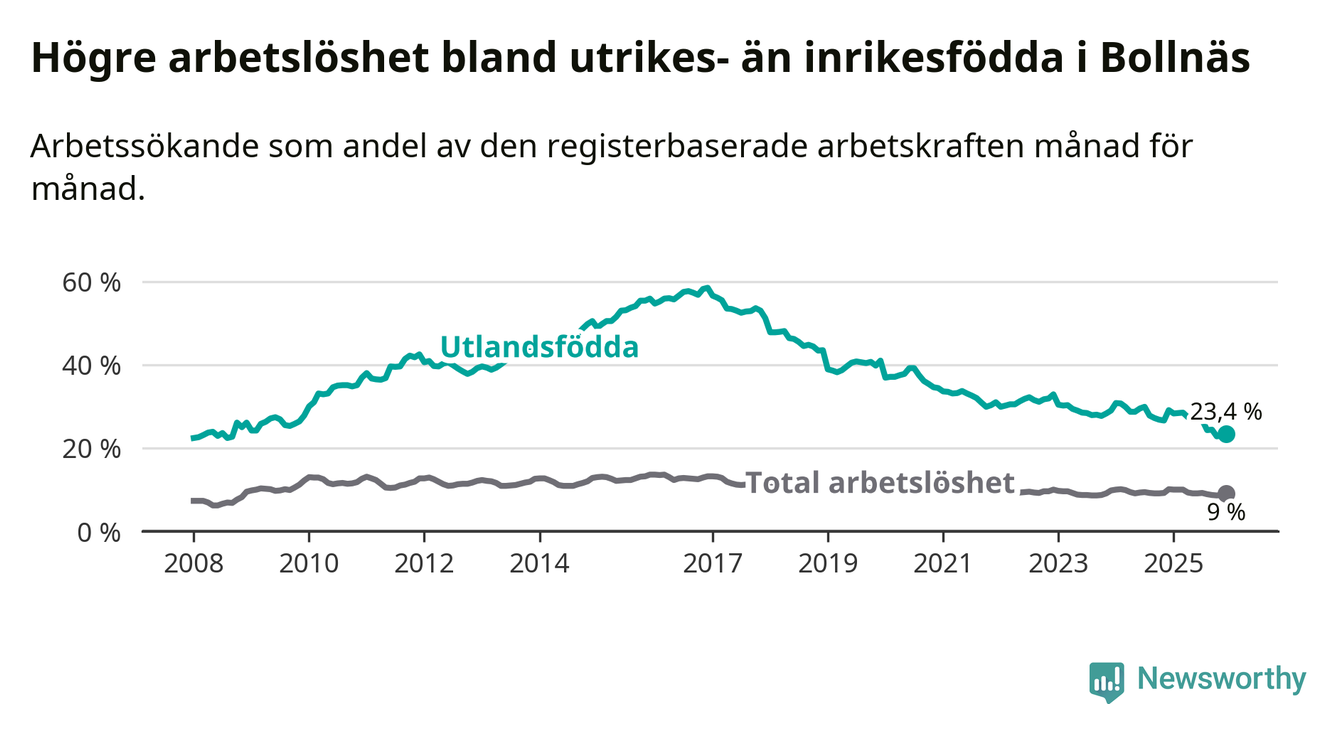 Arbetslösheten bland utlandsfödda var 23,4 procent i Bollnäs under december månad, motsvarande 425 av 1 816 personer. Det är 5,7 procentenheter färre än vid samma tidpunkt i fjol (−107 om man räknar personer). Därmed är de utlandsföddas arbetslöshet lägre än vid samma tidpunkt i fjol för tolfte månaden i följd. Sedan december 2024 har arbetslösheten bland utlandsfödda minskat från 29,1 till 23,4 procent.