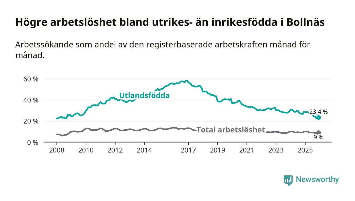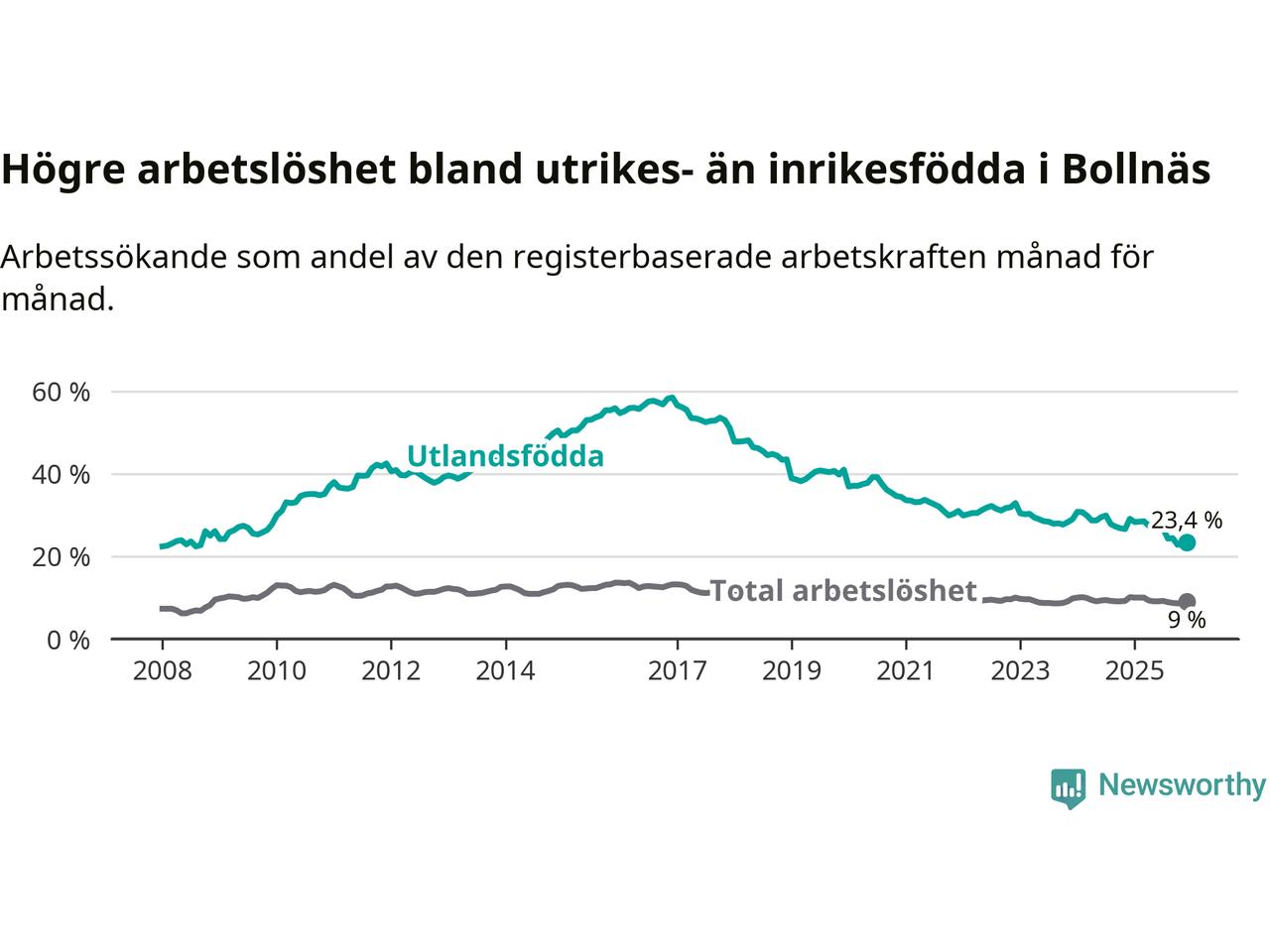 Skillnaden i arbetslöshet mellan utrikesfödda och hela befolkningen är 14,4 procentenheter i Bollnäs. Det är en betydligt mindre skillnad än för ett år sedan (−4,6 procentenheter).