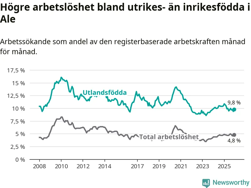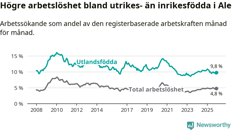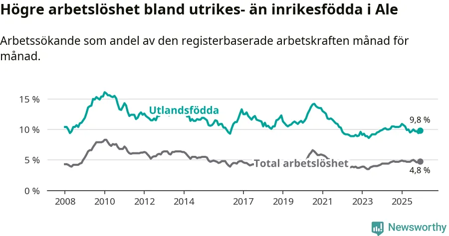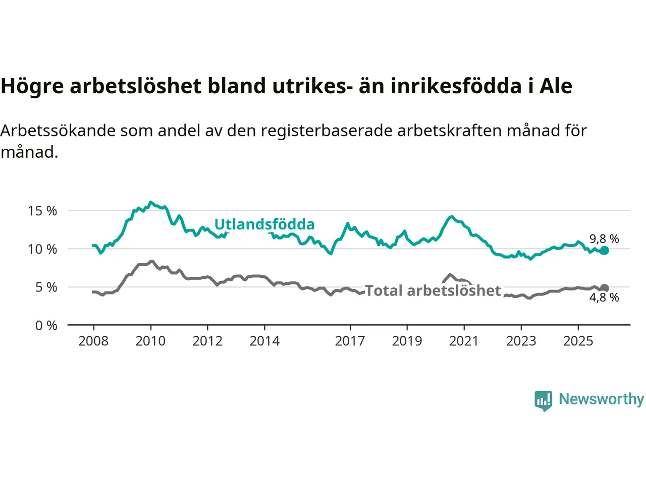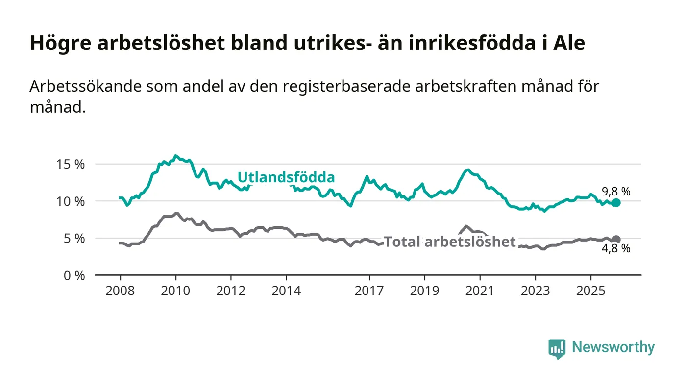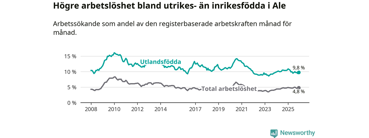 Skillnaden i arbetslöshet mellan utrikesfödda och hela befolkningen är 5,0 procentenheter i Ale. Det är en mindre skillnad än för ett år sedan (−0,7 procentenheter).