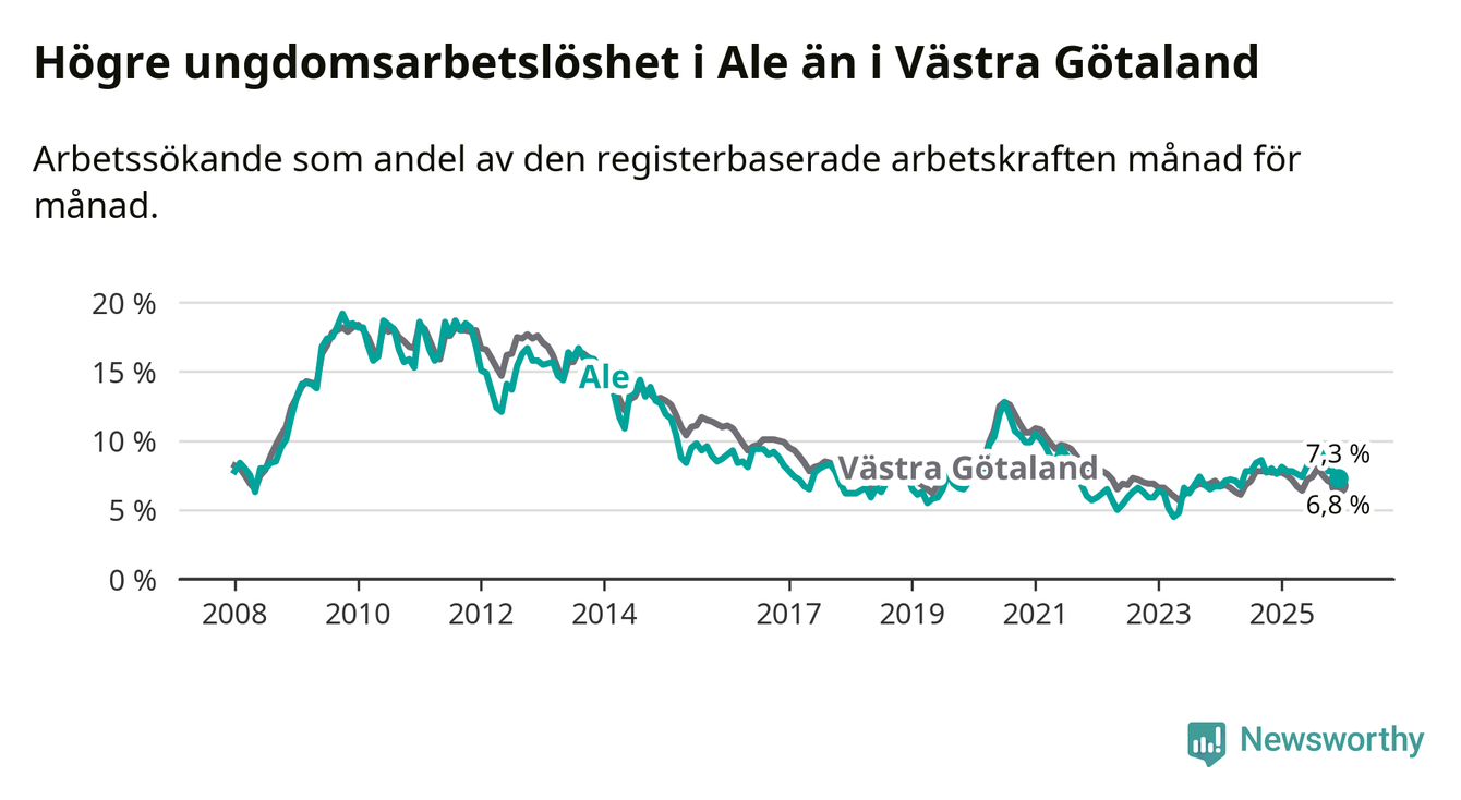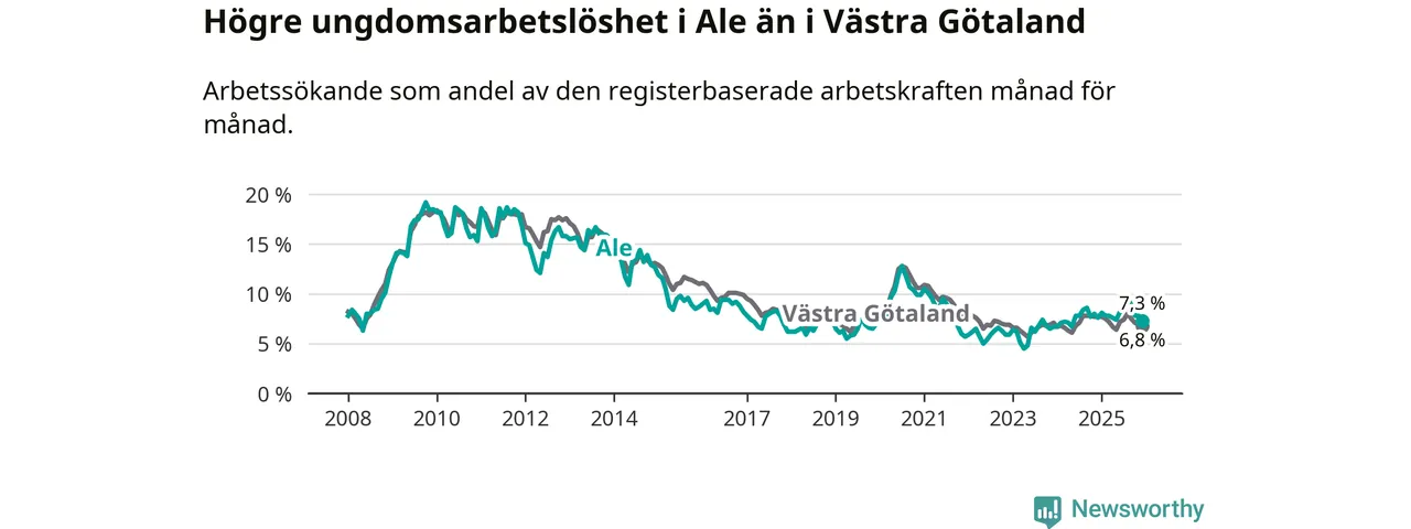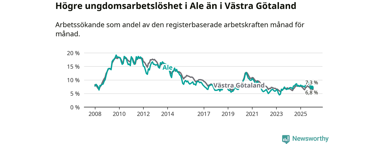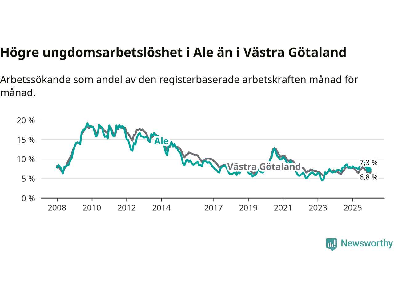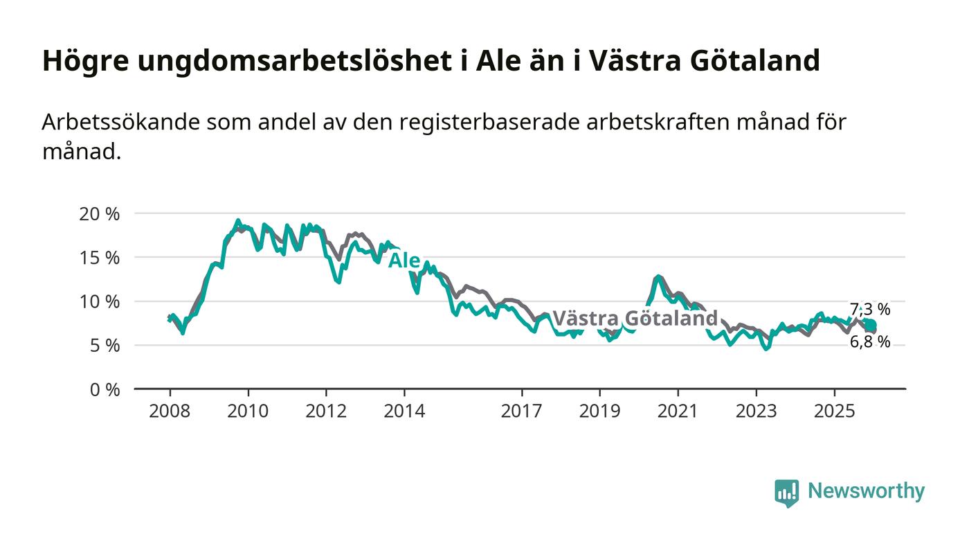 Medan Ale har lägre total arbetslöshet än Västra Götaland, ligger ungdomsarbetslösheten 0,5 procentenheter högre i Ale.