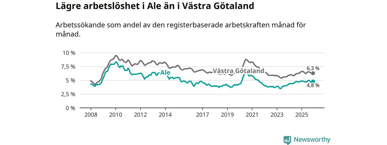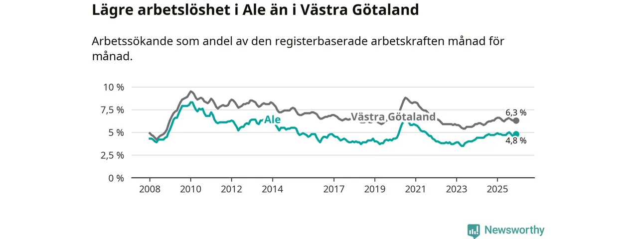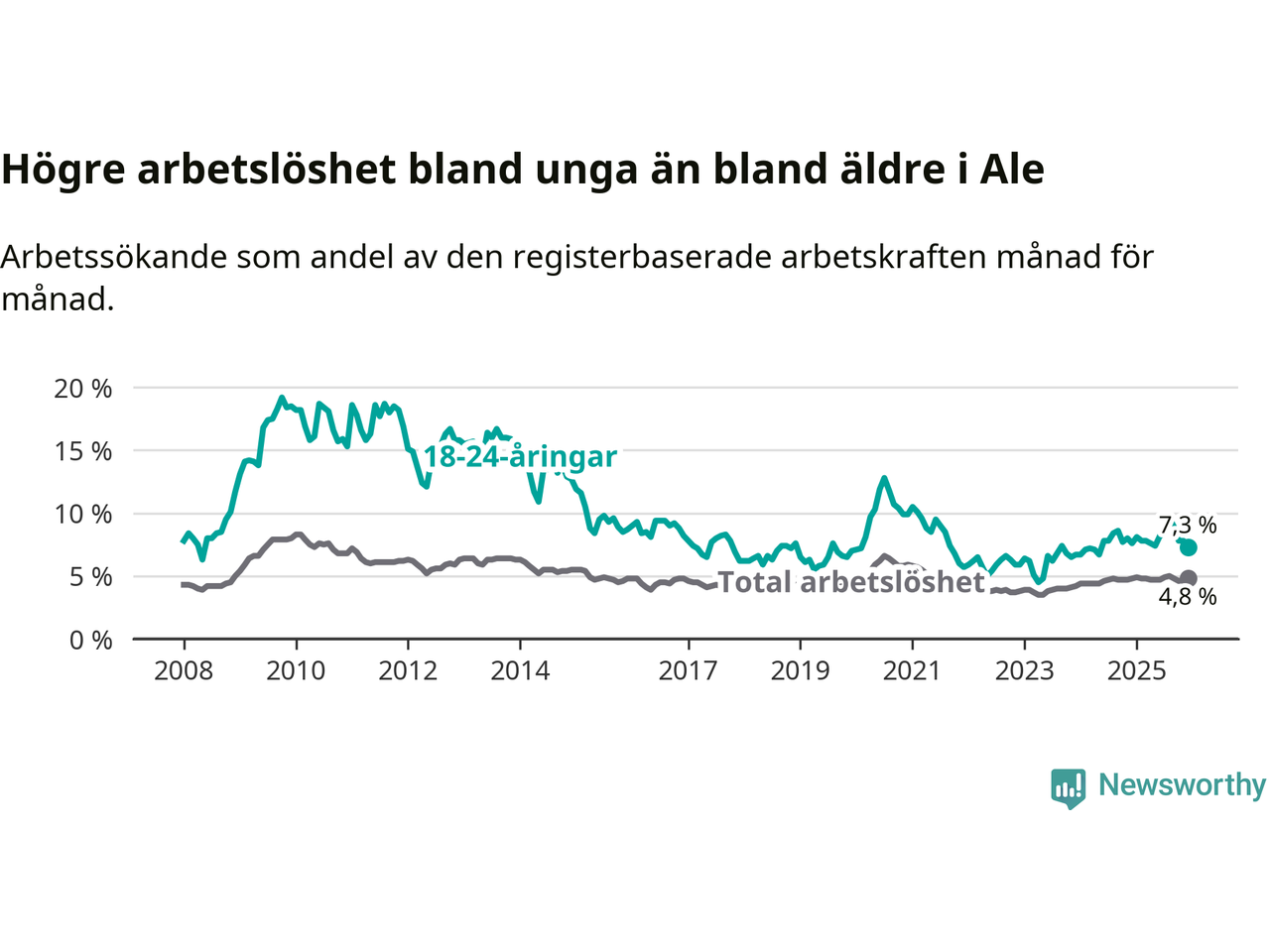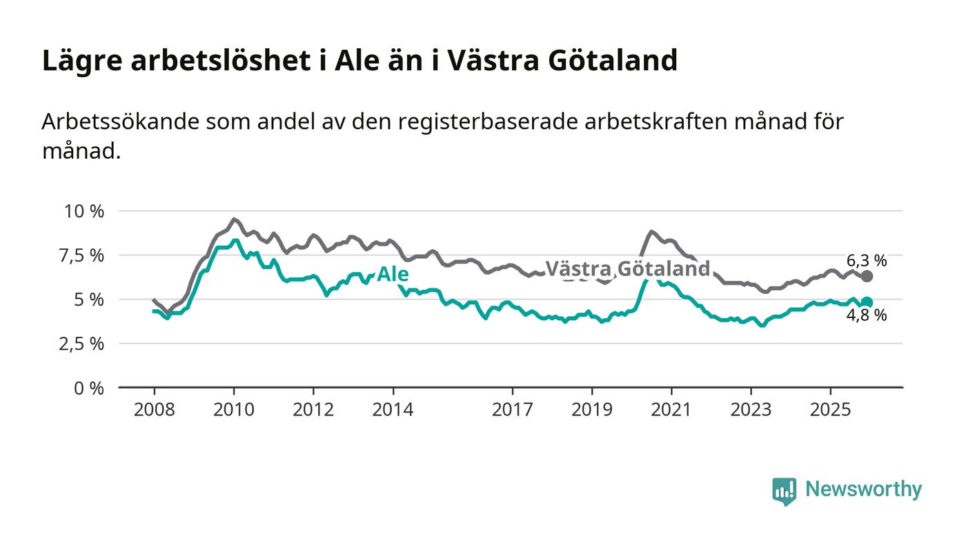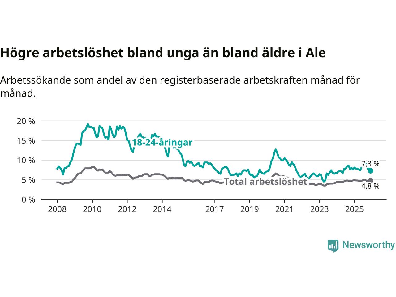 Medan Ale har lägre total arbetslöshet än Västra Götaland, ligger ungdomsarbetslösheten 0,5 procentenheter högre i Ale.