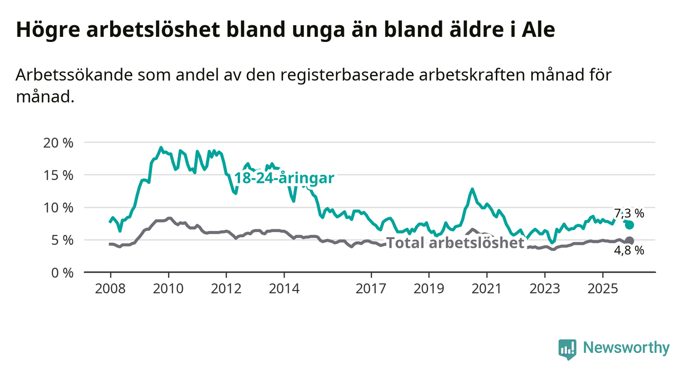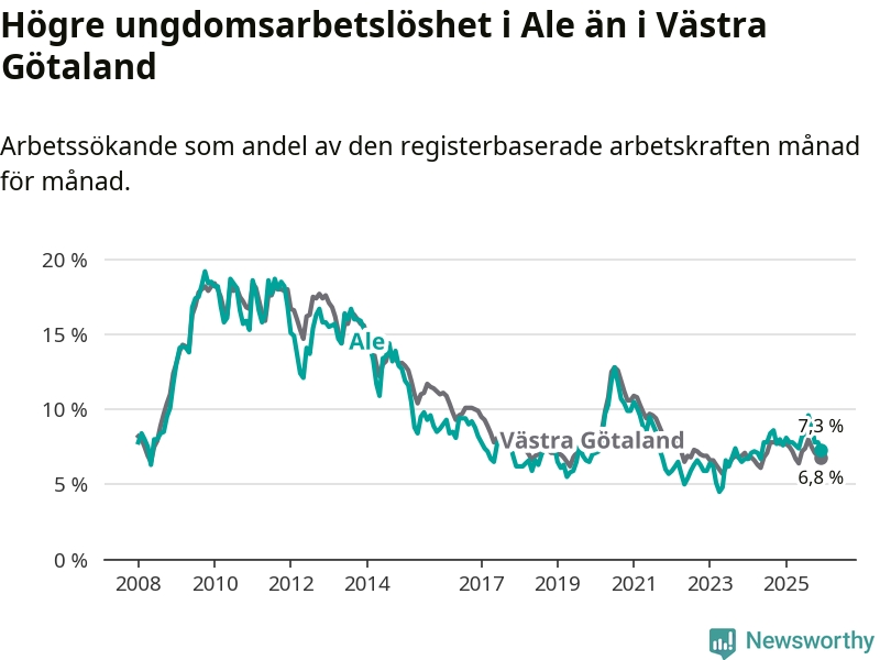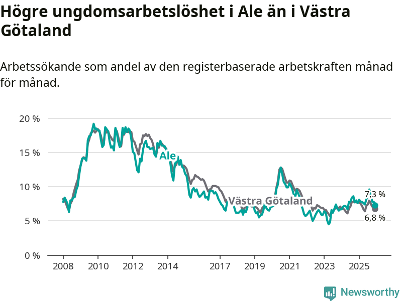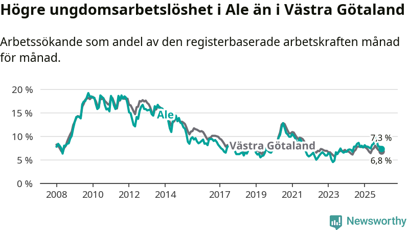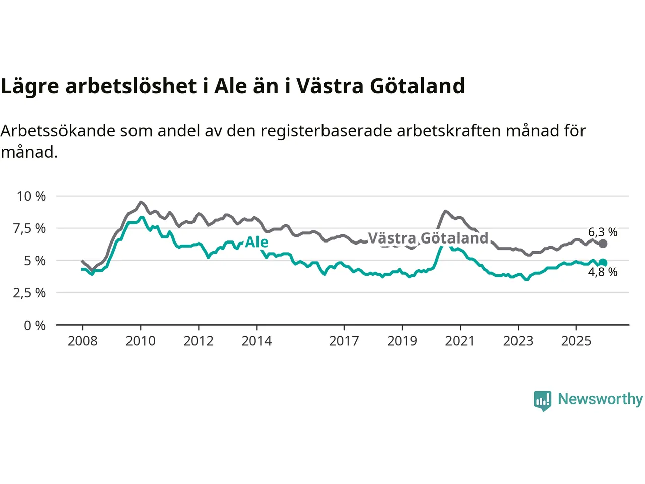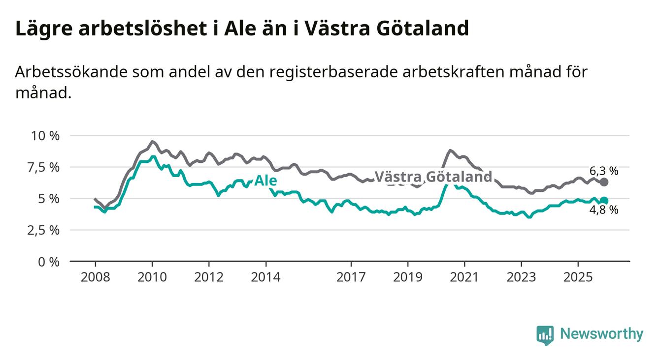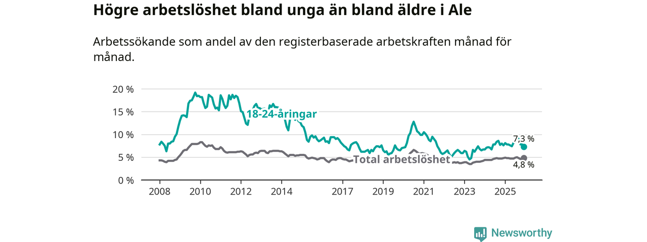 Medan Ale har lägre total arbetslöshet än Västra Götaland, ligger ungdomsarbetslösheten 0,5 procentenheter högre i Ale.