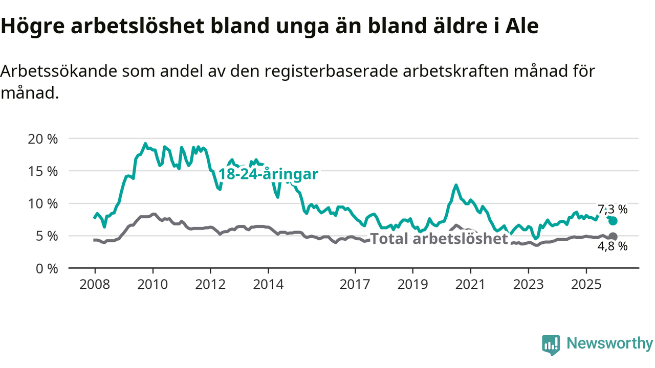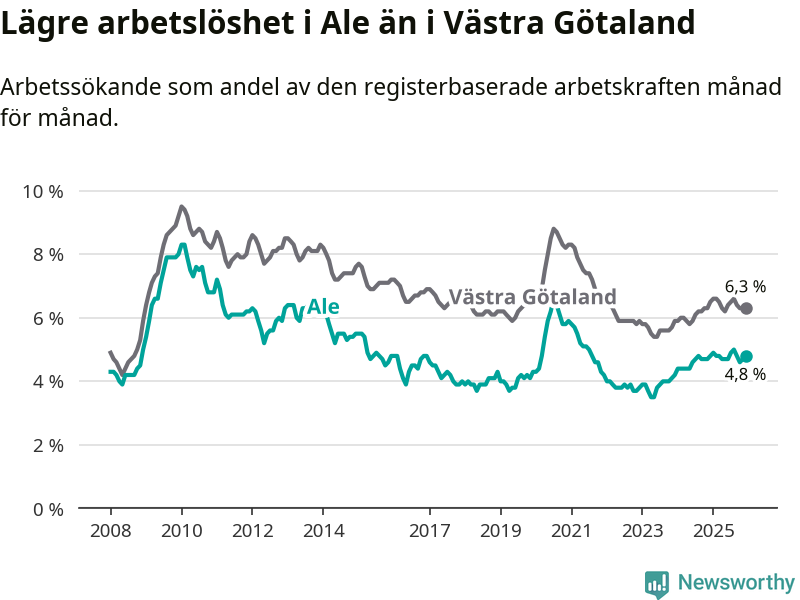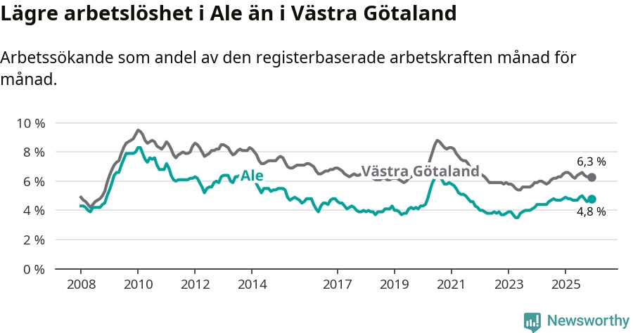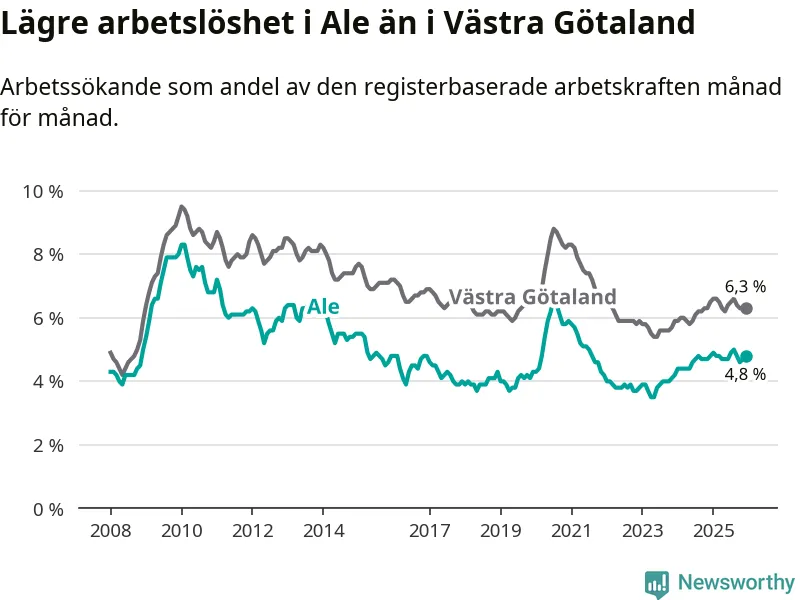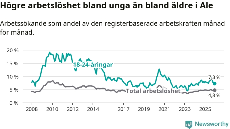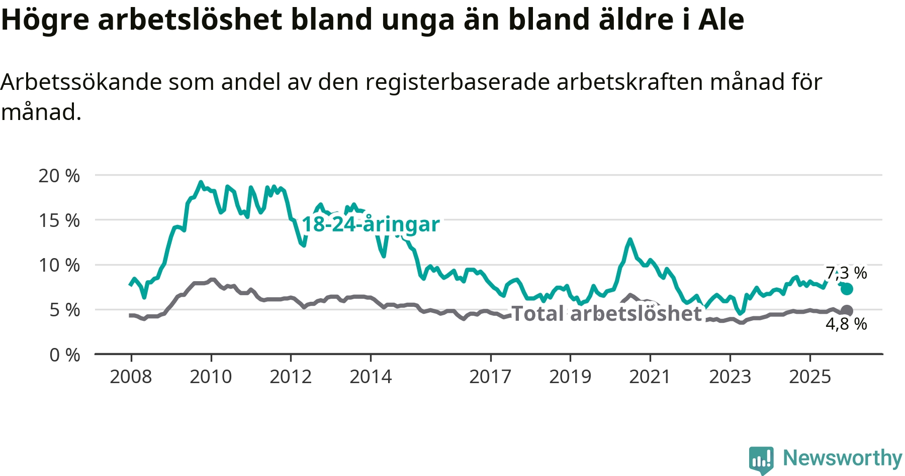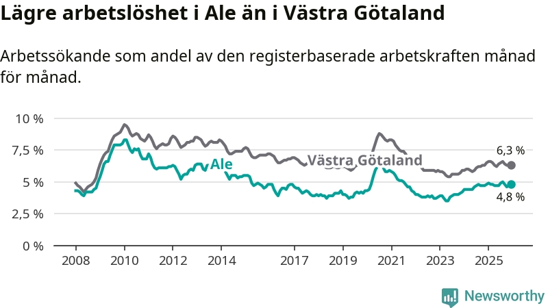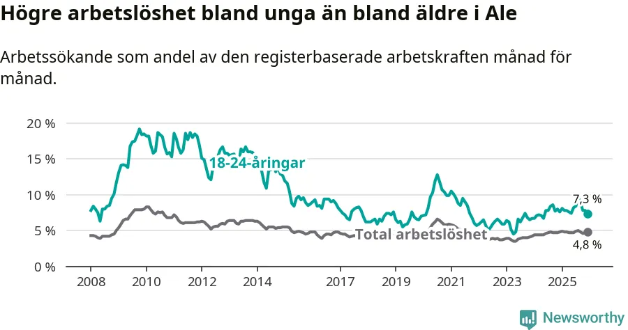 Medan Ale har lägre total arbetslöshet än Västra Götaland, ligger ungdomsarbetslösheten 0,5 procentenheter högre i Ale.