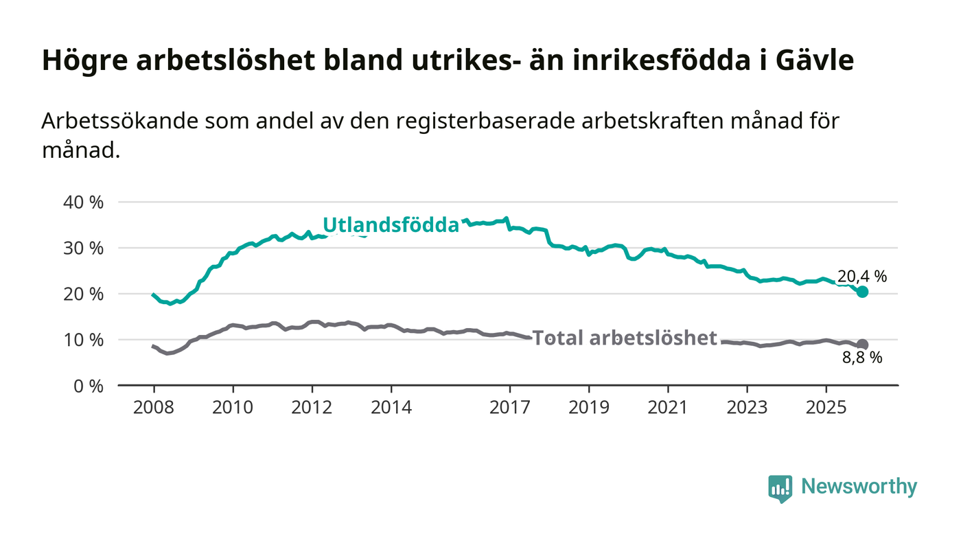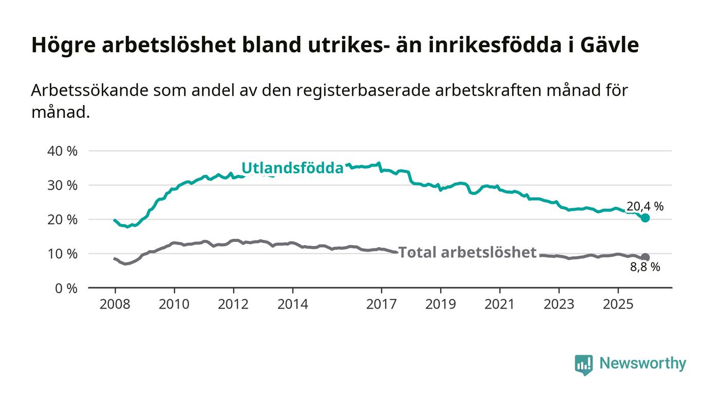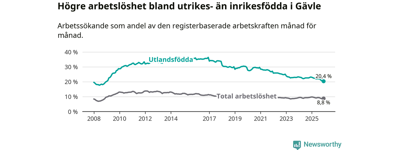 Arbetslösheten bland utlandsfödda var 20,4 procent i Gävle under december månad, motsvarande 2 265 av 11 103 personer. Det är 2,8 procentenheter färre än vid samma tidpunkt i fjol (−239 om man räknar personer). Därmed är de utlandsföddas arbetslöshet lägre än vid samma tidpunkt i fjol för åttonde månaden i följd. Sedan april 2025 har arbetslösheten bland utlandsfödda minskat från 22,4 till 20,4 procent. Den nuvarande arbetslöshetsnivån är den lägsta sedan januari 2009.