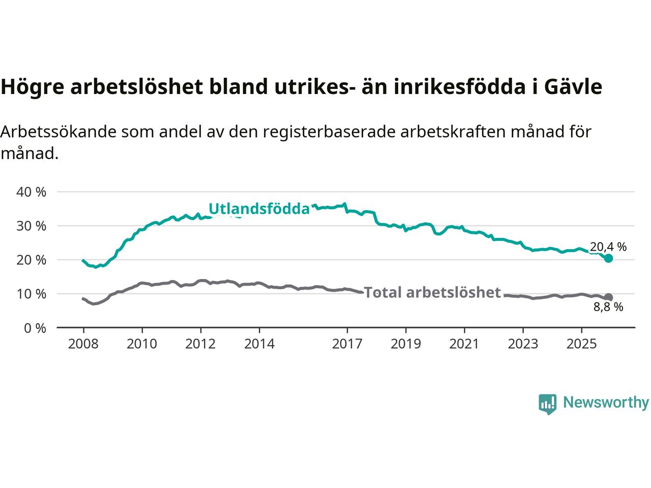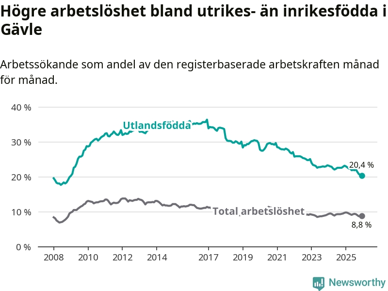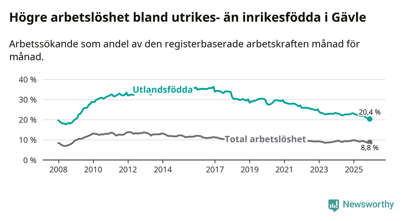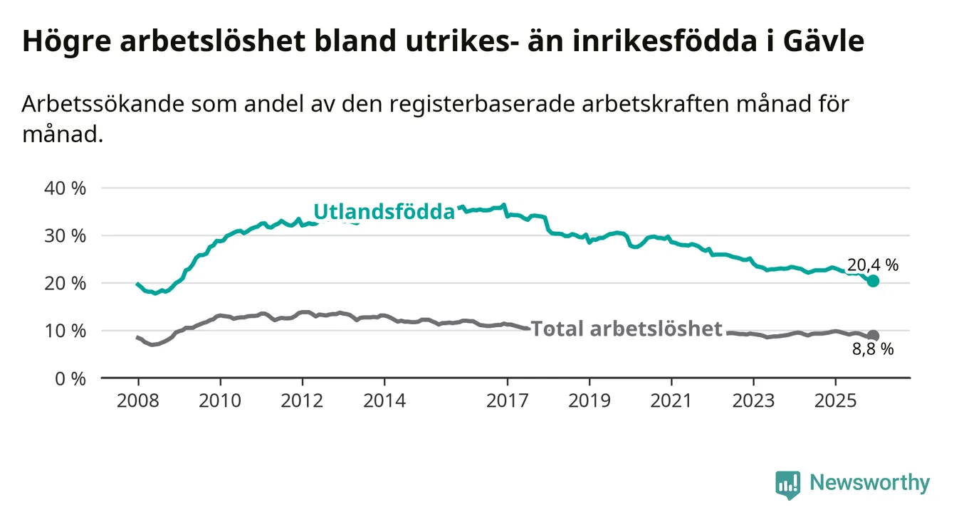 Arbetslösheten bland utlandsfödda var 20,4 procent i Gävle under december månad, motsvarande 2 265 av 11 103 personer. Det är 2,8 procentenheter färre än vid samma tidpunkt i fjol (−239 om man räknar personer). Därmed är de utlandsföddas arbetslöshet lägre än vid samma tidpunkt i fjol för åttonde månaden i följd. Sedan april 2025 har arbetslösheten bland utlandsfödda minskat från 22,4 till 20,4 procent. Den nuvarande arbetslöshetsnivån är den lägsta sedan januari 2009.