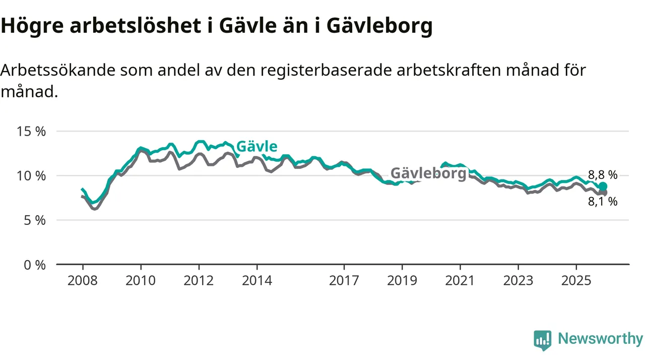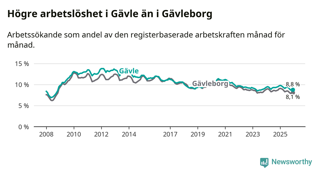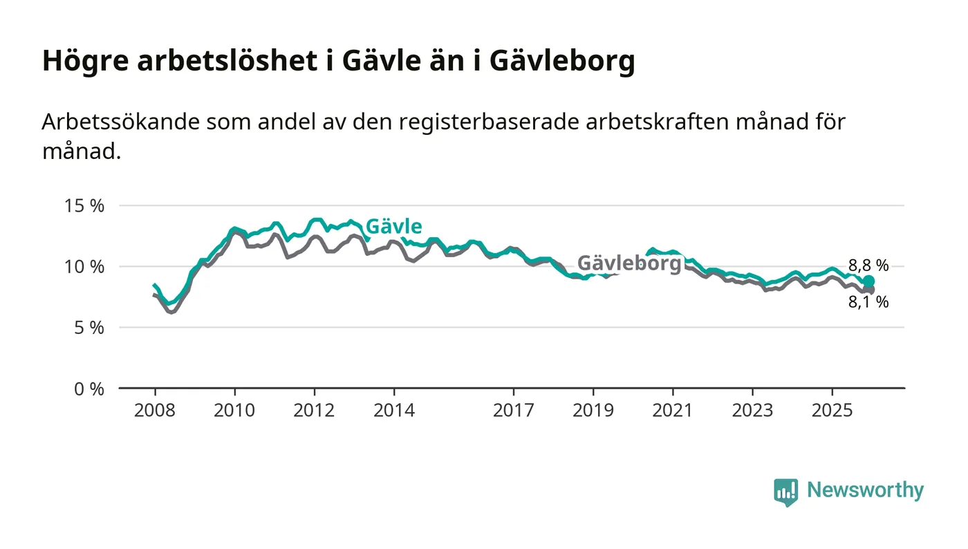 Även om arbetslösheten i Gävle alltså minskar, så ligger den fortfarande över snittet i hela Gävleborgs län (8,8 procent i kommunen, jämfört med 8,1 procent i hela länet). Hudiksvall har den lägsta arbetslösheten i länet (6,0 procent), medan Söderhamn har den högsta (9,1 procent). För att Gävle skulle komma ner i samma arbetslöshetsnivå som Hudiksvall skulle 1 482 personer behöva sysselsättas.