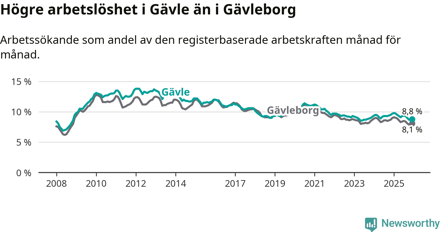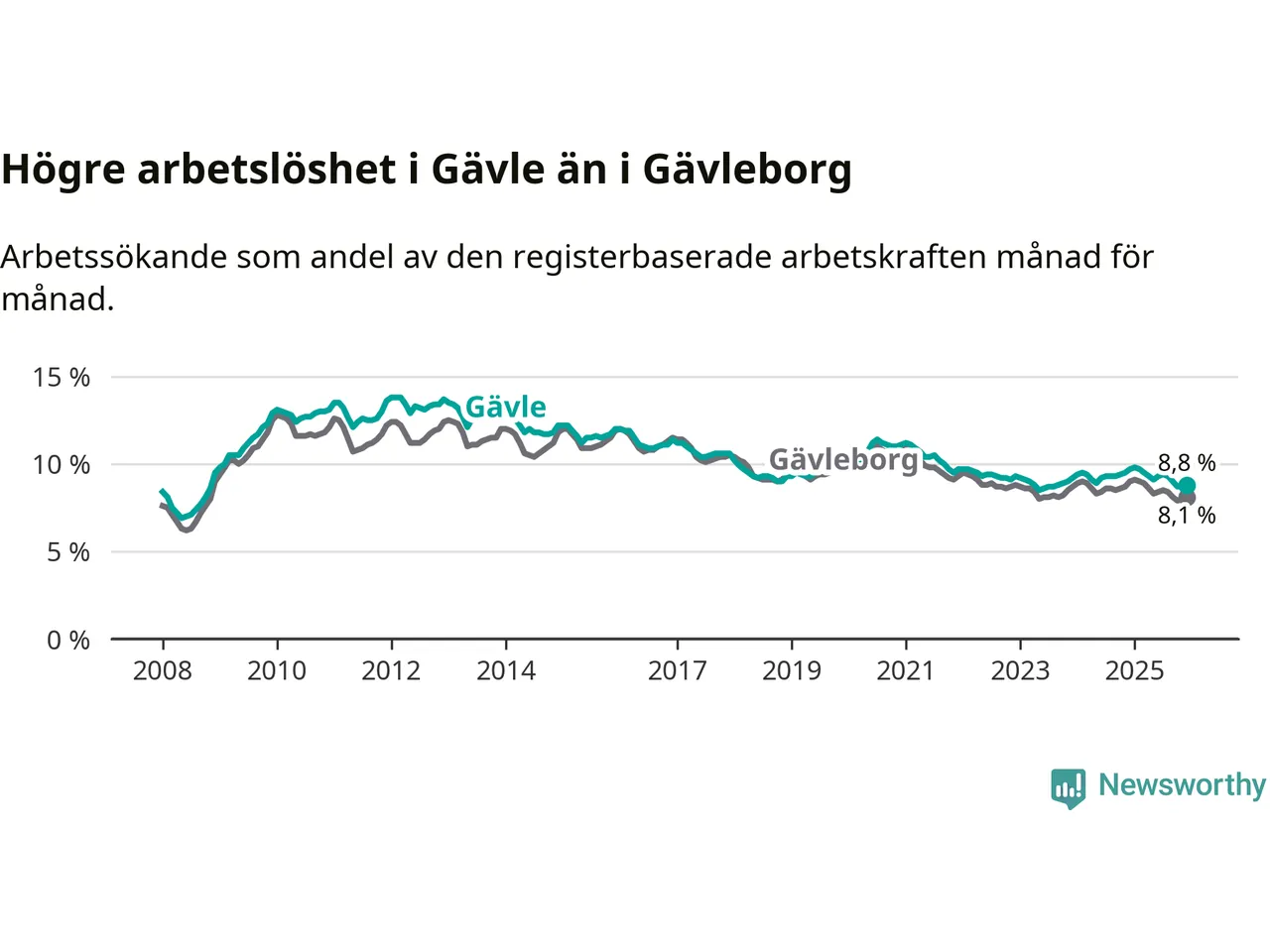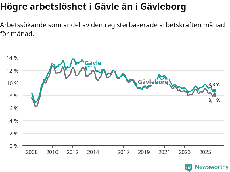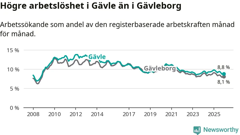 Även om arbetslösheten i Gävle alltså minskar, så ligger den fortfarande över snittet i hela Gävleborgs län (8,8 procent i kommunen, jämfört med 8,1 procent i hela länet). Hudiksvall har den lägsta arbetslösheten i länet (6,0 procent), medan Söderhamn har den högsta (9,1 procent). För att Gävle skulle komma ner i samma arbetslöshetsnivå som Hudiksvall skulle 1 482 personer behöva sysselsättas.
