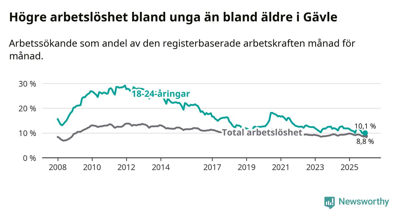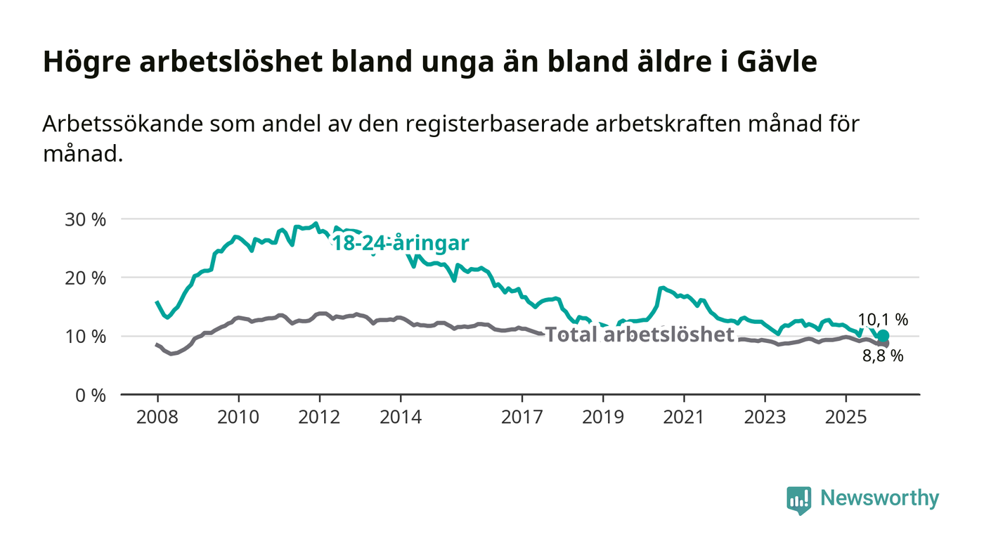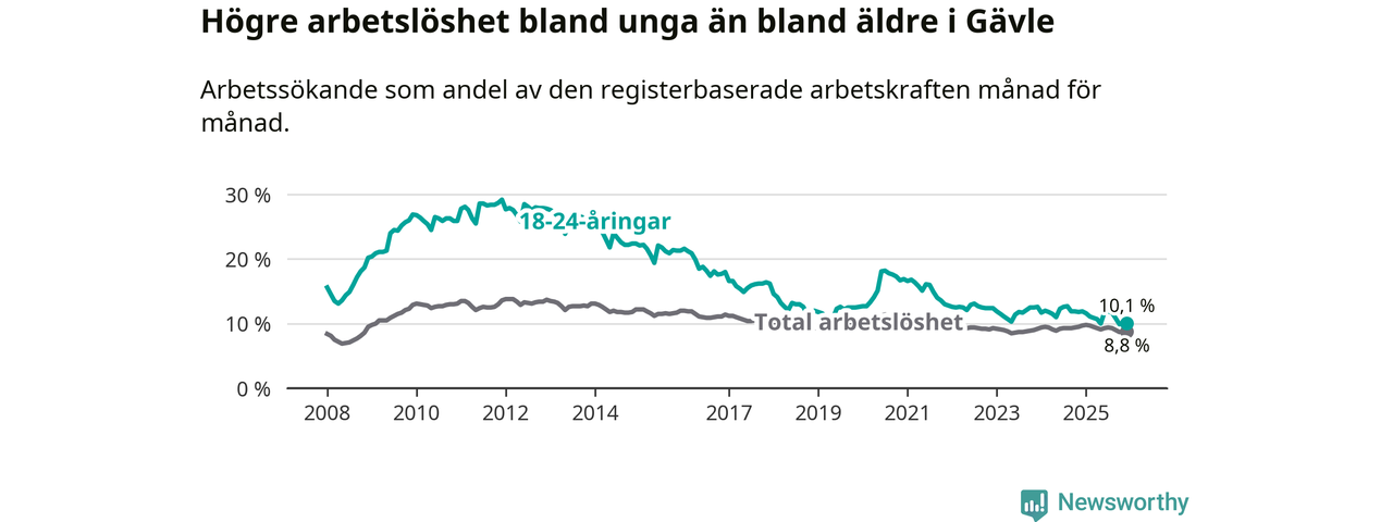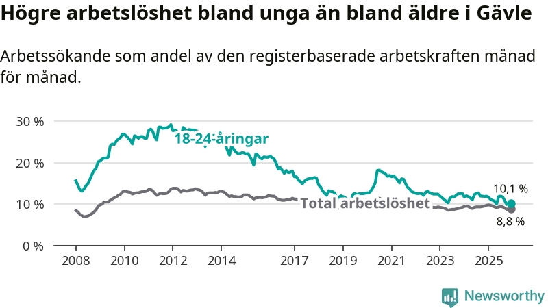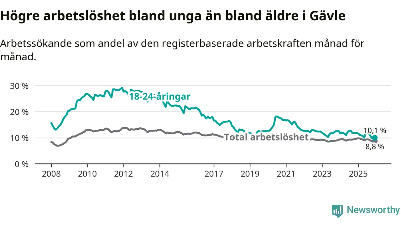 I och med den senaste månadens nedgång har de ungas arbetslöshet i Gävle sjunkit 16 månader i följd (ner från 12,7 procent i augusti 2024 till 10,1 procent nu).