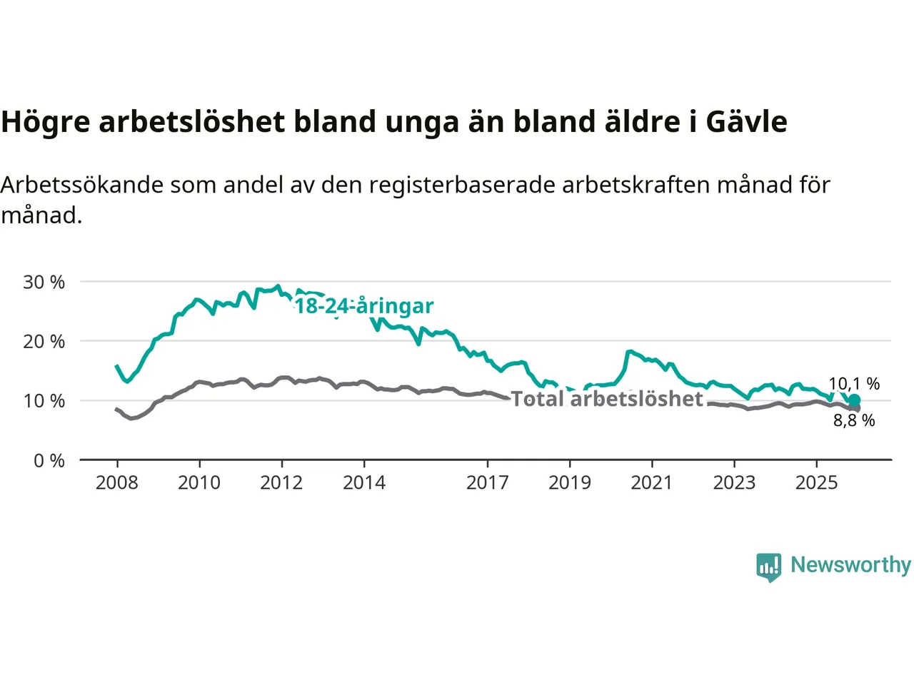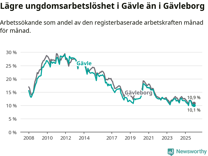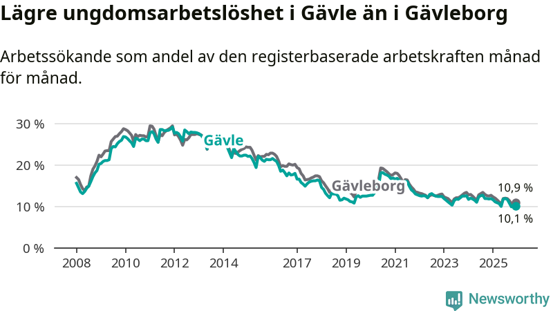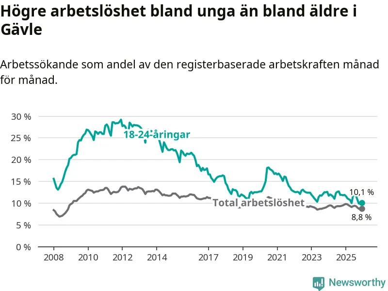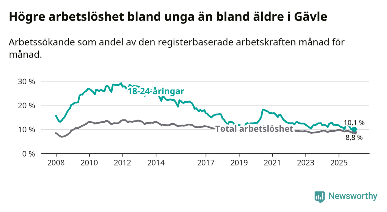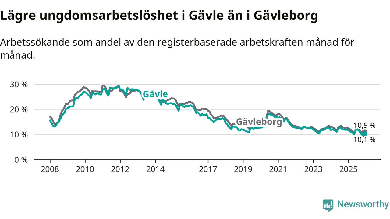 I och med den senaste månadens nedgång har de ungas arbetslöshet i Gävle sjunkit 16 månader i följd (ner från 12,7 procent i augusti 2024 till 10,1 procent nu).