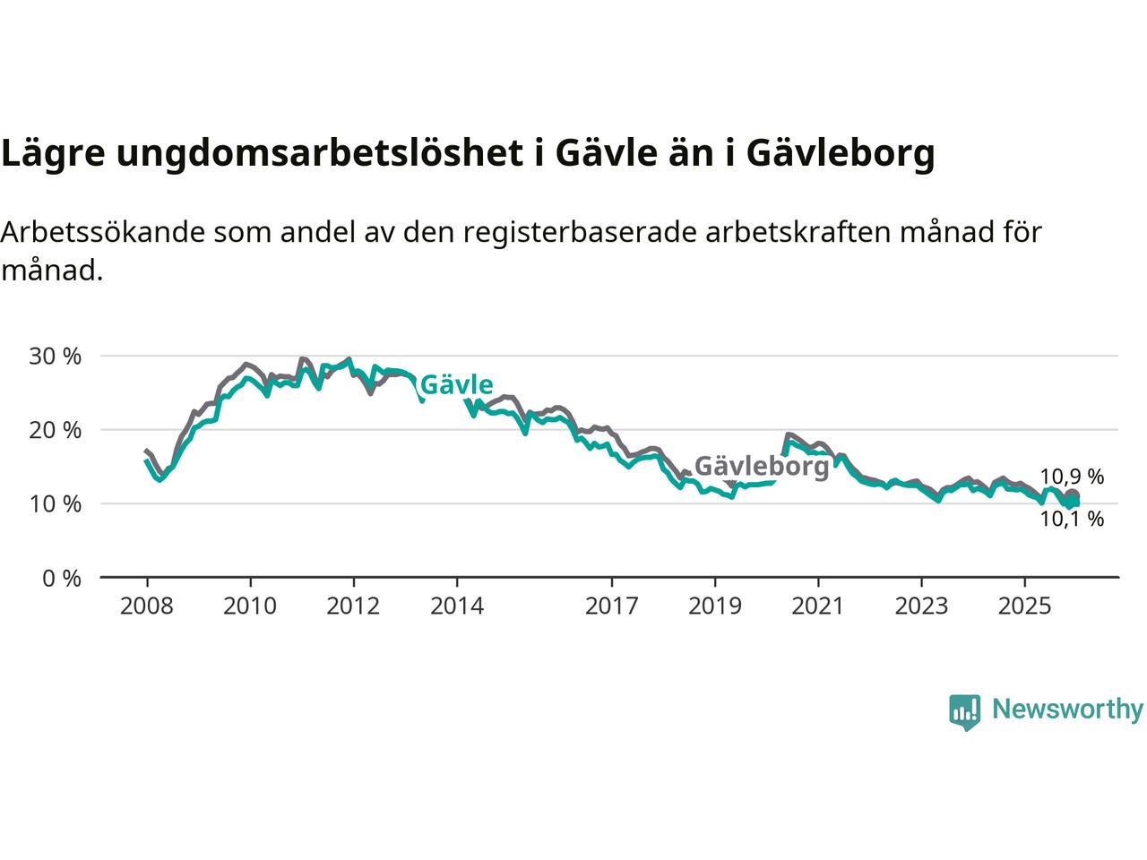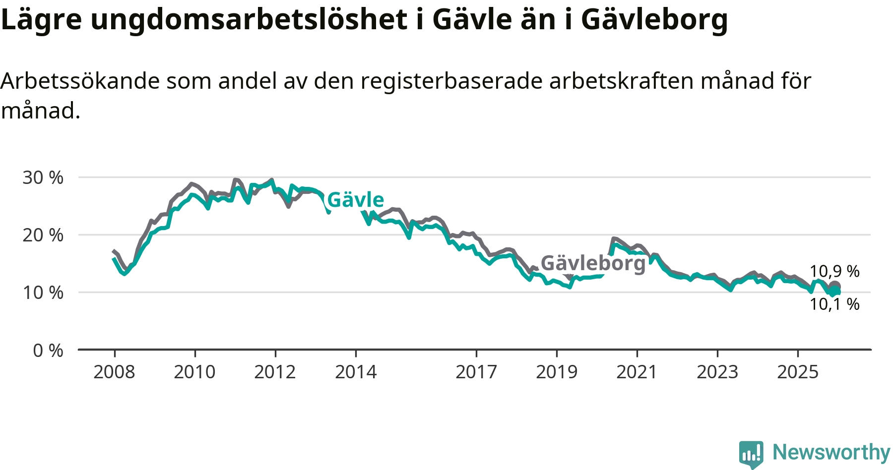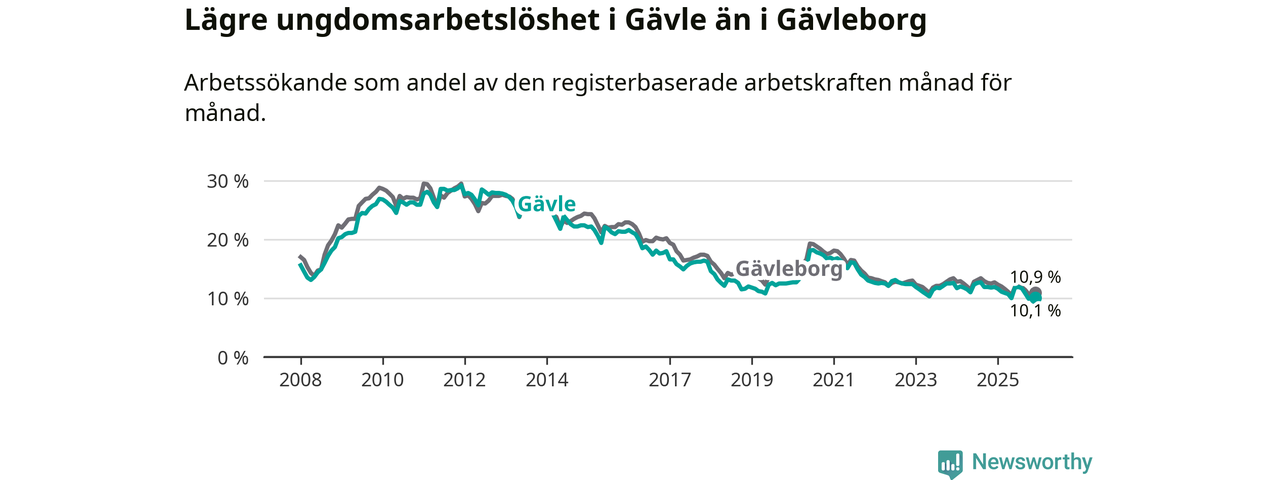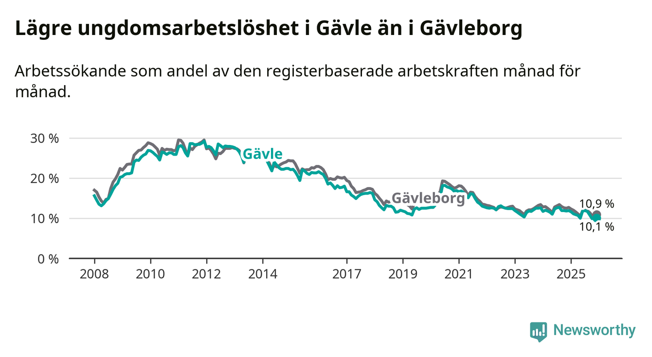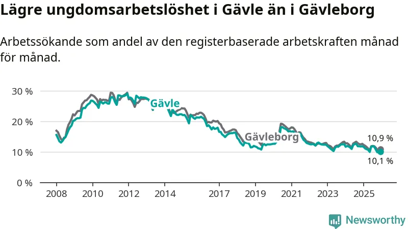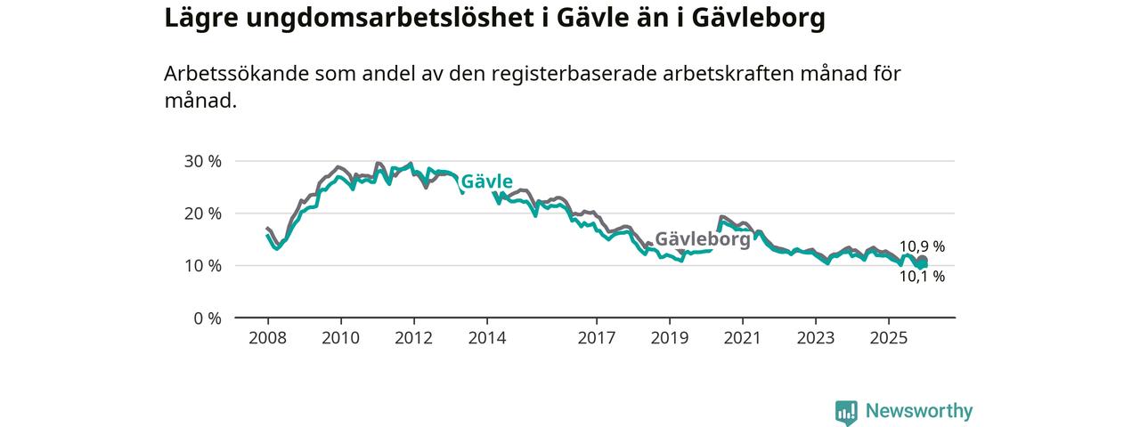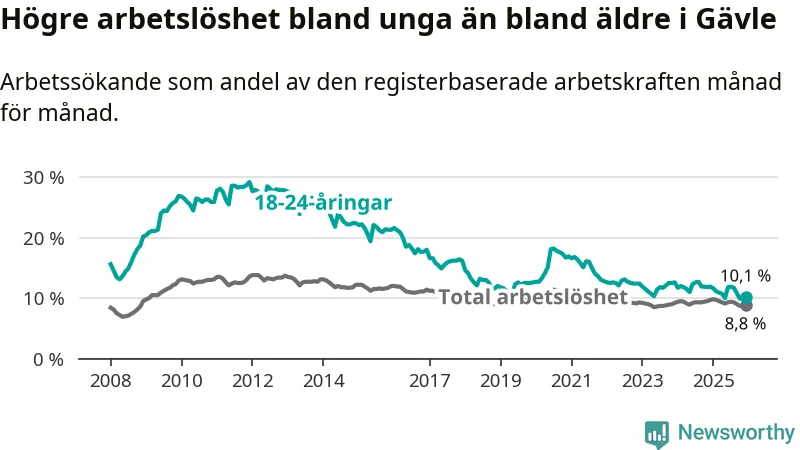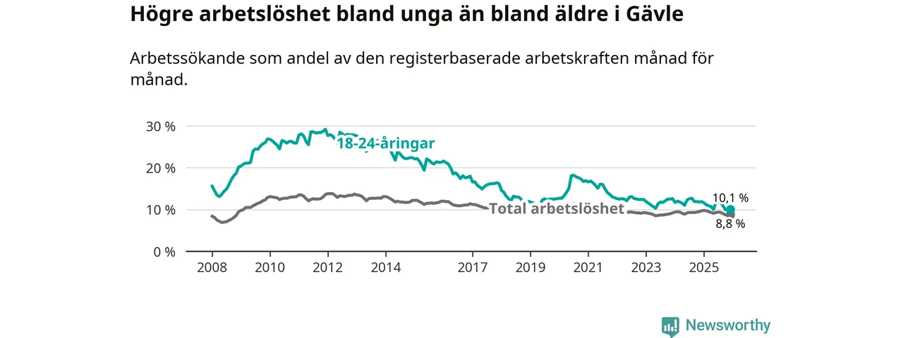 Medan Gävle har högre total arbetslöshet än Gävleborg, ligger ungdomsarbetslösheten 0,8 procentenheter lägre i Gävle.