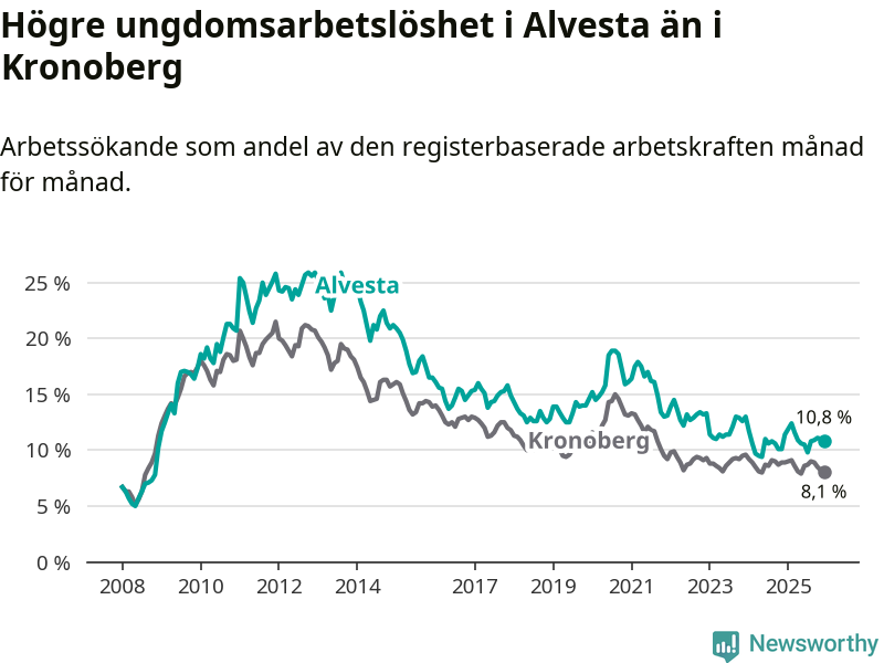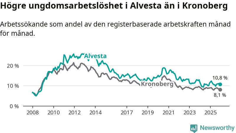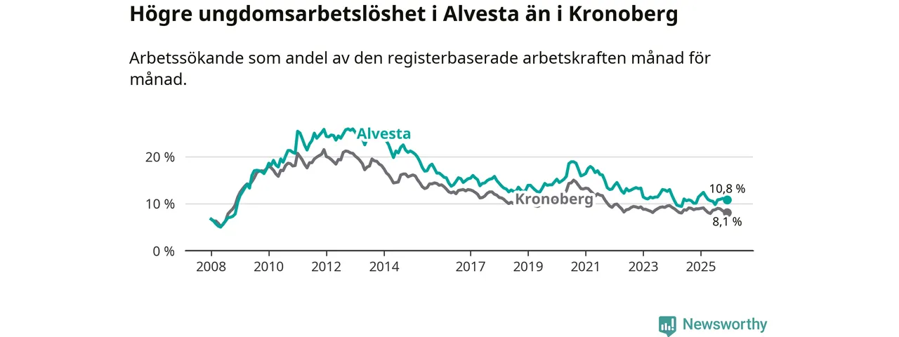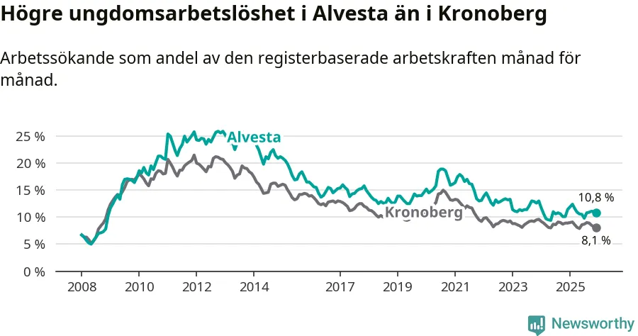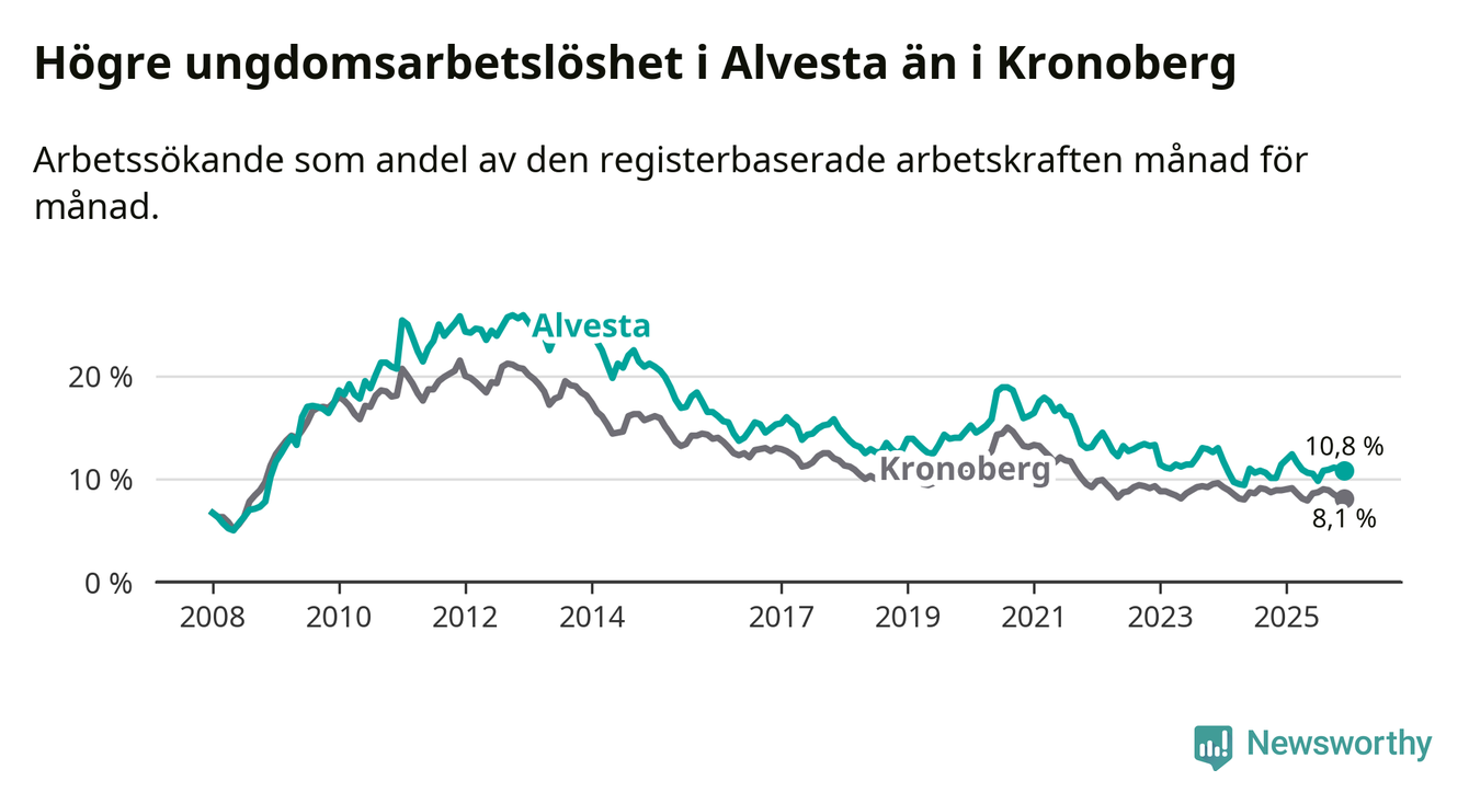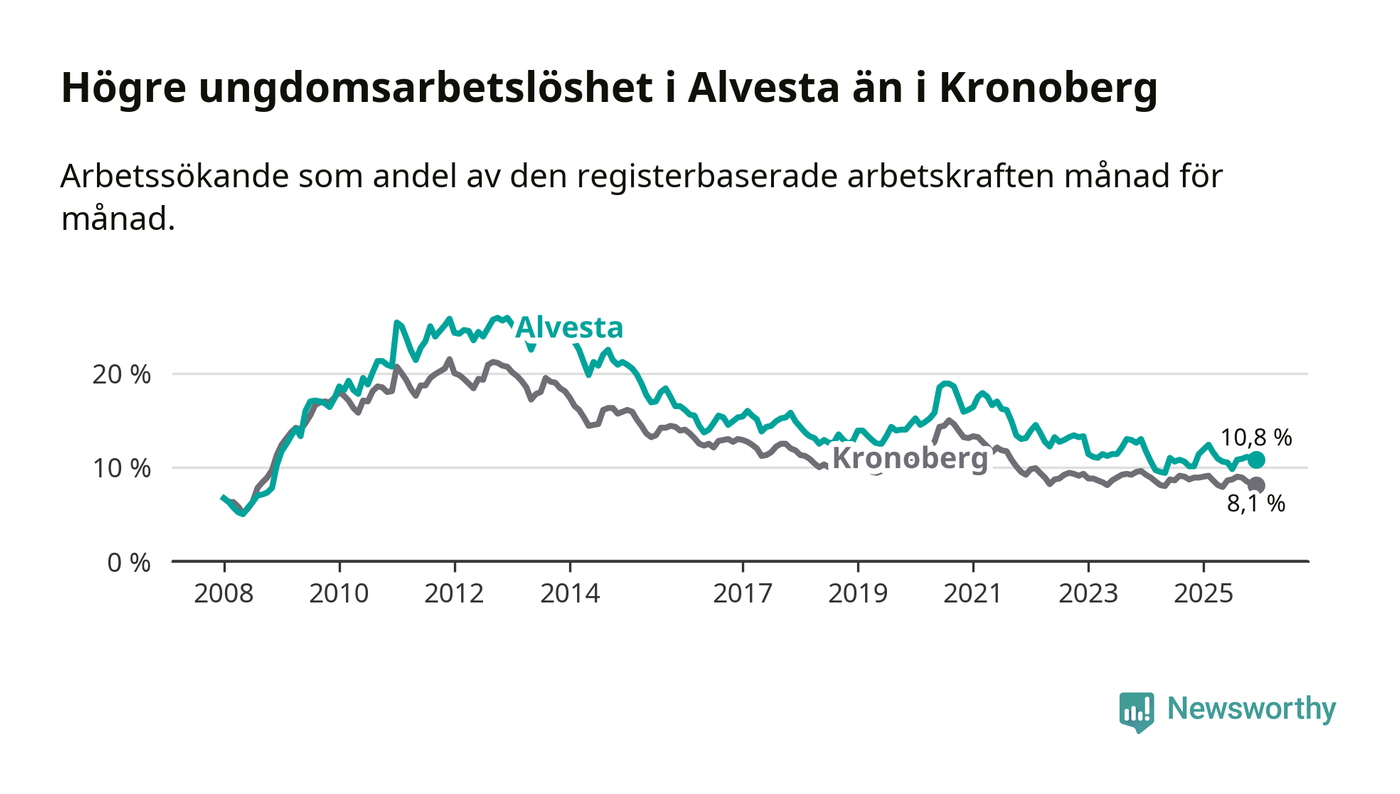 Precis som den totala arbetslösheten ligger ungdomsarbetslösheten i Alvesta högre än i Kronoberg som helhet. Skillnaden mellan kommunen och länet är 2,7 procentenheter.