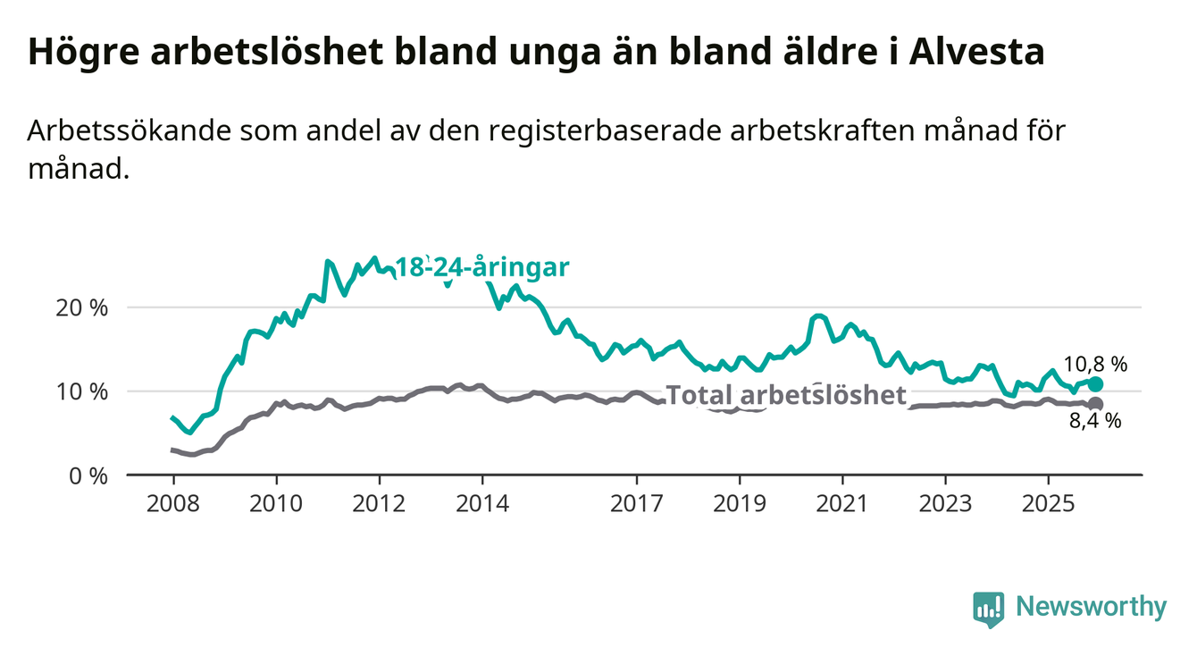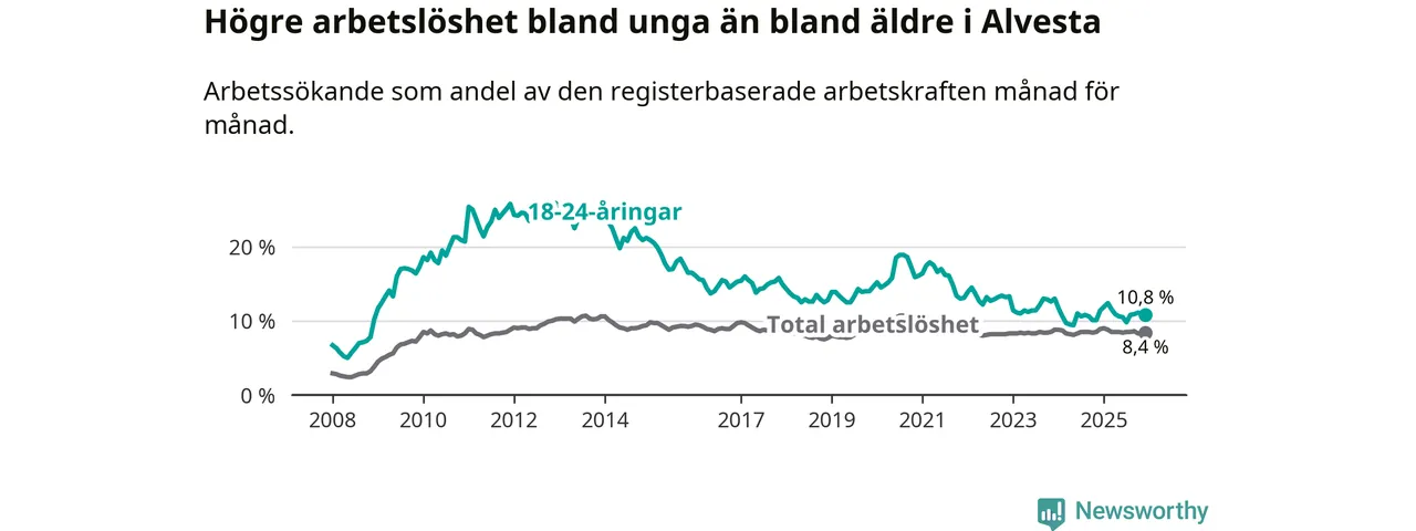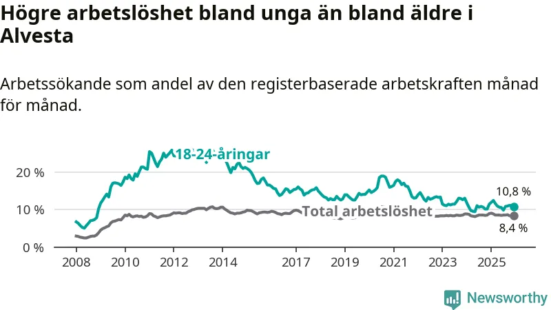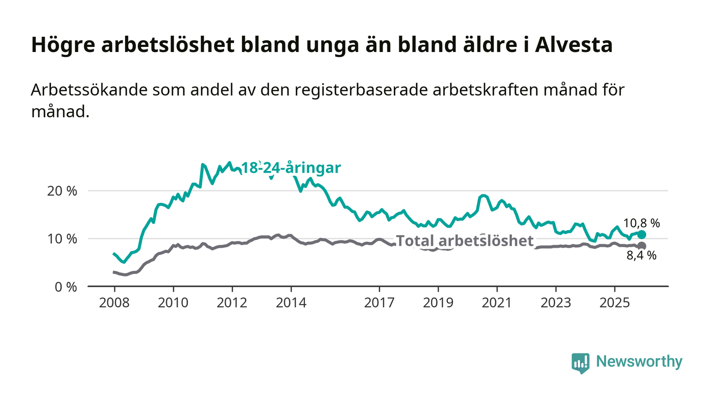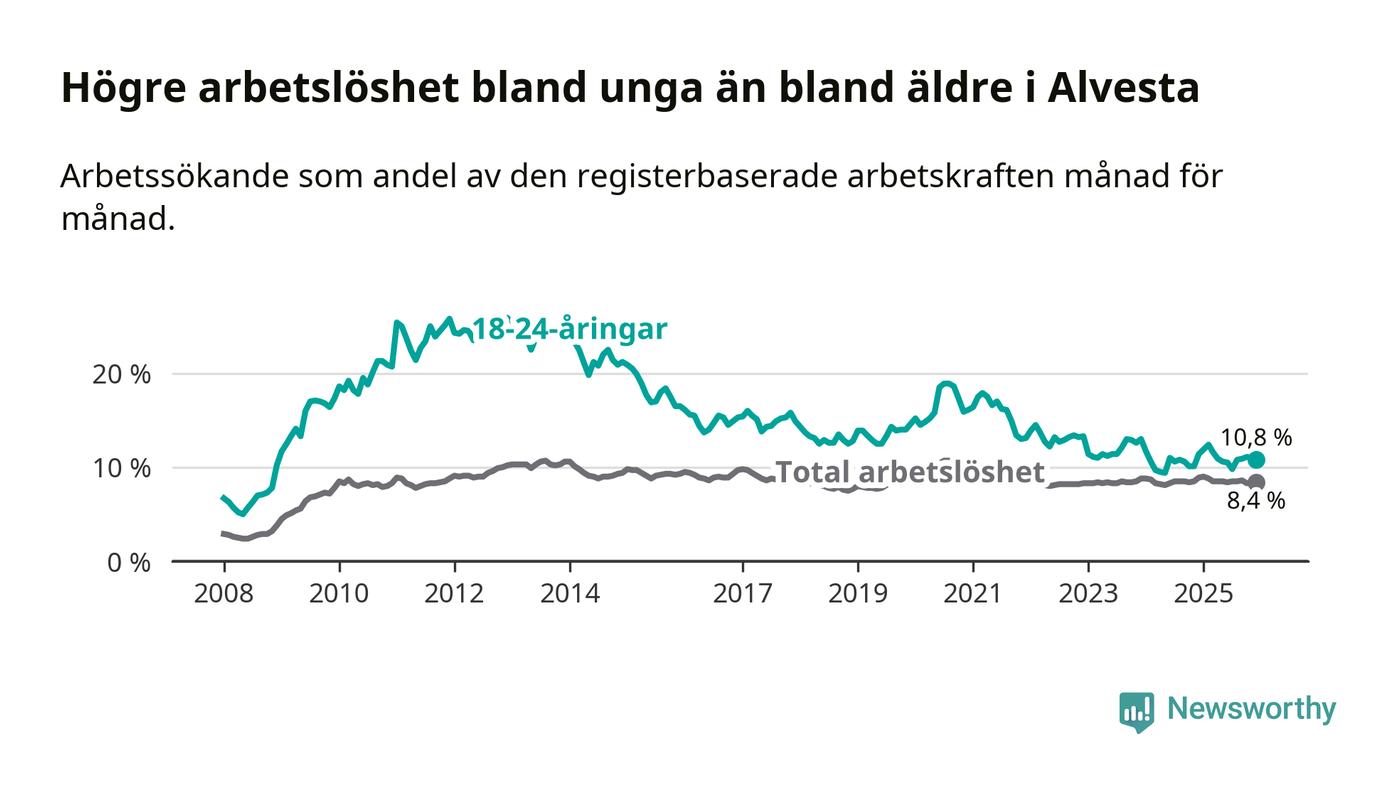 Precis som den totala arbetslösheten ligger ungdomsarbetslösheten i Alvesta högre än i Kronoberg som helhet. Skillnaden mellan kommunen och länet är 2,7 procentenheter.