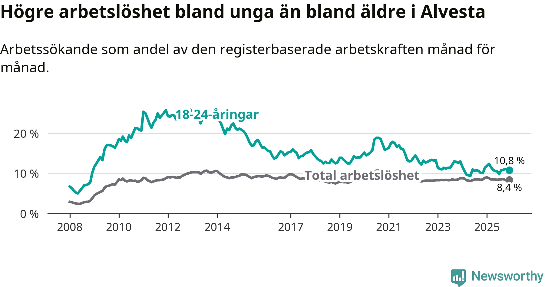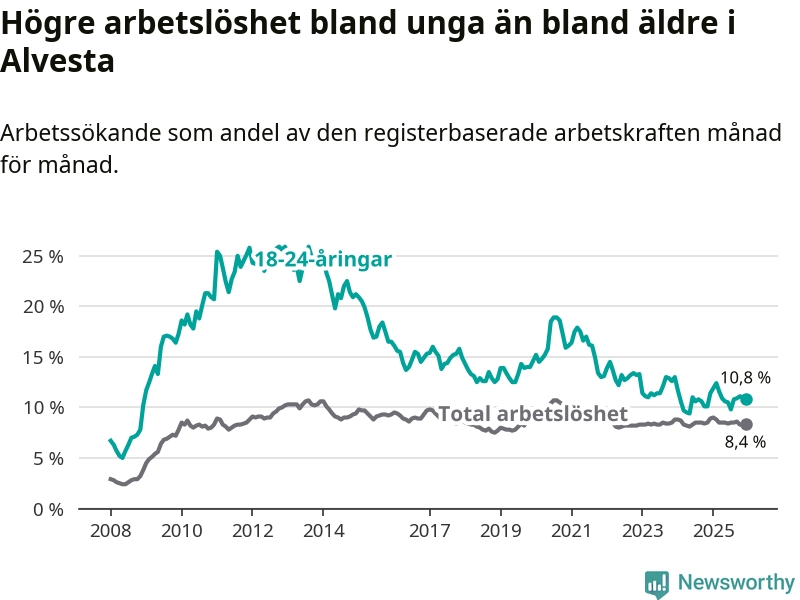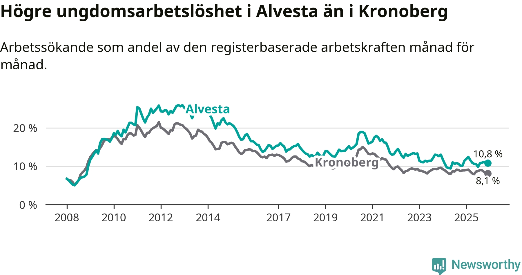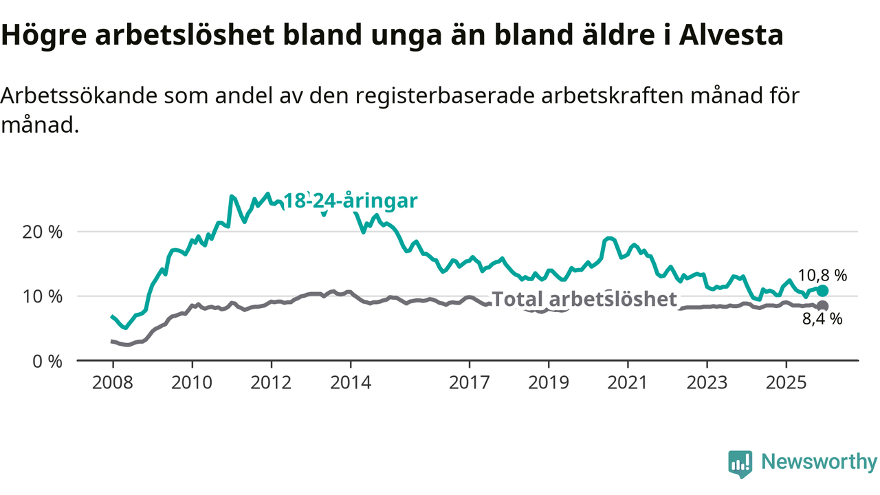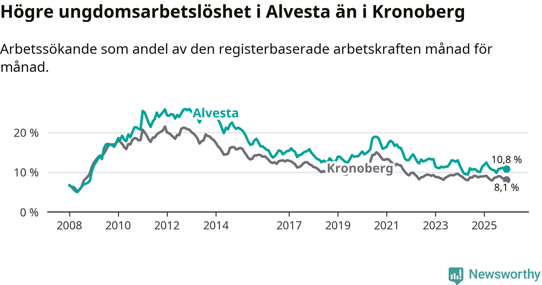 Precis som den totala arbetslösheten ligger ungdomsarbetslösheten i Alvesta högre än i Kronoberg som helhet. Skillnaden mellan kommunen och länet är 2,7 procentenheter.