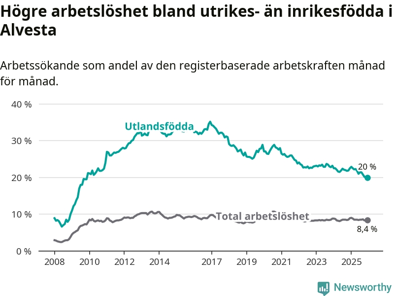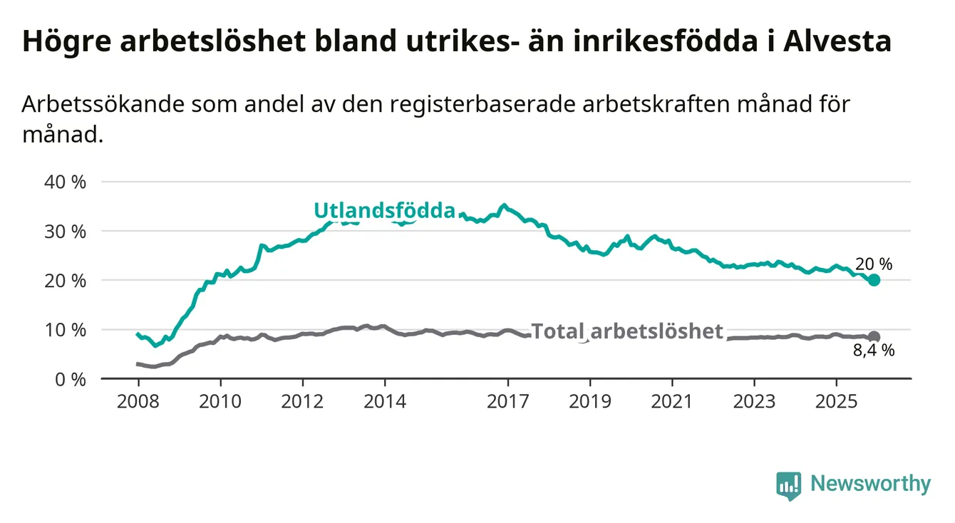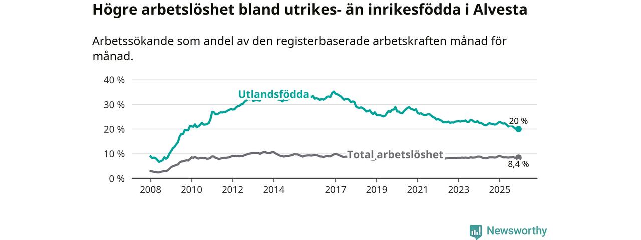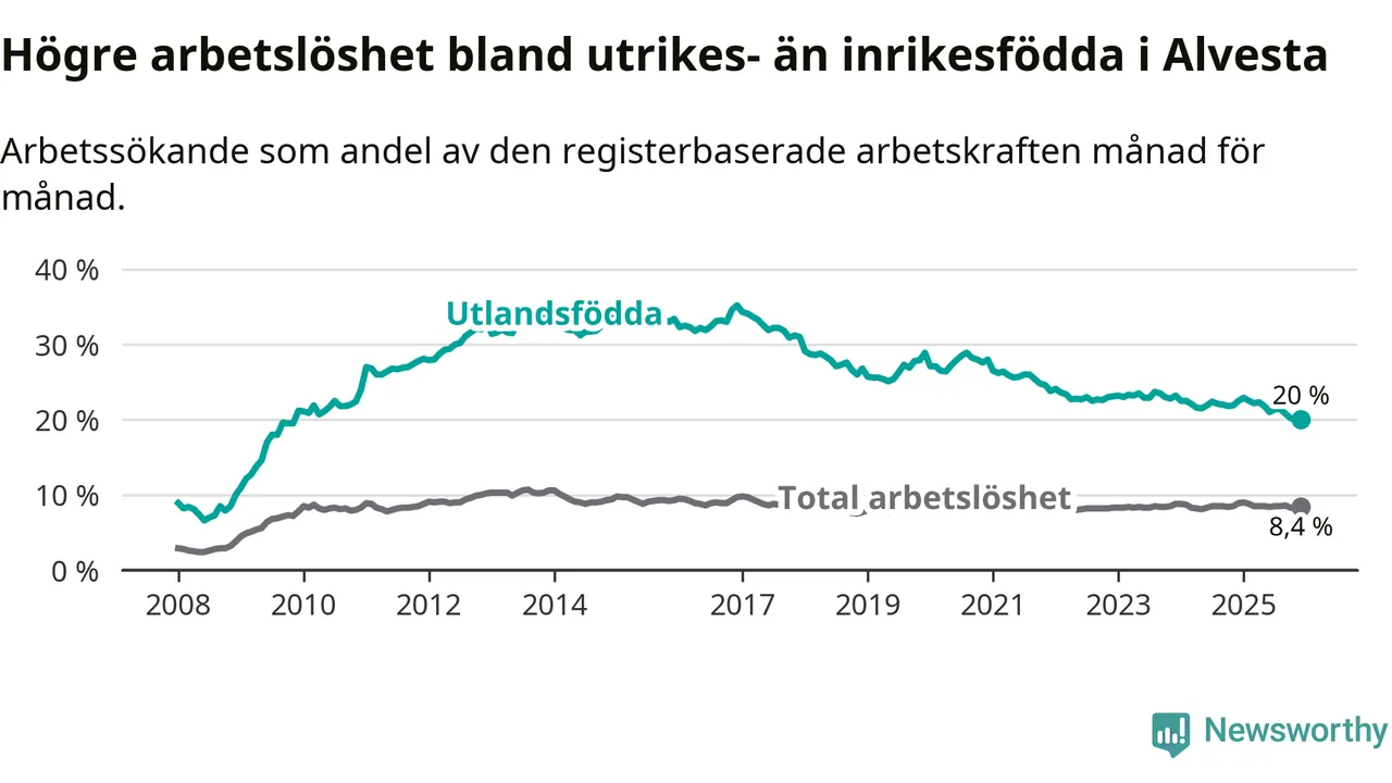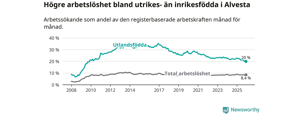 Arbetslösheten bland utlandsfödda var 20,0 procent i Alvesta under december månad, motsvarande 485 av 2 425 personer. Det är 2,5 procentenheter färre än vid samma tidpunkt i fjol (−63 om man räknar personer). Därmed är de utlandsföddas arbetslöshet lägre än vid samma tidpunkt i fjol för sjunde månaden i följd. Sedan maj 2025 har arbetslösheten bland utlandsfödda minskat från 21,8 till 20,0 procent.