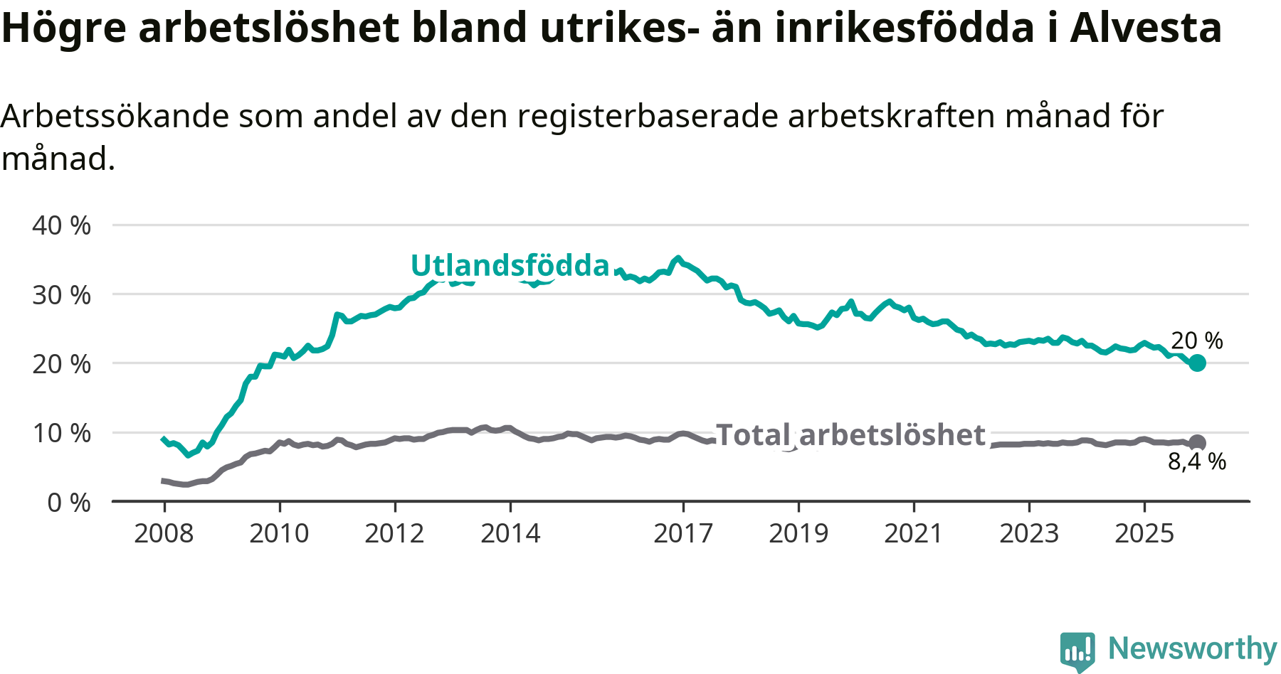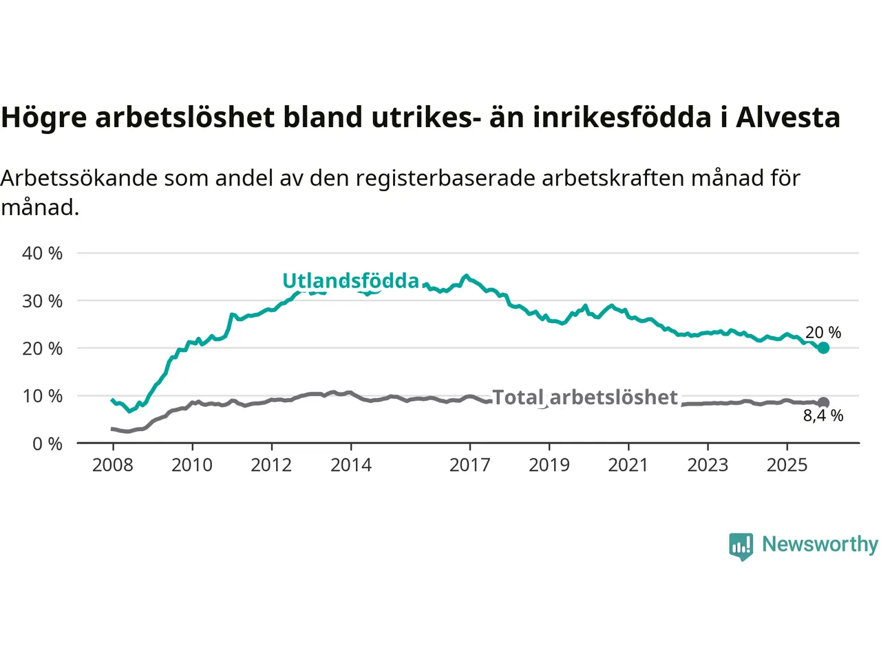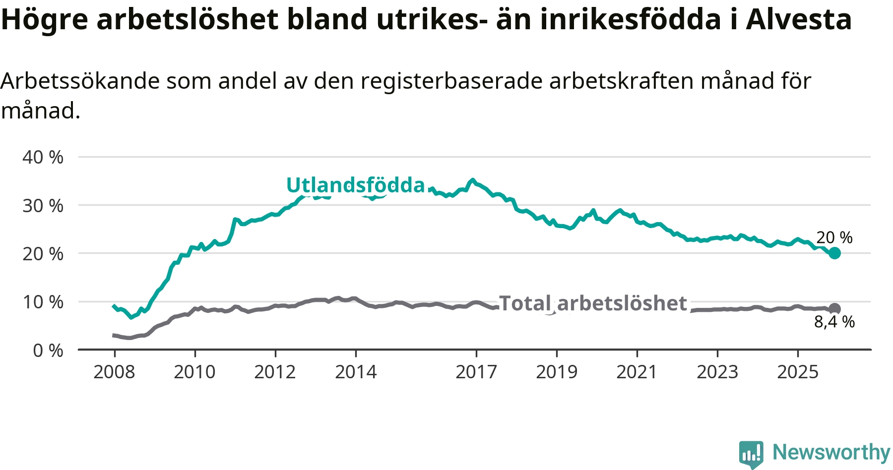 Arbetslösheten bland utlandsfödda var 20,0 procent i Alvesta under december månad, motsvarande 485 av 2 425 personer. Det är 2,5 procentenheter färre än vid samma tidpunkt i fjol (−63 om man räknar personer). Därmed är de utlandsföddas arbetslöshet lägre än vid samma tidpunkt i fjol för sjunde månaden i följd. Sedan maj 2025 har arbetslösheten bland utlandsfödda minskat från 21,8 till 20,0 procent.