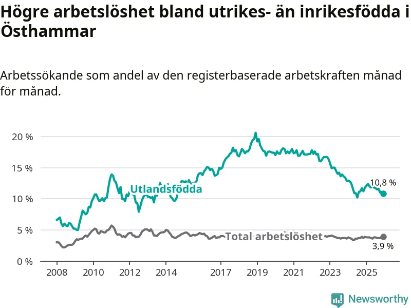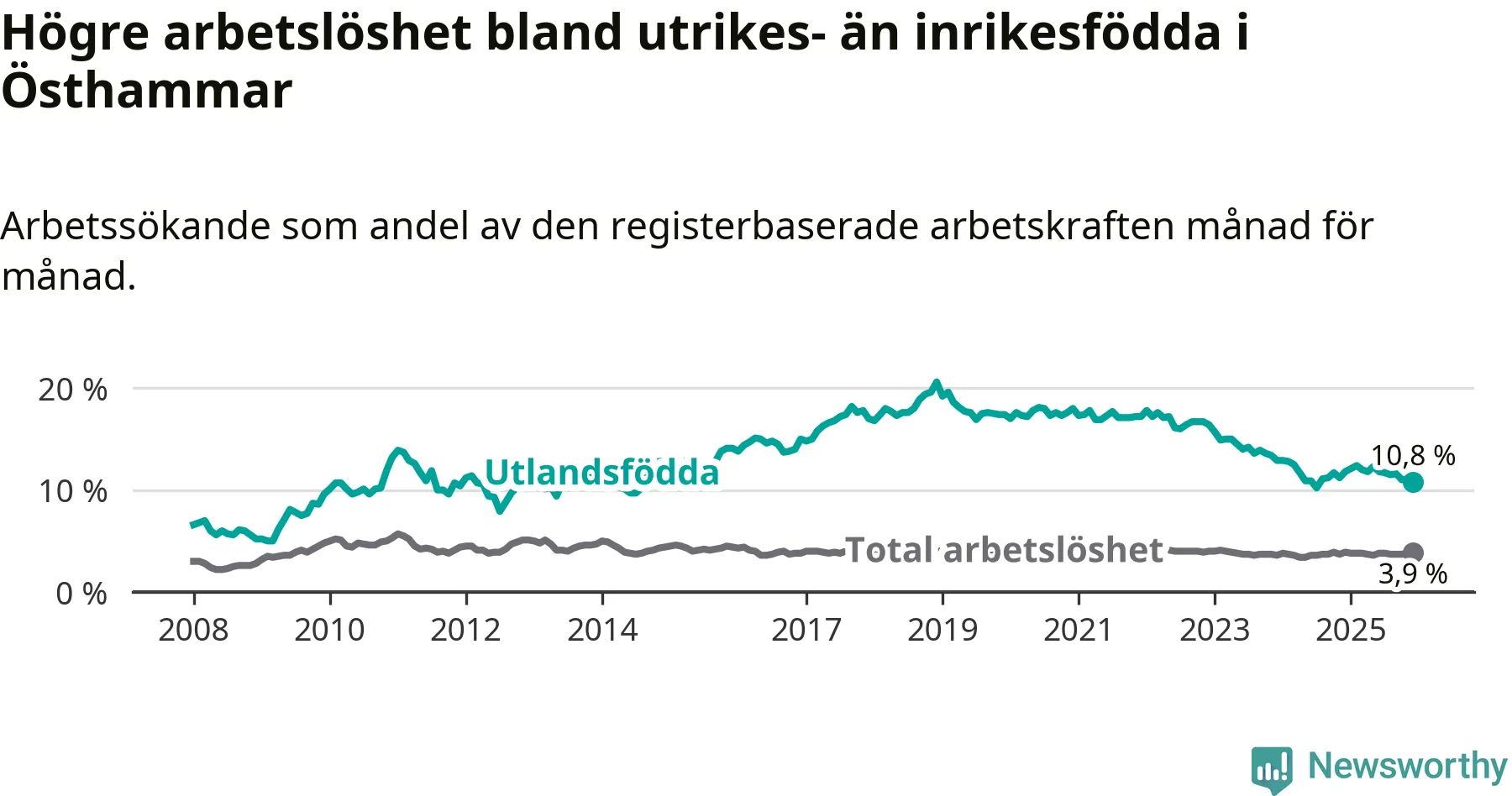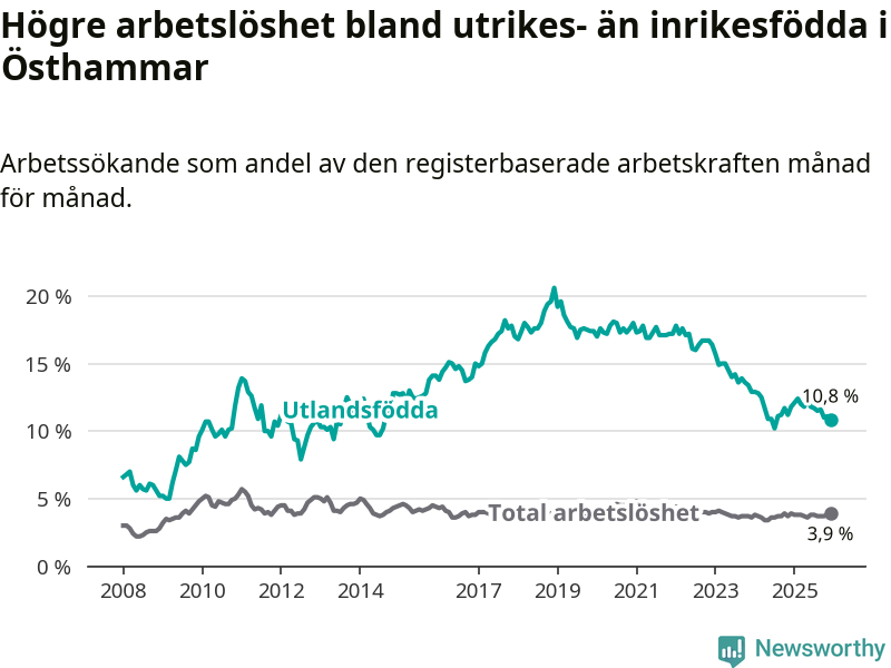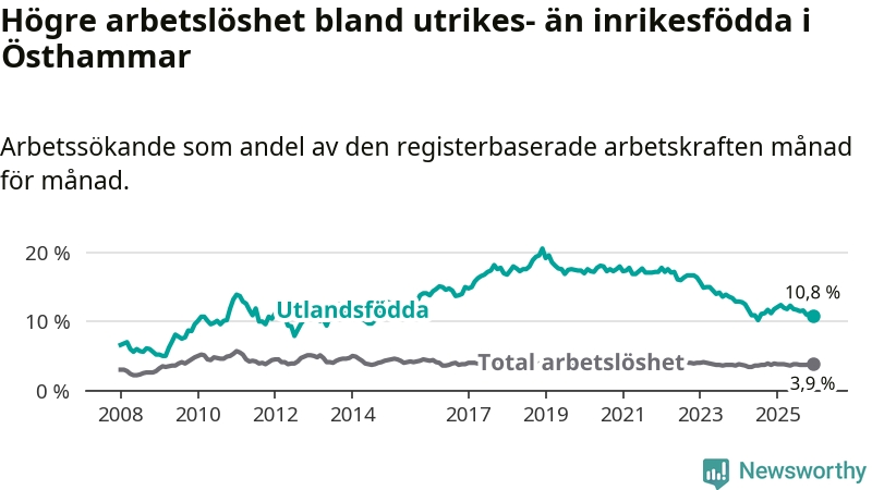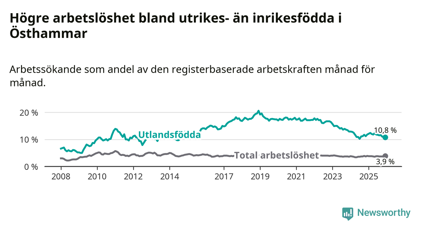 Arbetslösheten bland utlandsfödda var 10,8 procent i Östhammar under december månad, motsvarande 125 av 1 157 personer. Det är 1,0 procentenheter färre än vid samma tidpunkt i fjol (−9 om man räknar personer).