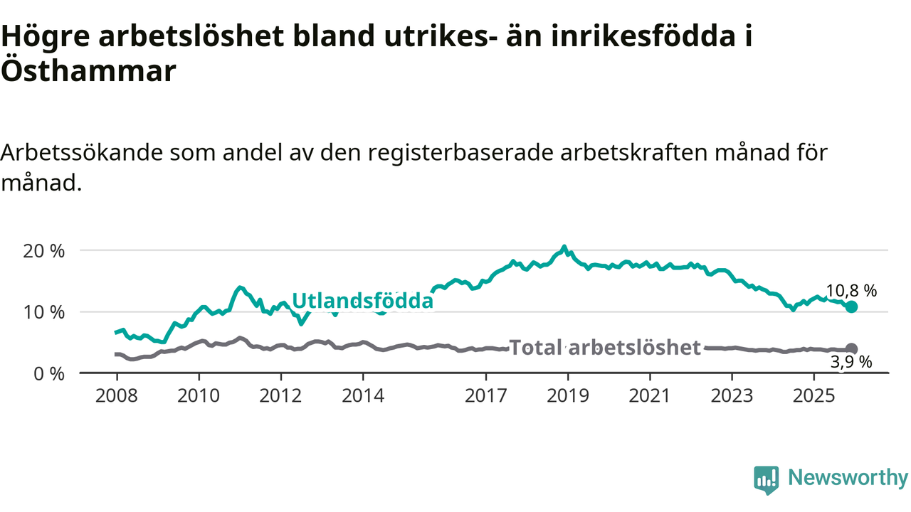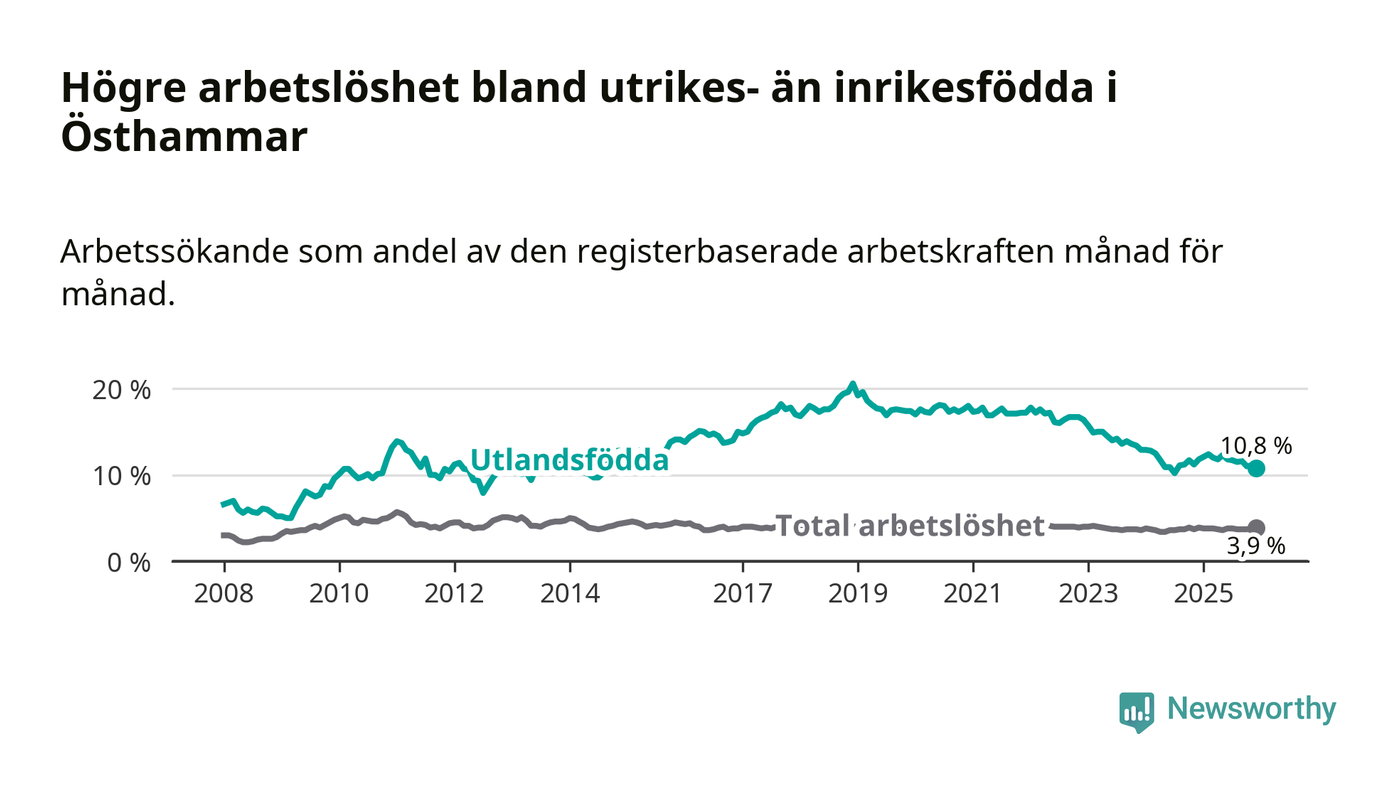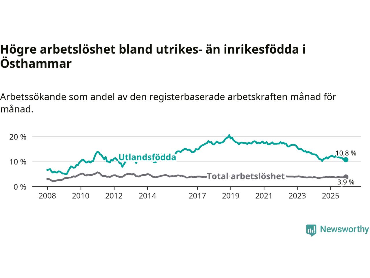 Skillnaden i arbetslöshet mellan utrikesfödda och hela befolkningen är 6,9 procentenheter i Östhammar. Det är en mindre skillnad än för ett år sedan (−1,0 procentenheter).