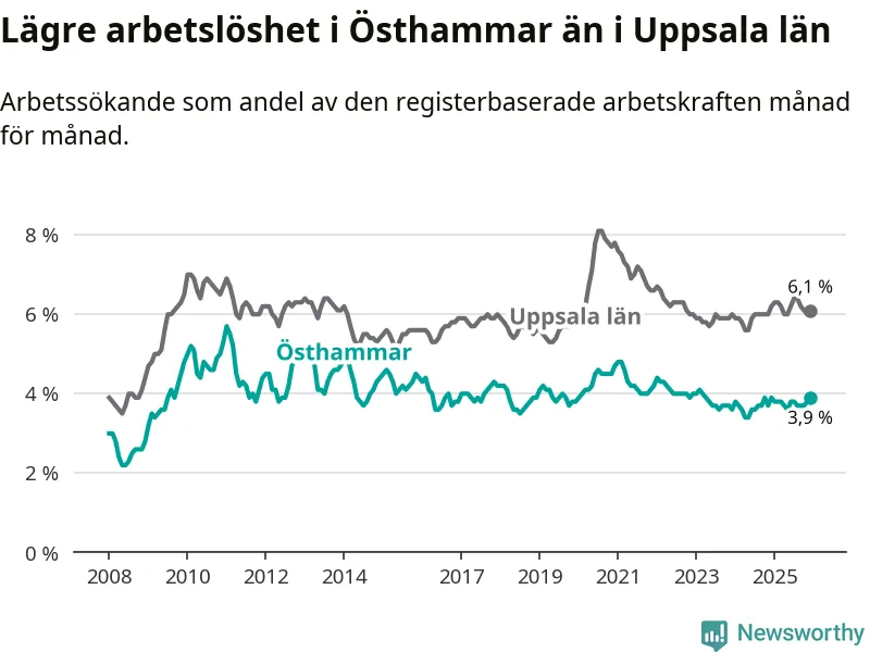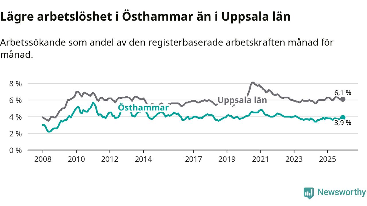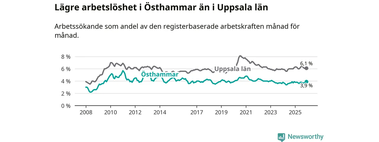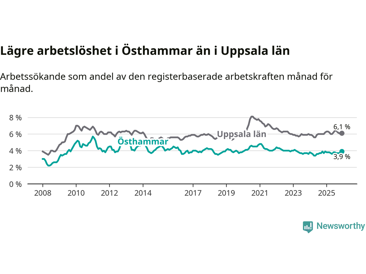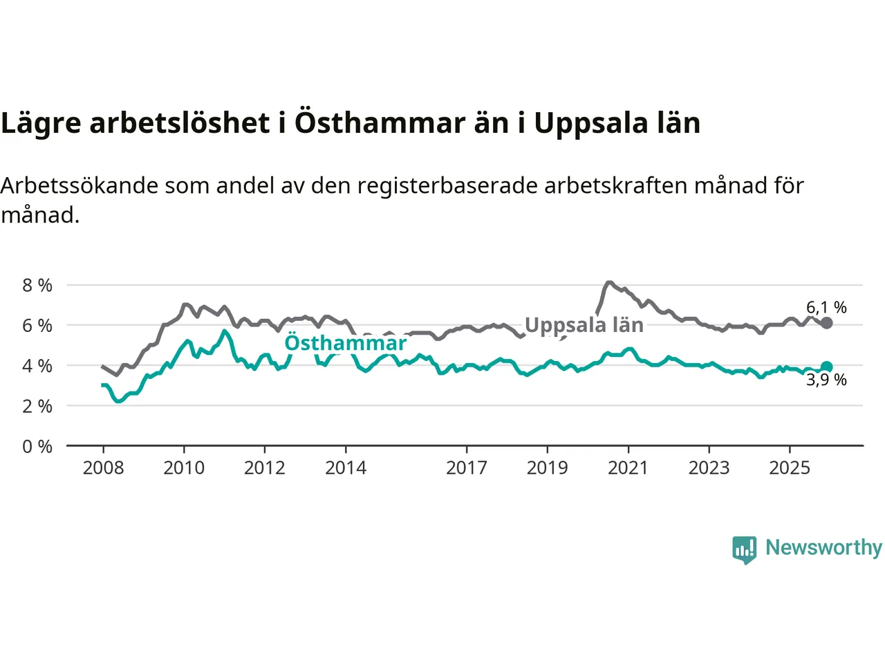 Östhammar går därmed mot strömmen i förhållande till andra kommuner i Uppsala län. I de flesta andra kommuner i länet går arbetslösheten nedåt. Störst är minskningen i Älvkarleby, där arbetslösheten sjunker med 1,2 procentenheter. I tabellen längre ner ser du utvecklingen i samtliga kommuner i länet.