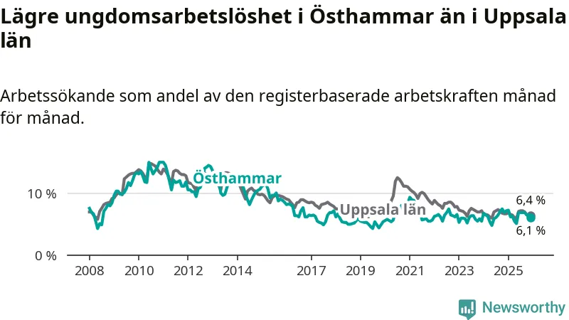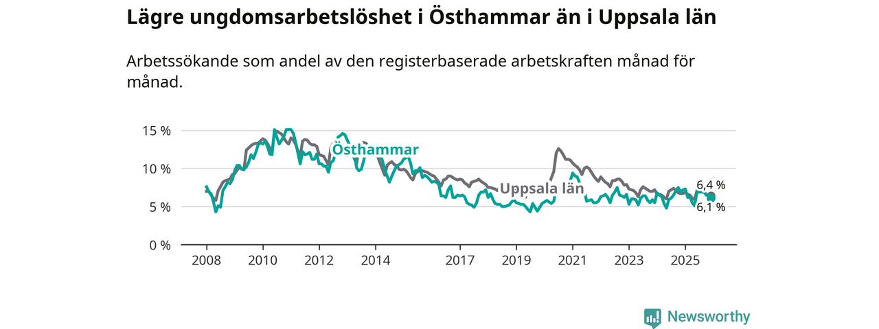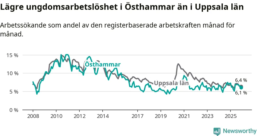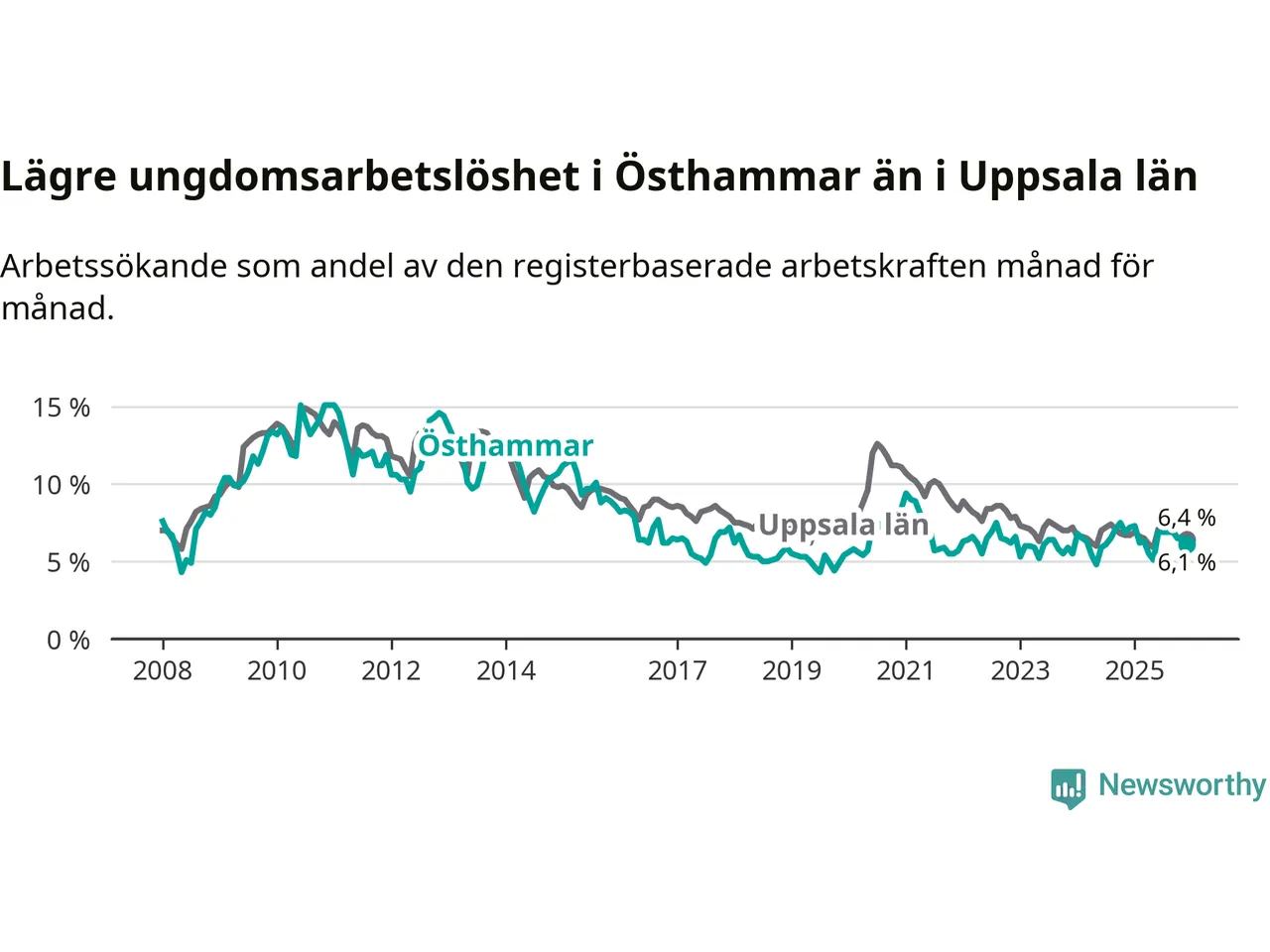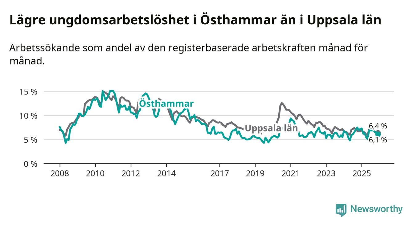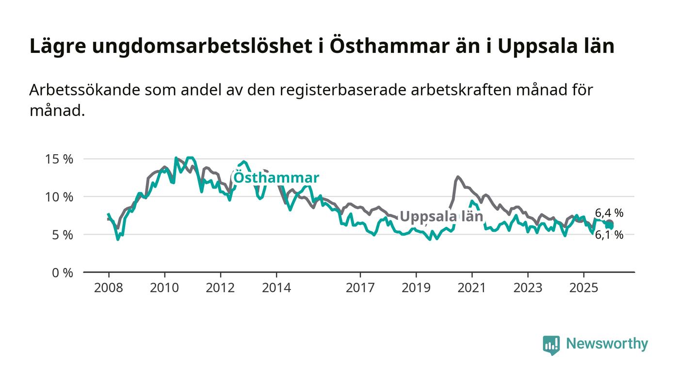Precis som den totala arbetslösheten ligger ungdomsarbetslösheten i Östhammar lägre än i Uppsala som helhet. Skillnaden mellan kommunen och länet är 0,3 procentenheter.