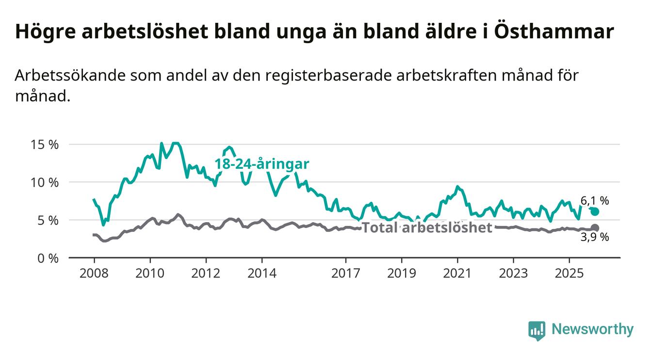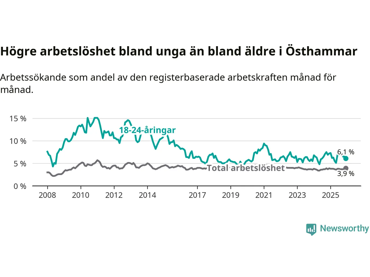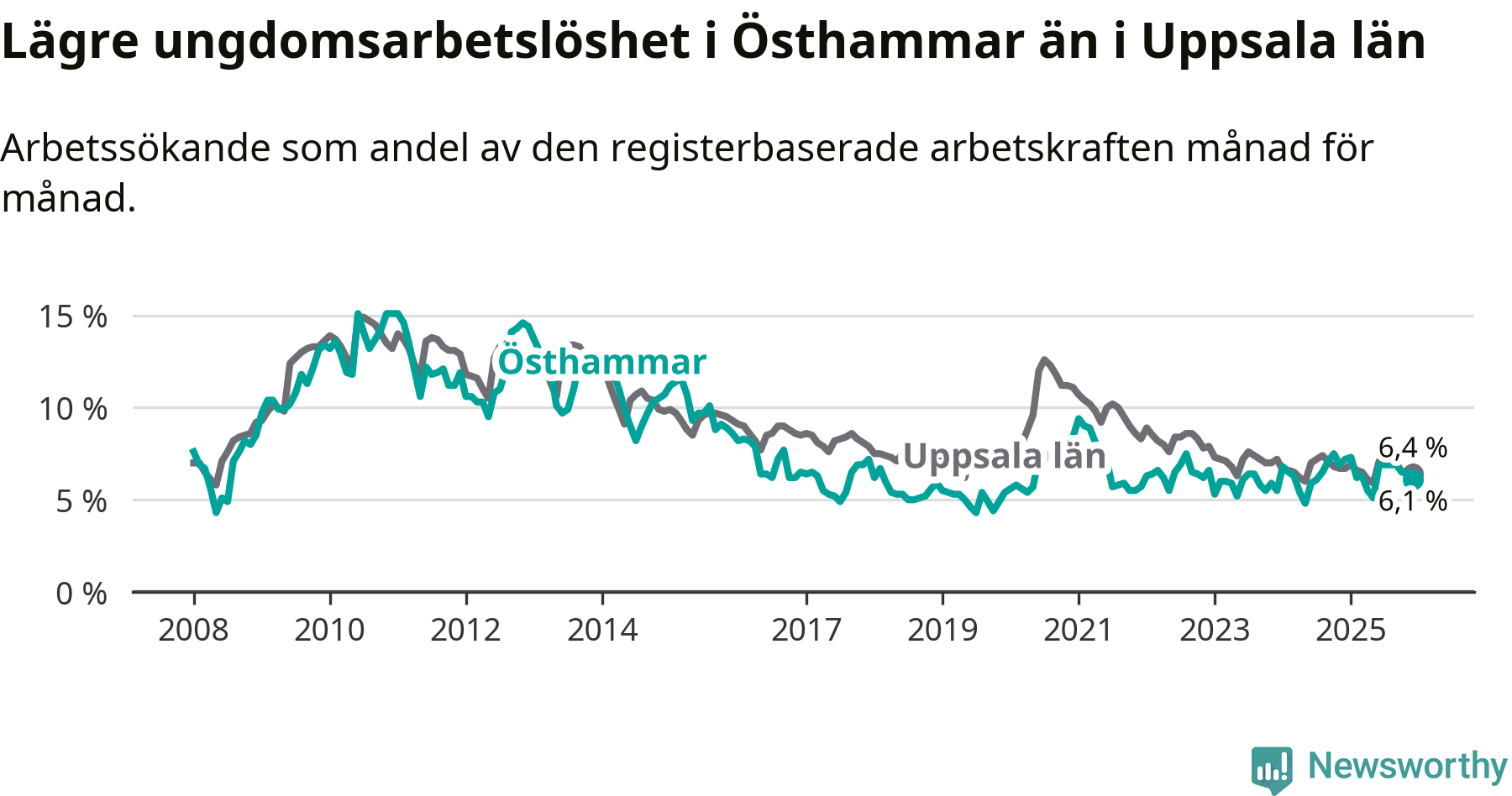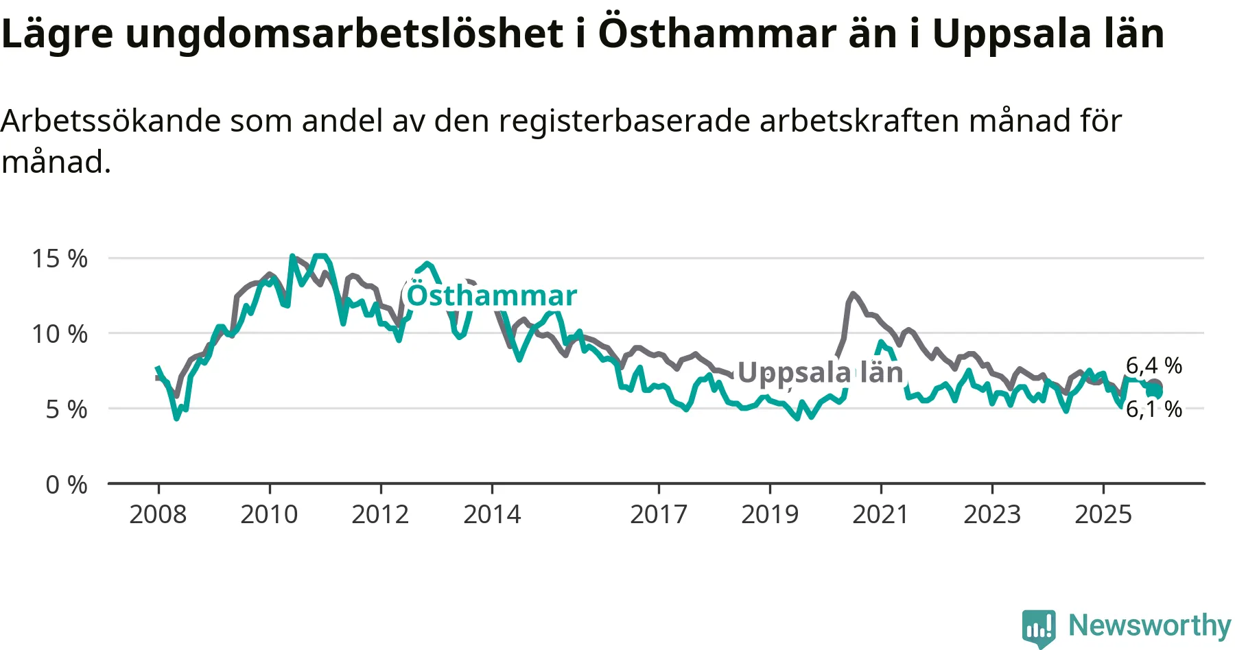 Precis som den totala arbetslösheten ligger ungdomsarbetslösheten i Östhammar lägre än i Uppsala som helhet. Skillnaden mellan kommunen och länet är 0,3 procentenheter.