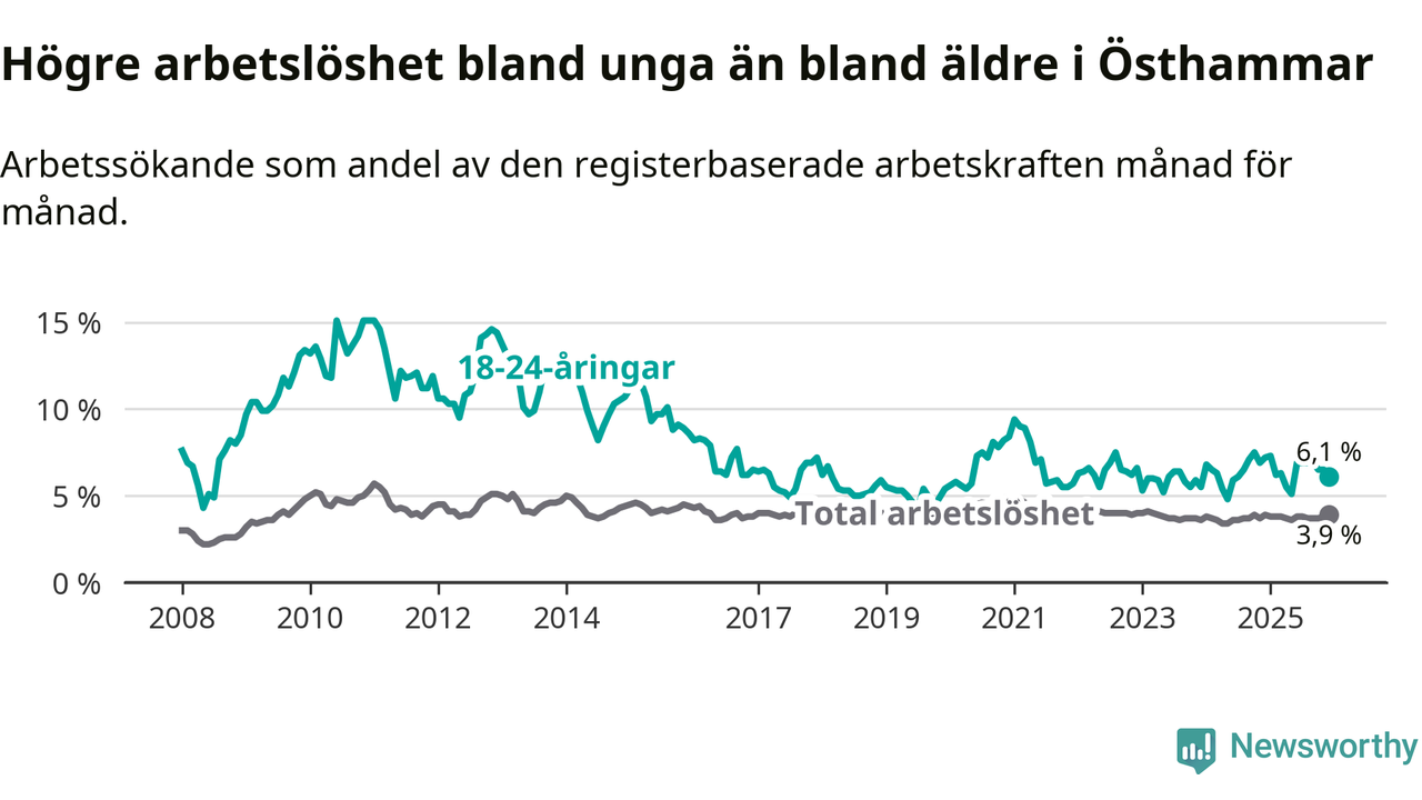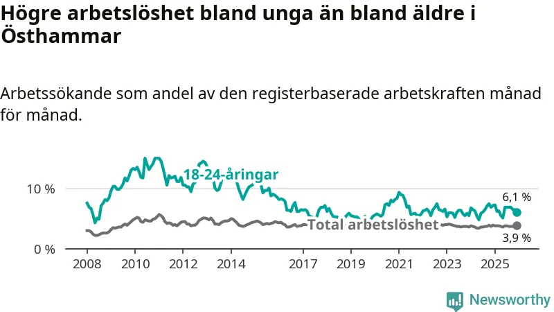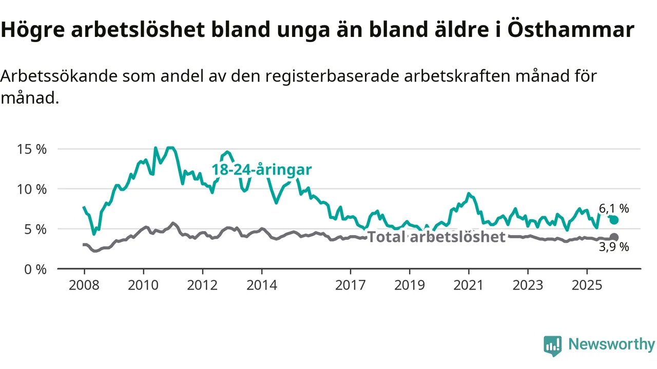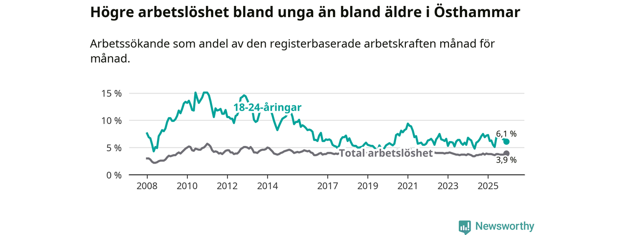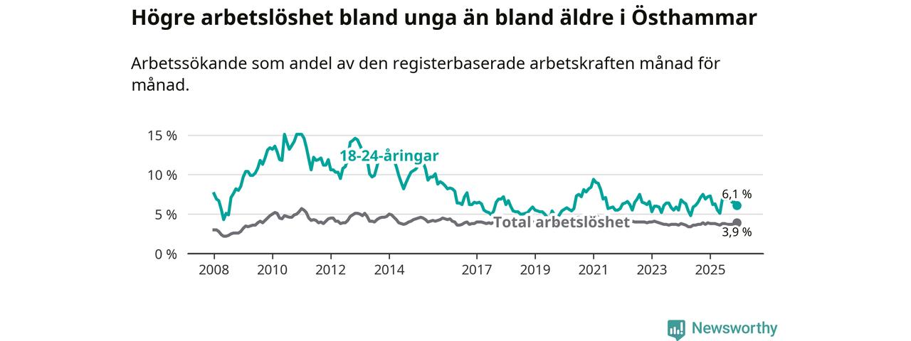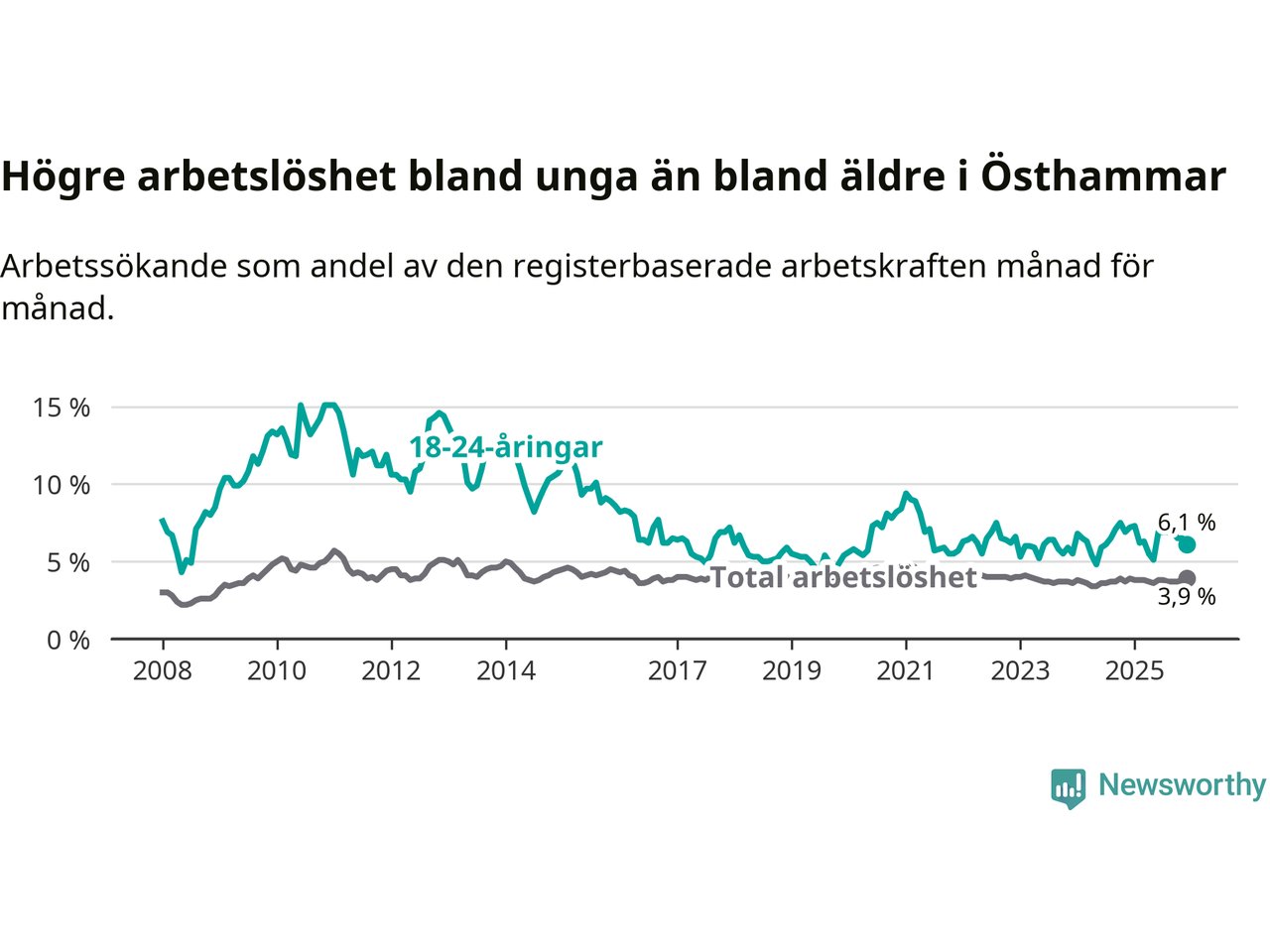 Precis som den totala arbetslösheten ligger ungdomsarbetslösheten i Östhammar lägre än i Uppsala som helhet. Skillnaden mellan kommunen och länet är 0,3 procentenheter.