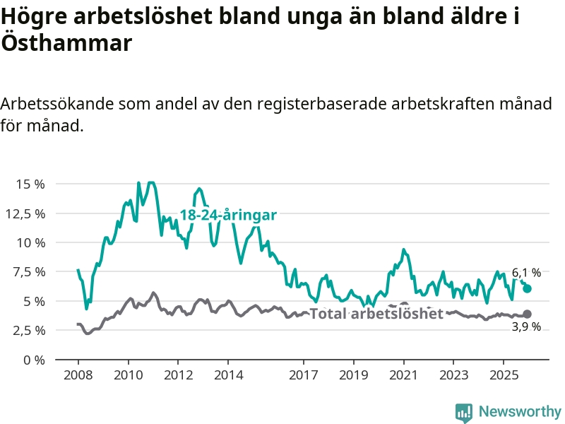 I december var 6,1 procent av 18–24-åringarna inskrivna som arbetssökande (motsvarande 60 personer). Mäter vi antalet inskrivna ser vi en minskning med nio personer på ett års sikt.