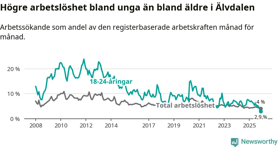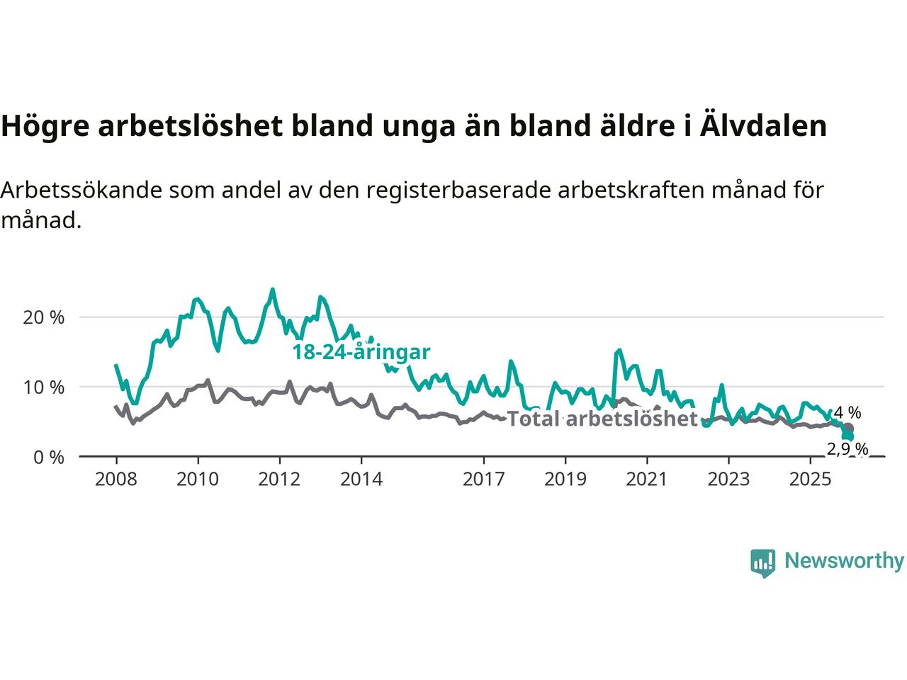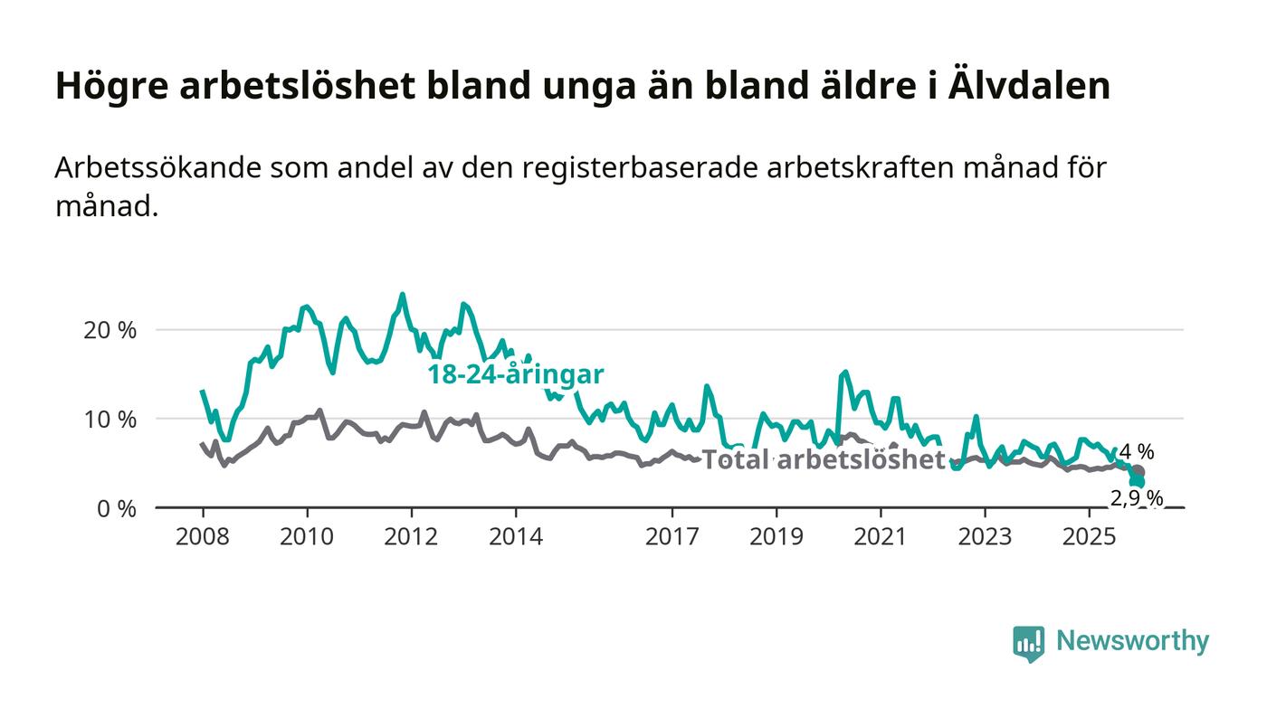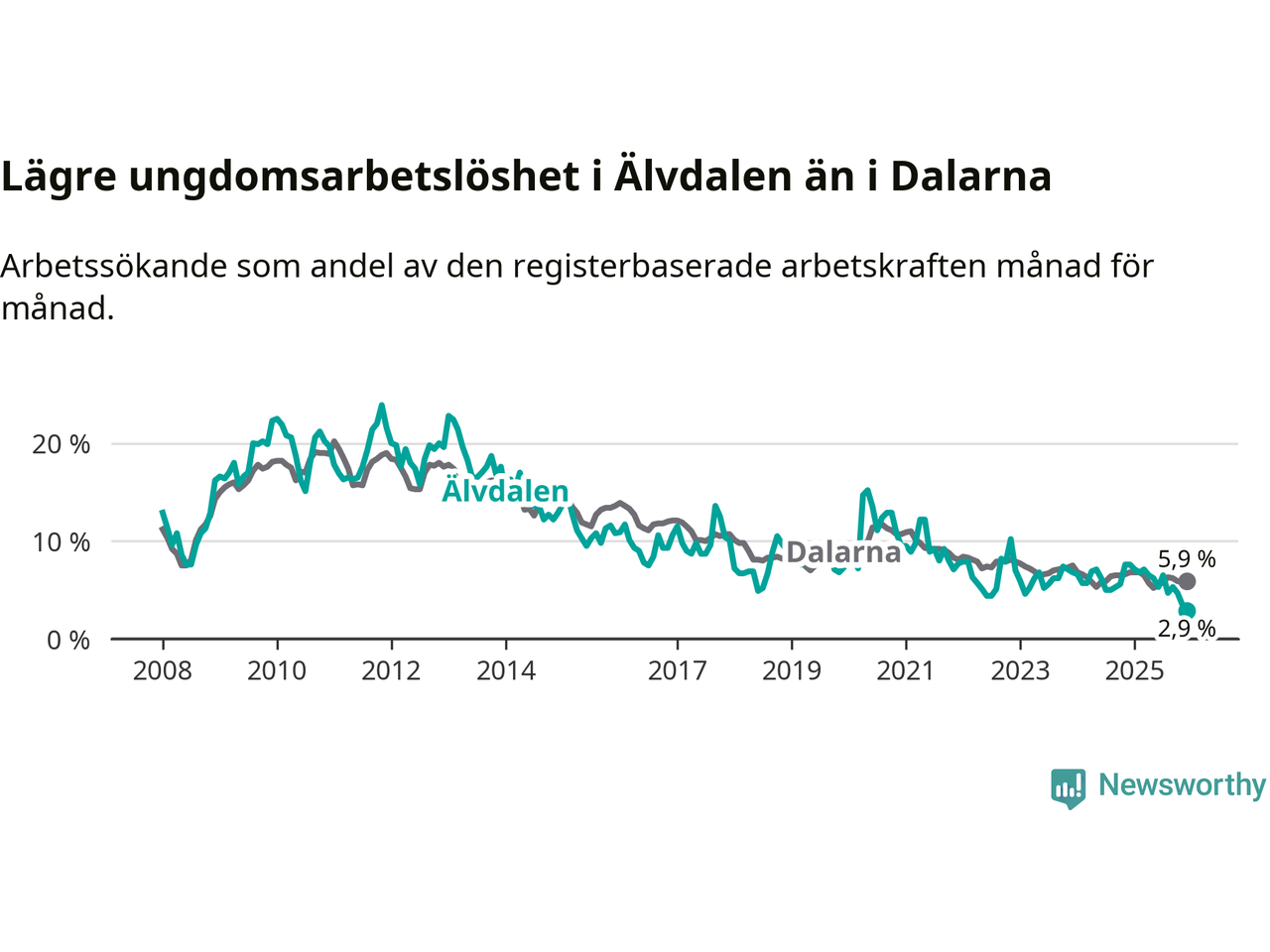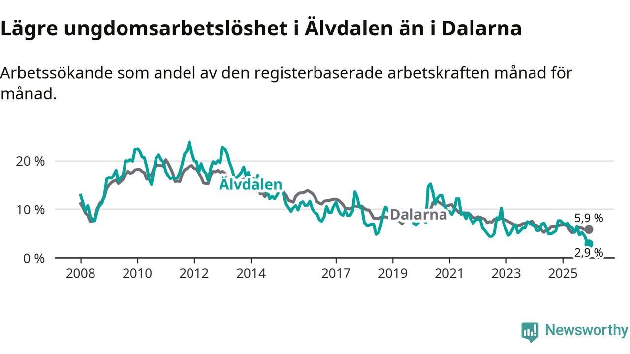 Precis som den totala arbetslösheten ligger ungdomsarbetslösheten i Älvdalen lägre än i Dalarna som helhet. Skillnaden mellan kommunen och länet är 3,0 procentenheter.