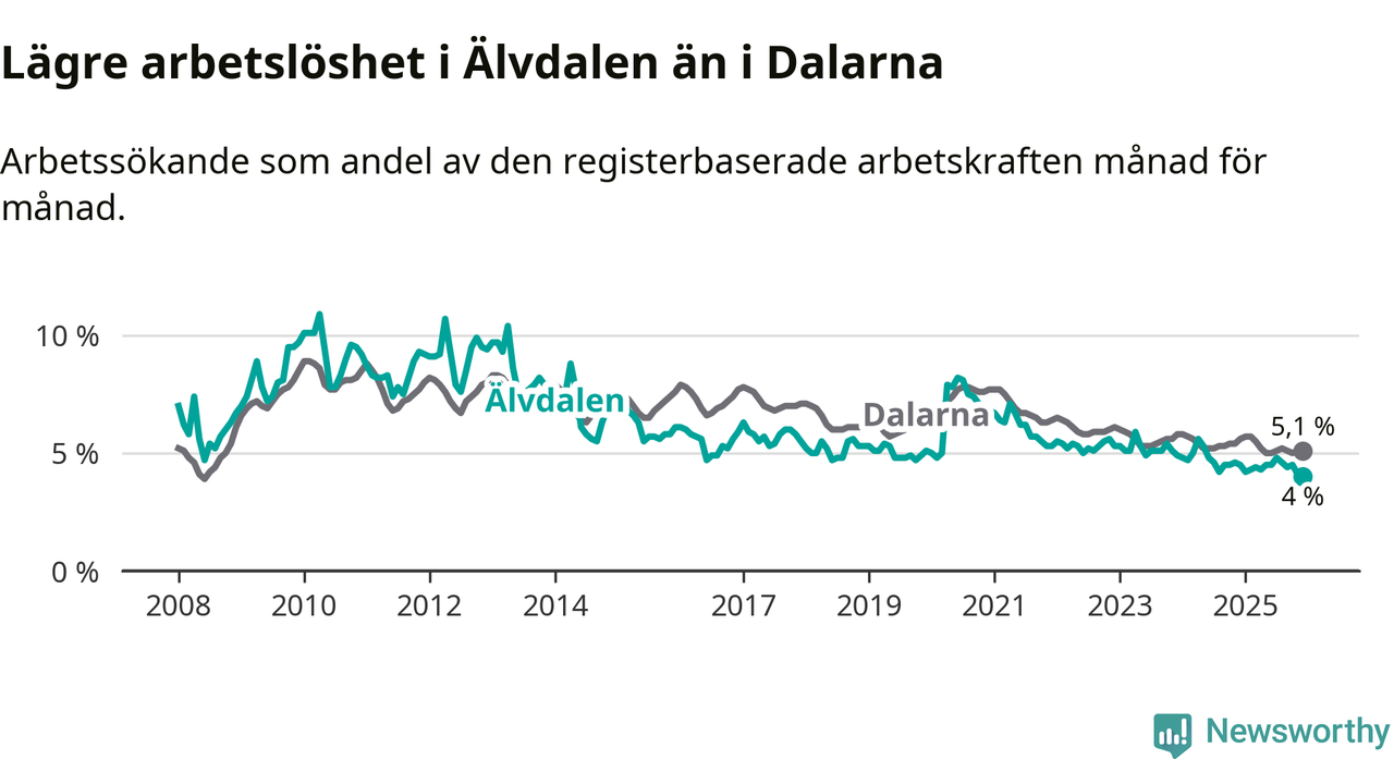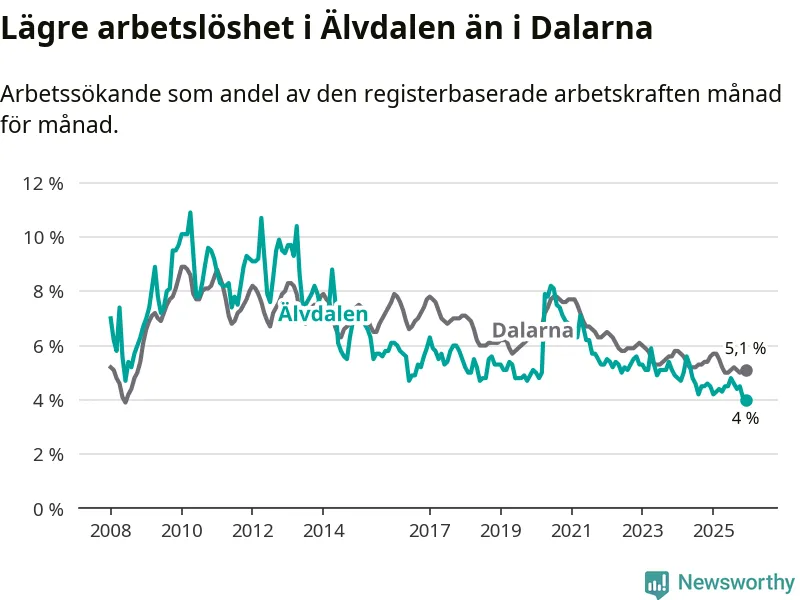 Under december månad rapporterade Älvdalens kommun en total arbetslöshet på 4,0 procent. Det är en minskning jämfört med samma tidpunkt i fjol (−0,5 procentenheter). Även i Dalarnas län sjunker arbetslösheten .