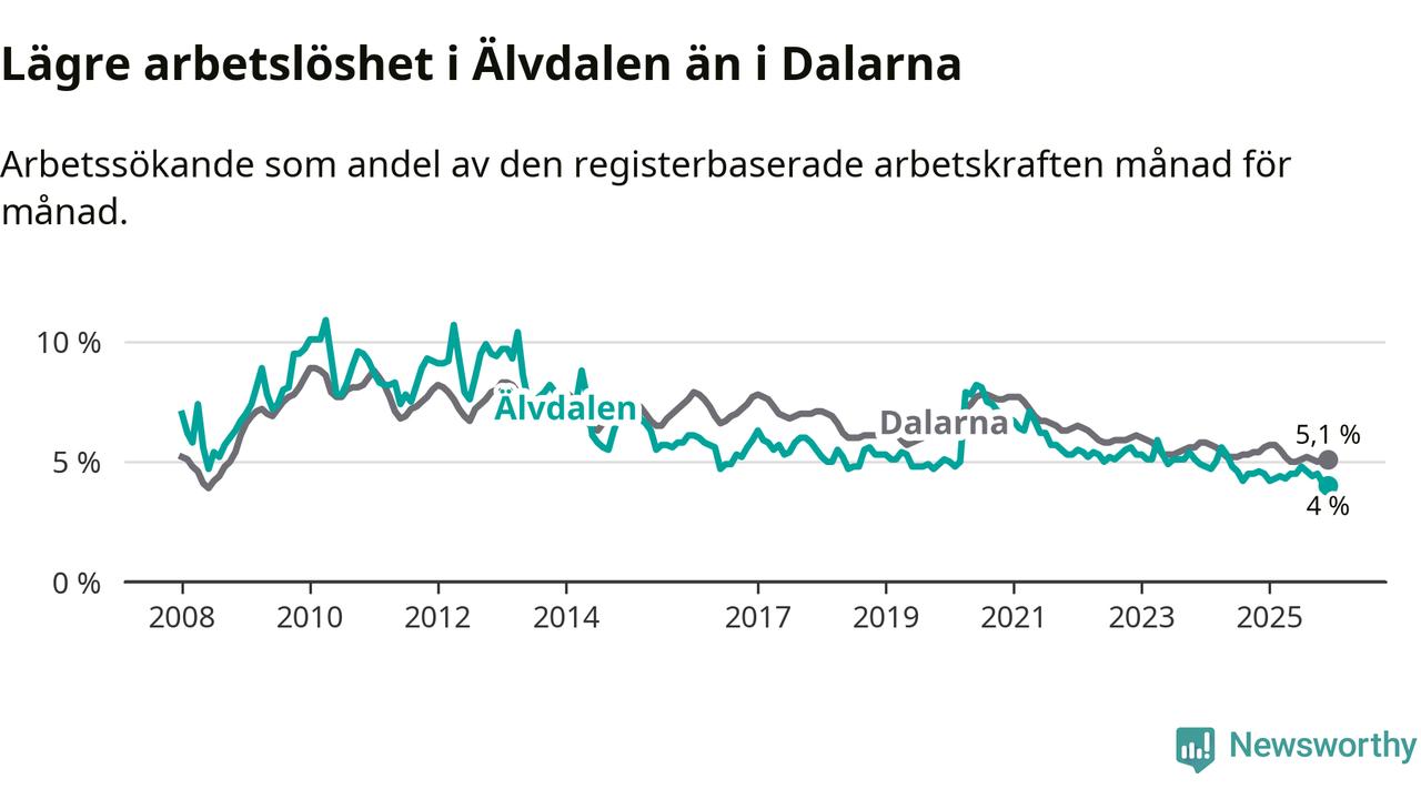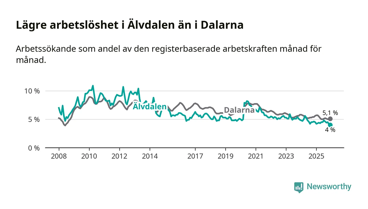 Älvdalen hade redan tidigare lägre arbetslöshet än snittet i hela Dalarnas län och nu växer klyftan (4,0 procent i kommunen, jämfört med 5,1 procent i hela länet). Mora har den lägsta arbetslösheten i länet (3,3 procent), medan Avesta har den högsta (7,5 procent). För att Älvdalen skulle komma ner i samma arbetslöshetsnivå som Mora skulle 22 personer behöva sysselsättas.