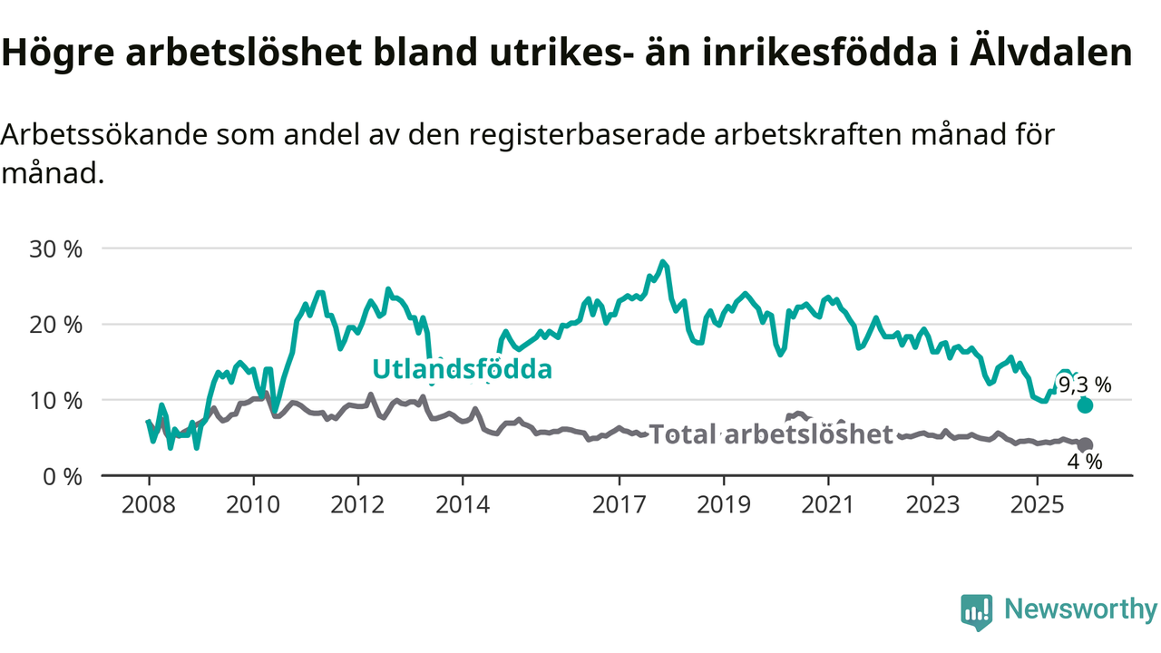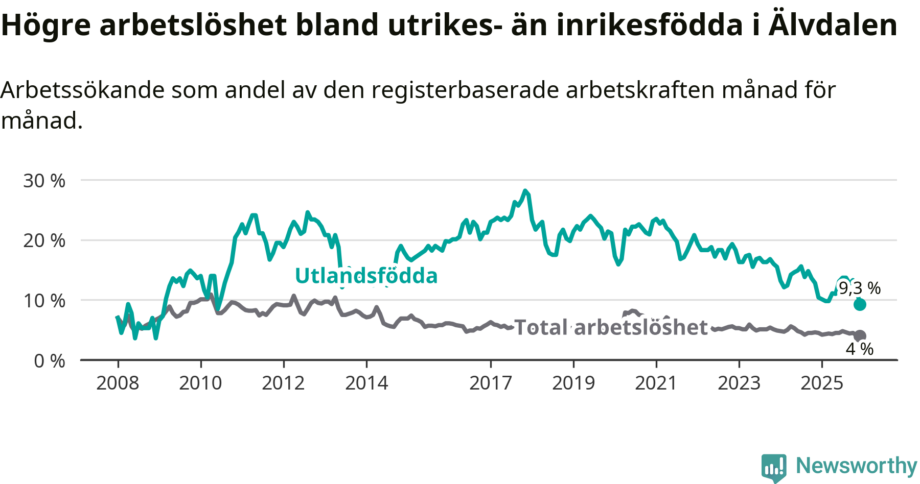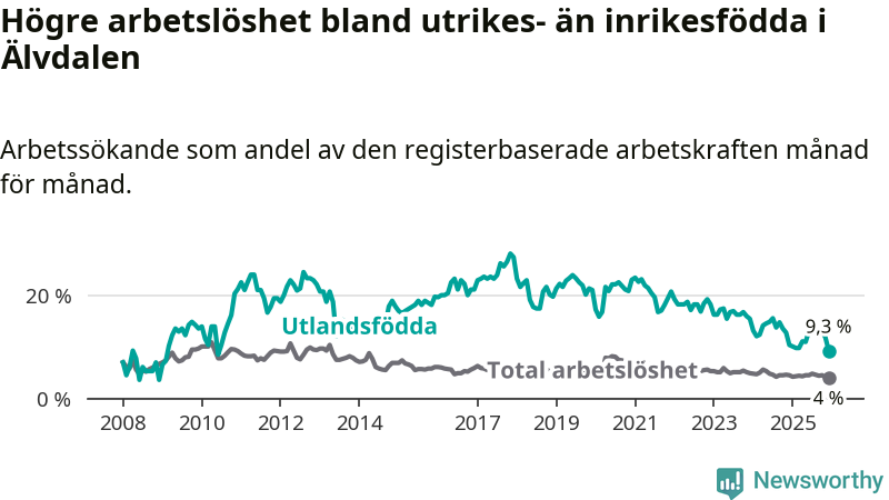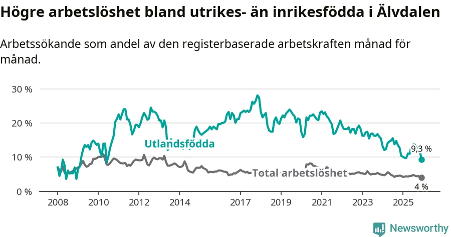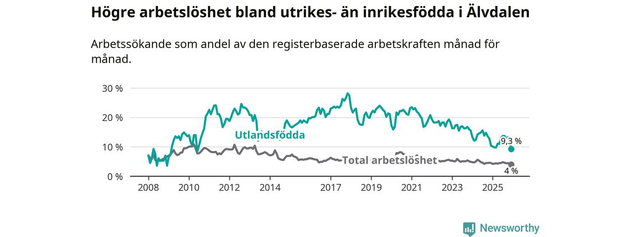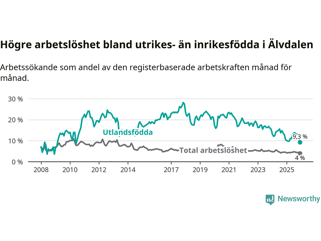 Arbetslösheten bland utlandsfödda var 9,3 procent i Älvdalen under december månad, motsvarande 31 av 333 personer. Det är 1,1 procentenheter färre än vid samma tidpunkt i fjol (−3 om man räknar personer). Därmed har de utlandsföddas arbetslöshet varit lägre än vid samma tidpunkt i fjol i över tre år i sträck. Sedan oktober 2022 har arbetslösheten bland utlandsfödda minskat från 18,5 till 9,3 procent. Den nuvarande arbetslöshetsnivån är den lägsta sedan juni 2010.