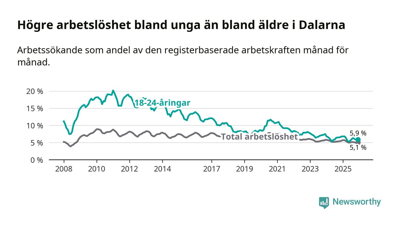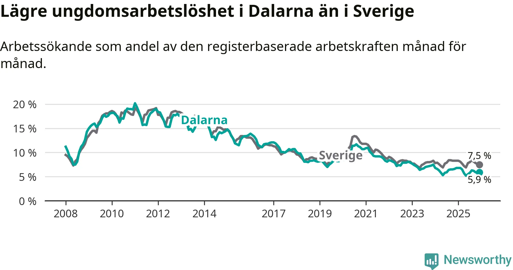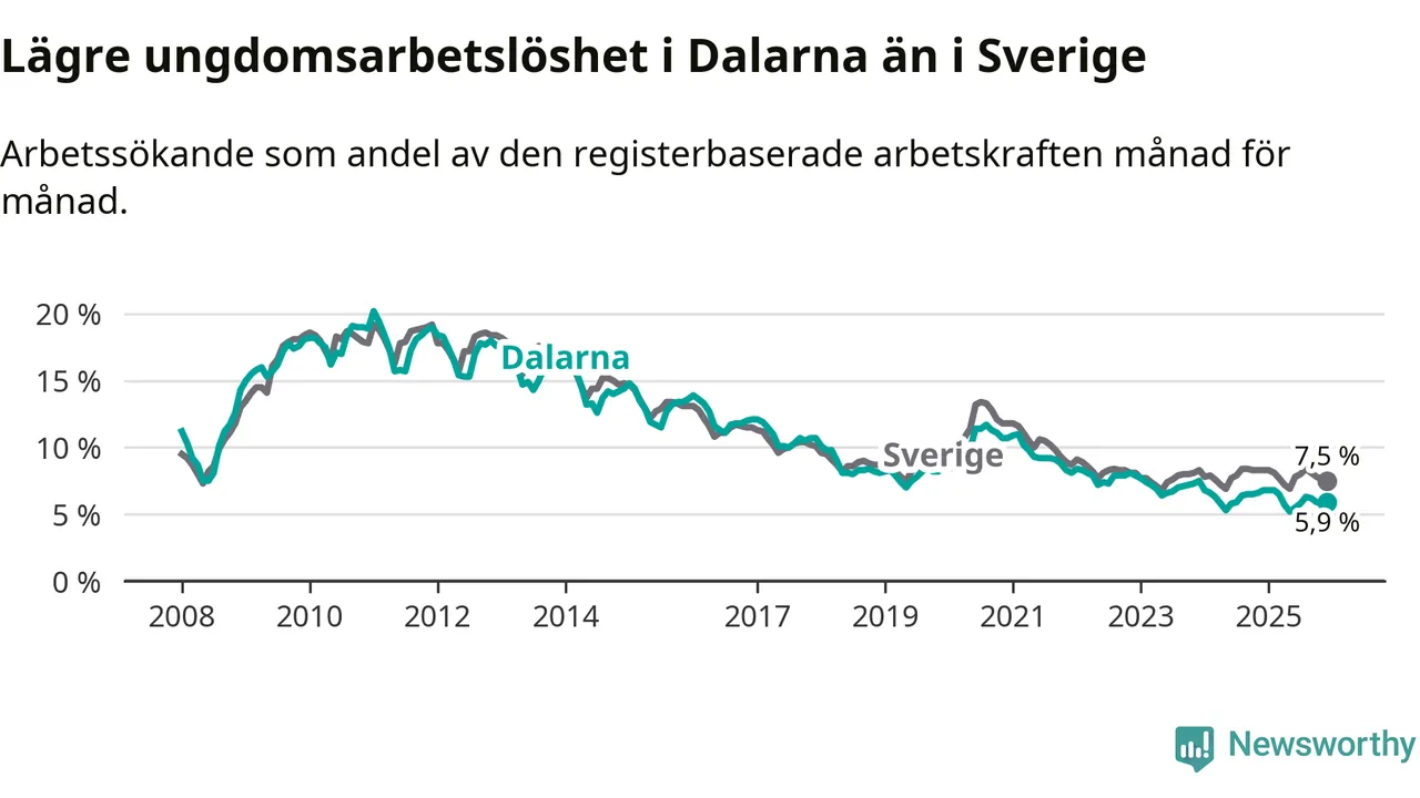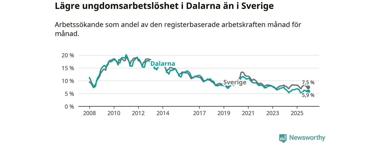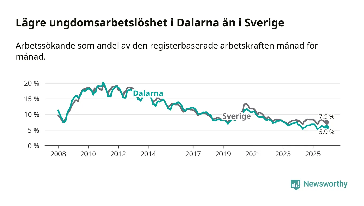 I och med den senaste månadens nedgång har de ungas arbetslöshet i Dalarna sjunkit nio månader i följd (ner från 6,5 procent i mars 2025 till 5,9 procent nu).