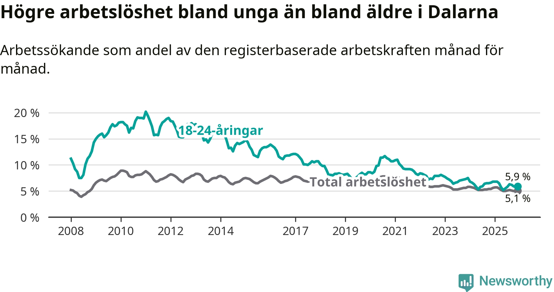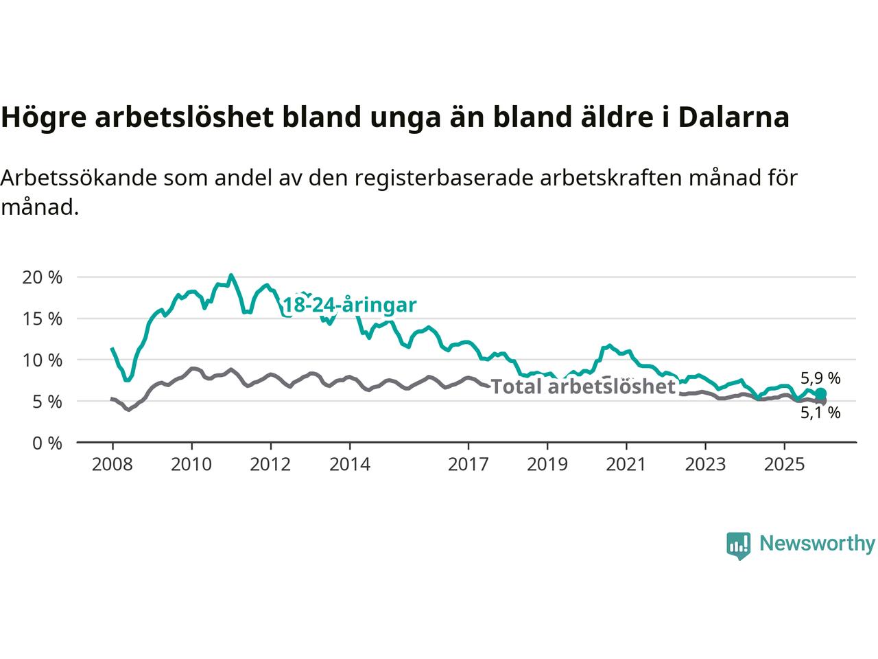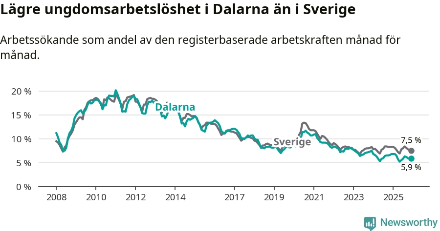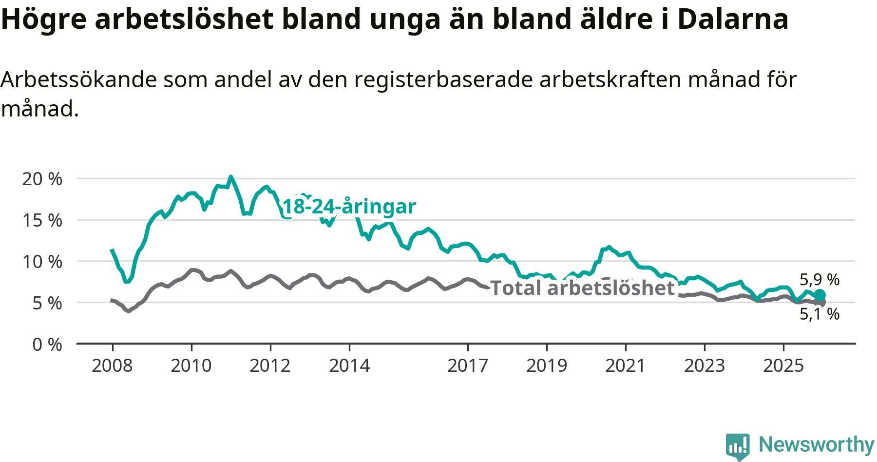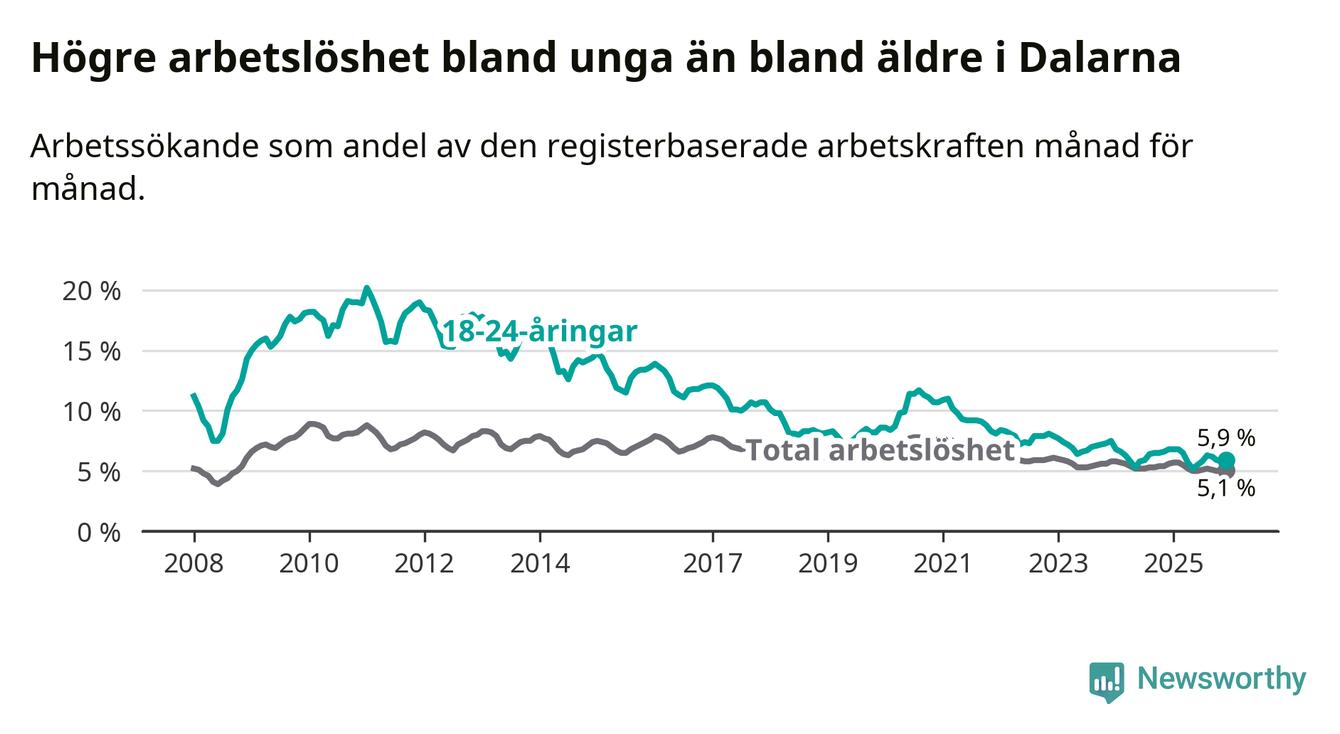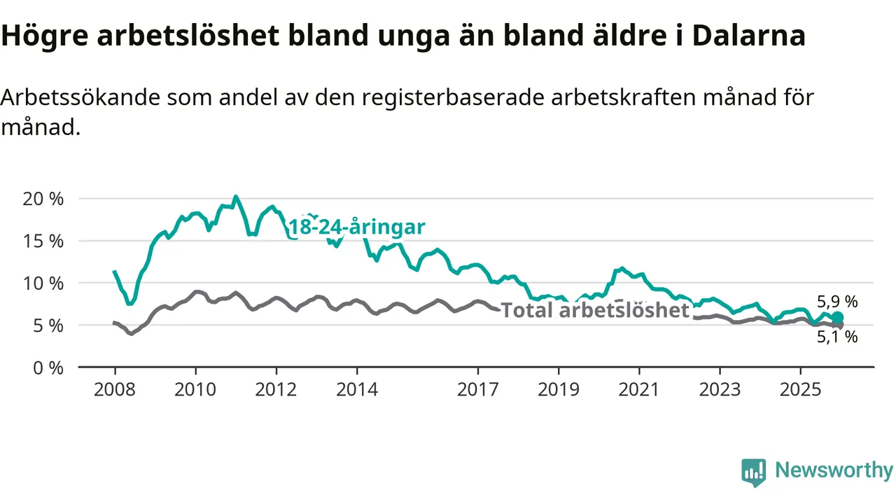 I och med den senaste månadens nedgång har de ungas arbetslöshet i Dalarna sjunkit nio månader i följd (ner från 6,5 procent i mars 2025 till 5,9 procent nu).