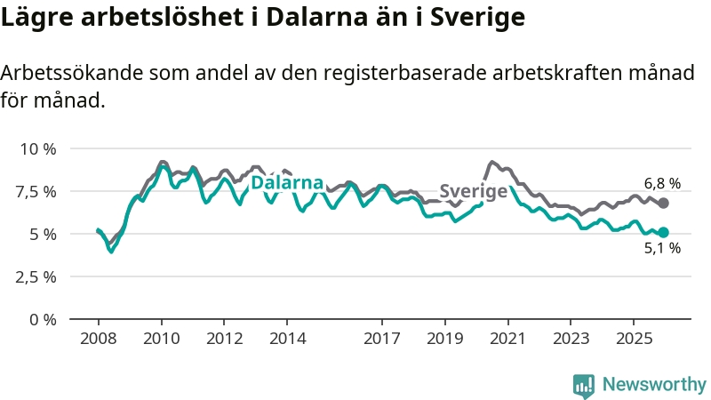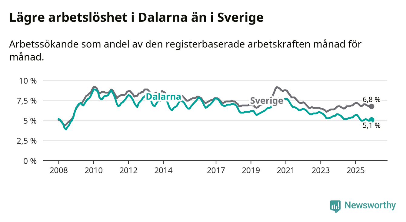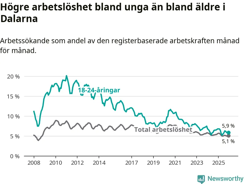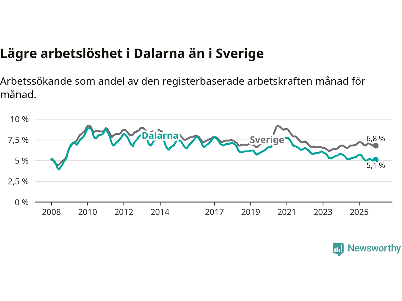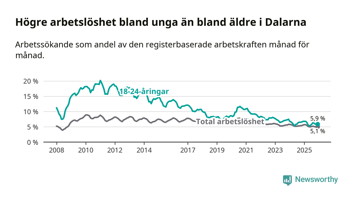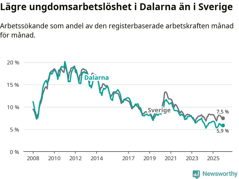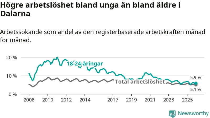 I och med den senaste månadens nedgång har de ungas arbetslöshet i Dalarna sjunkit nio månader i följd (ner från 6,5 procent i mars 2025 till 5,9 procent nu).