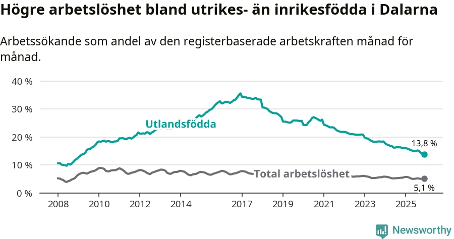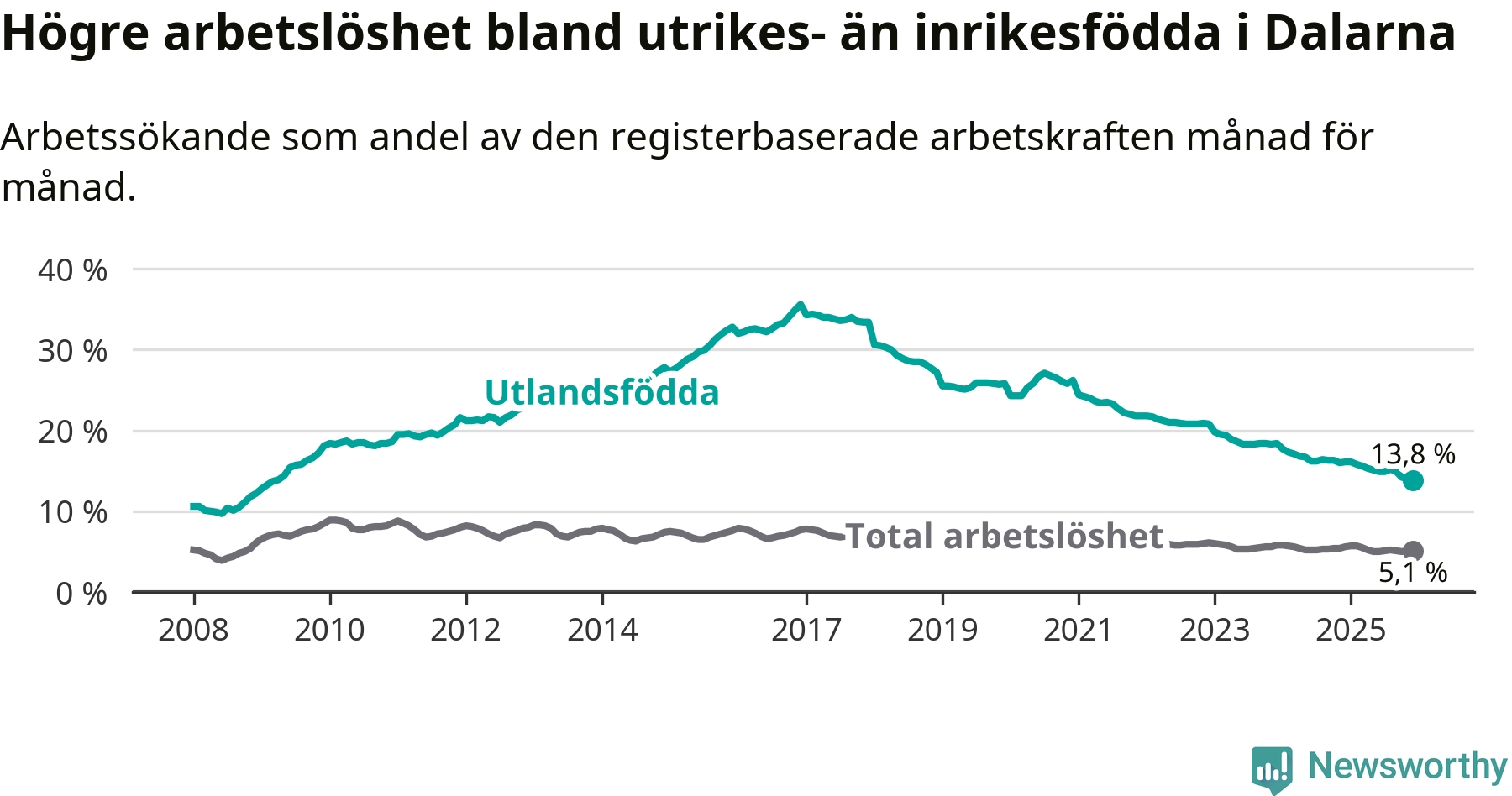 | Bland utlandsfödda | 13,8 % | −2,3 % ▼ | 14,3 % | −1,4 % ▼ |
