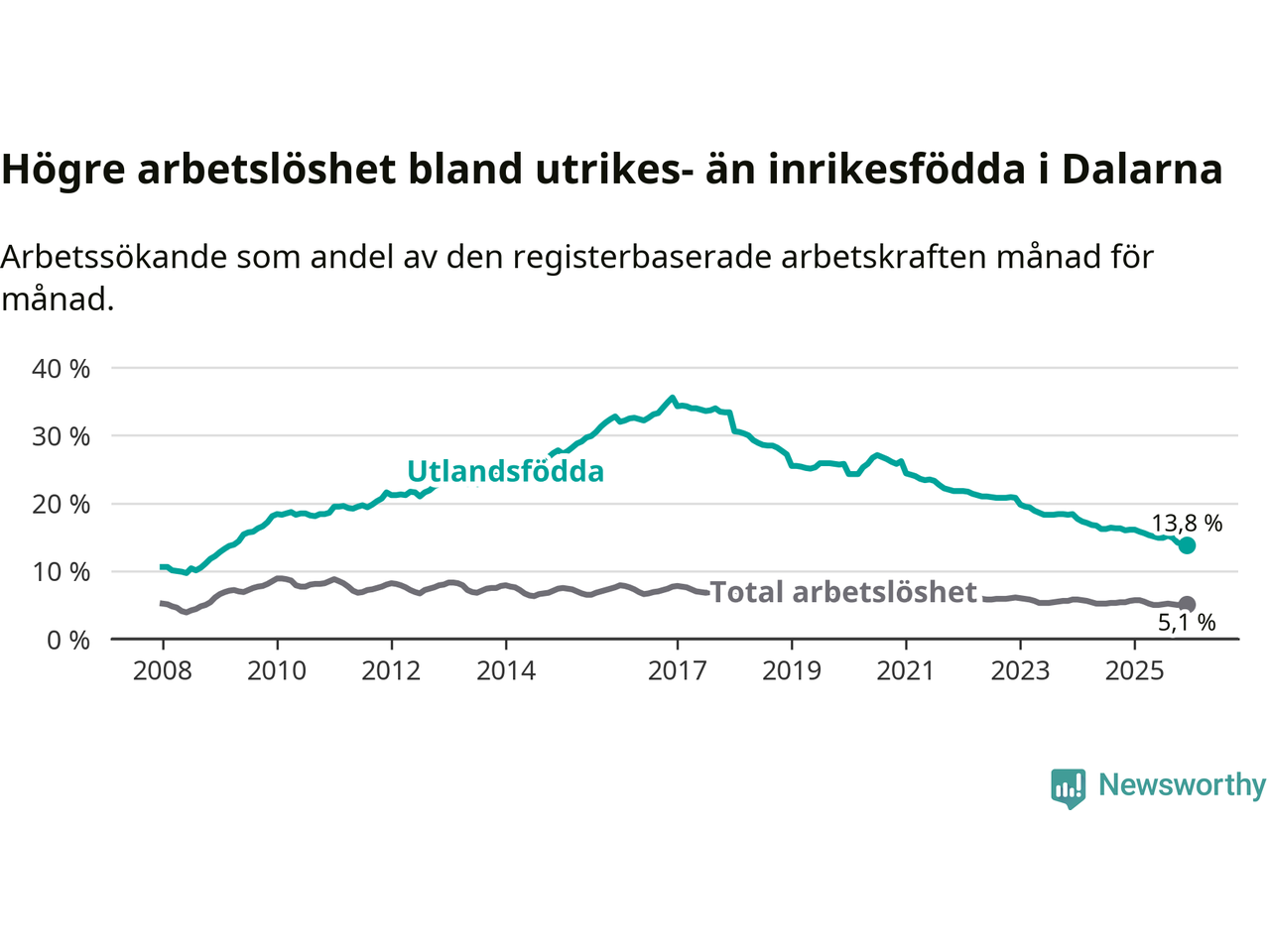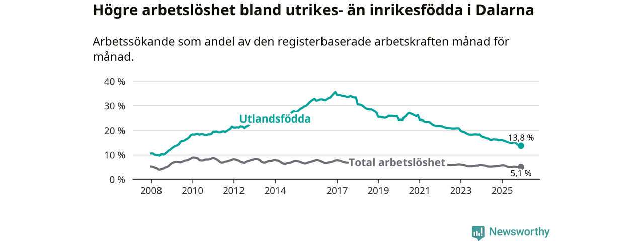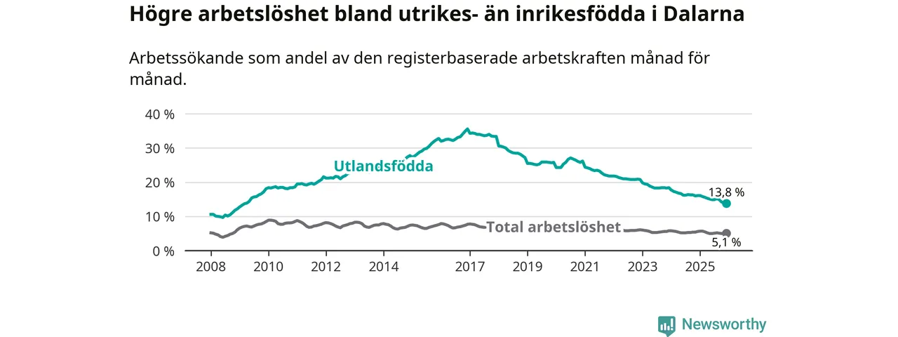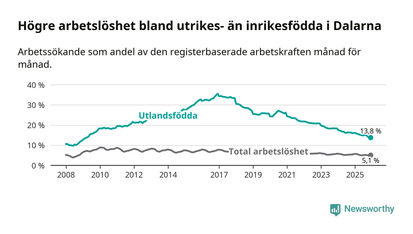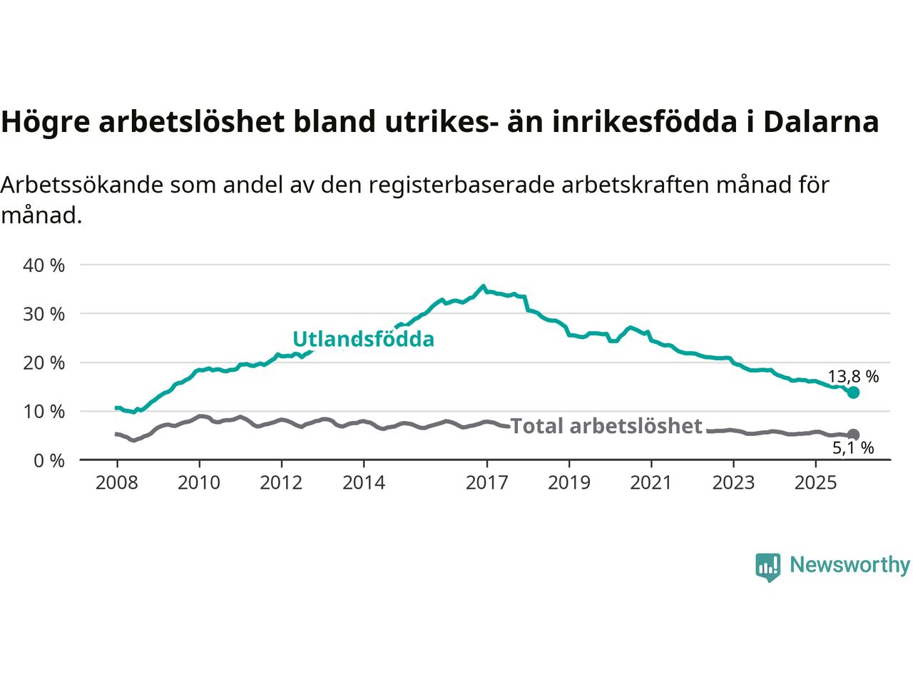 Arbetslösheten bland utlandsfödda var 13,8 procent i Dalarna under december månad, motsvarande 2 908 av 21 072 personer. Det är 2,3 procentenheter färre än vid samma tidpunkt i fjol (−473 om man räknar personer). Därmed har de utlandsföddas arbetslöshet varit lägre än vid samma tidpunkt i fjol i över fyra år i sträck. Sedan januari 2021 har arbetslösheten bland utlandsfödda minskat från 24,4 till 13,8 procent. Den nuvarande arbetslöshetsnivån är den lägsta sedan mars 2009.