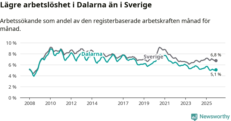 Under december månad rapporterade Dalarnas län en total arbetslöshet på 5,1 procent. Det är en minskning jämfört med samma tidpunkt i fjol (−0,5 procentenheter). Även i Sverige sjunker arbetslösheten .