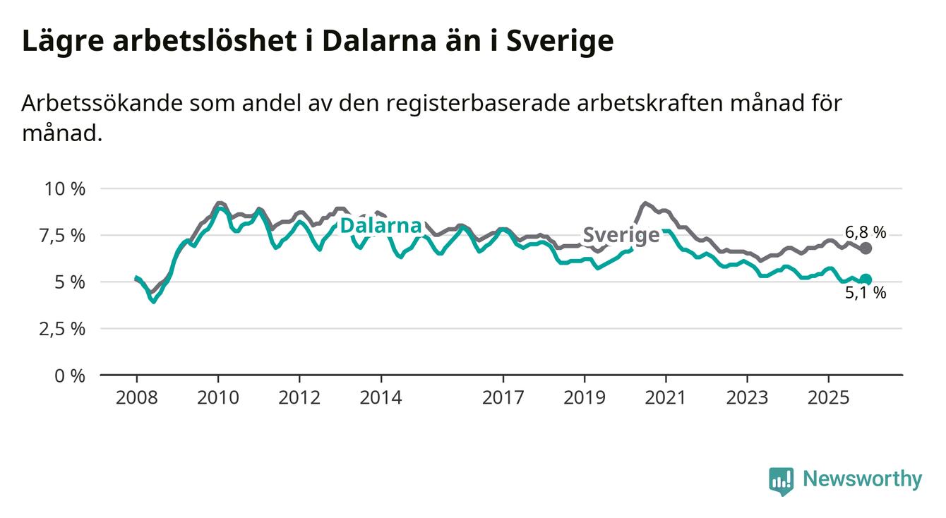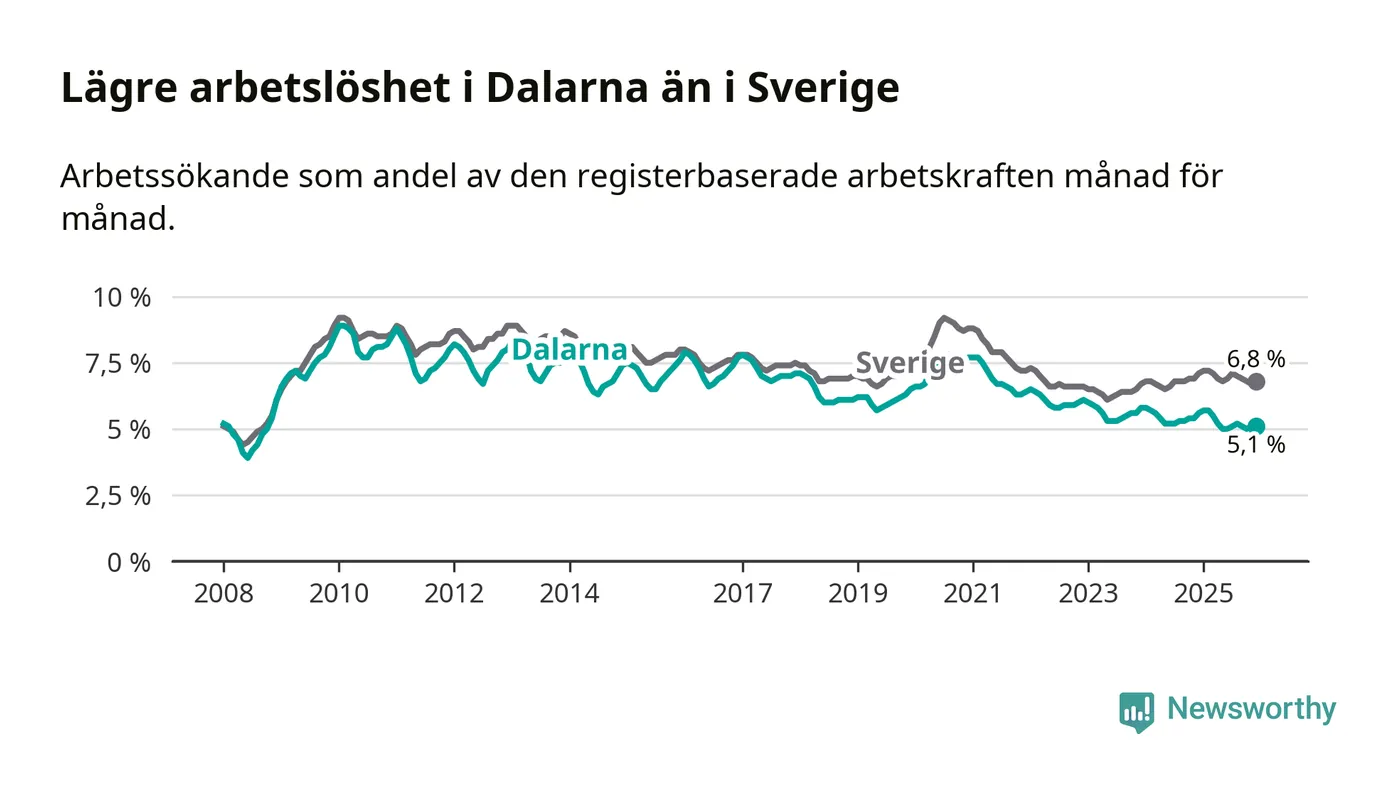 Dalarna hade redan tidigare lägre arbetslöshet än snittet i hela Sverige och nu växer klyftan (5,1 procent i länet, jämfört med 6,8 procent i hela riket). Norrbotten har den lägsta arbetslösheten i riket (3,8 procent), medan Skåne har den högsta (8,9 procent). För att Dalarna skulle komma ner i samma arbetslöshetsnivå som Norrbotten skulle 1 763 personer behöva sysselsättas.