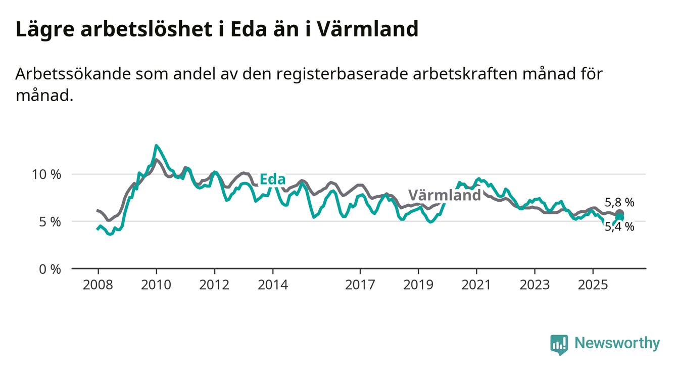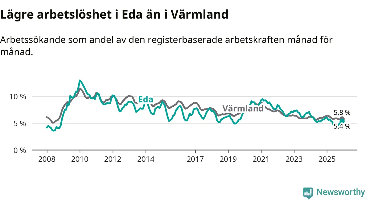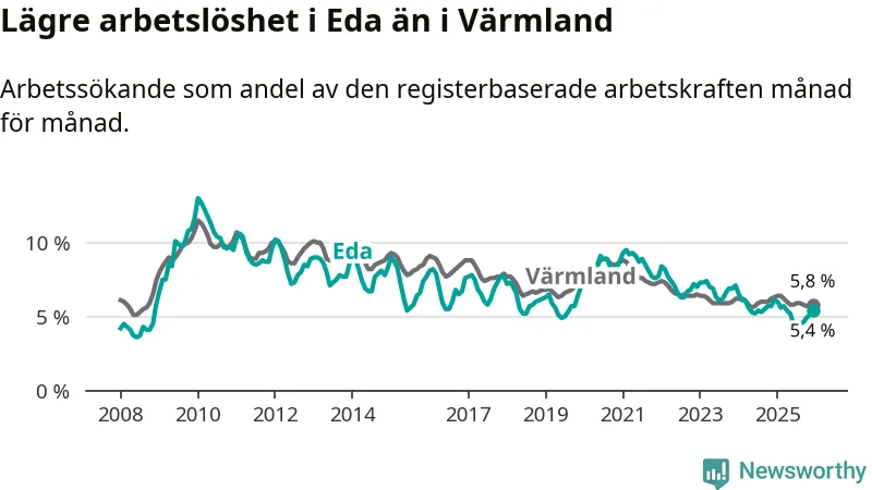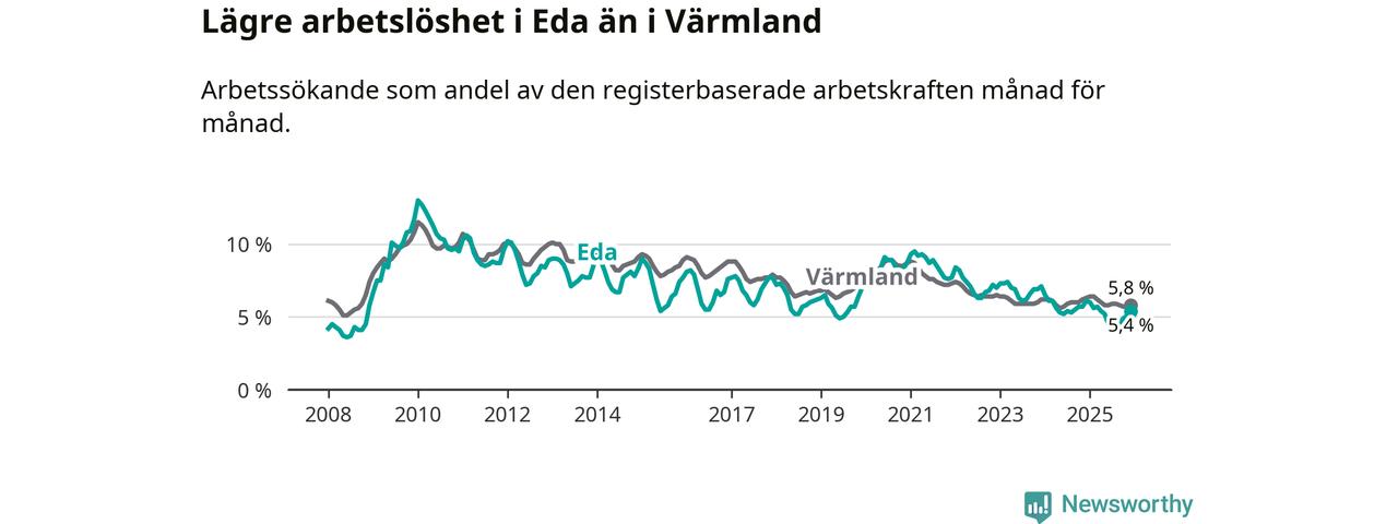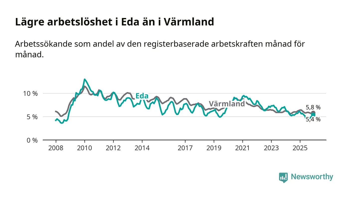 Det är 24:e månaden i följd som arbetslösheten i Eda är lägre än den var under samma tidpunkt året innan. Sedan december 2023 har arbetslösheten gått ner från 7,1 till 5,4 procent.