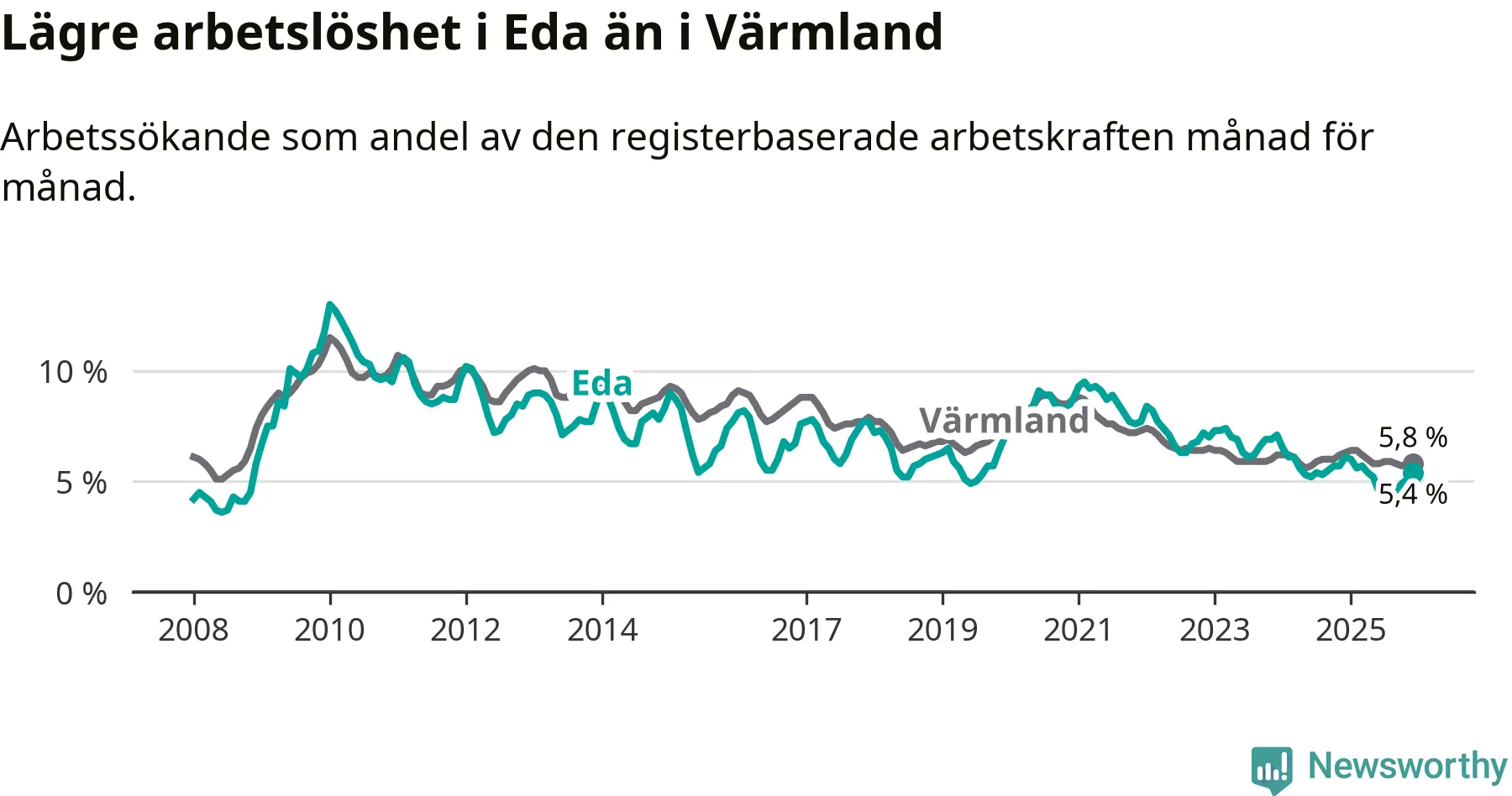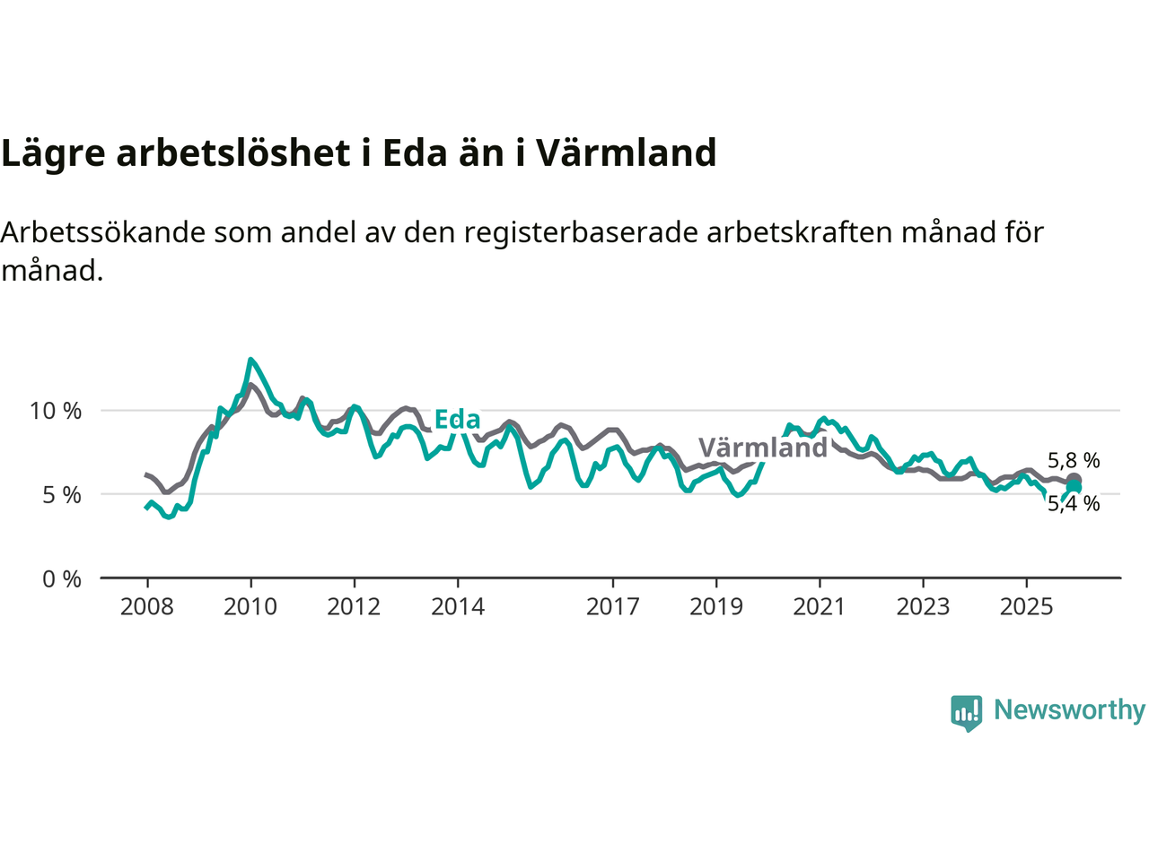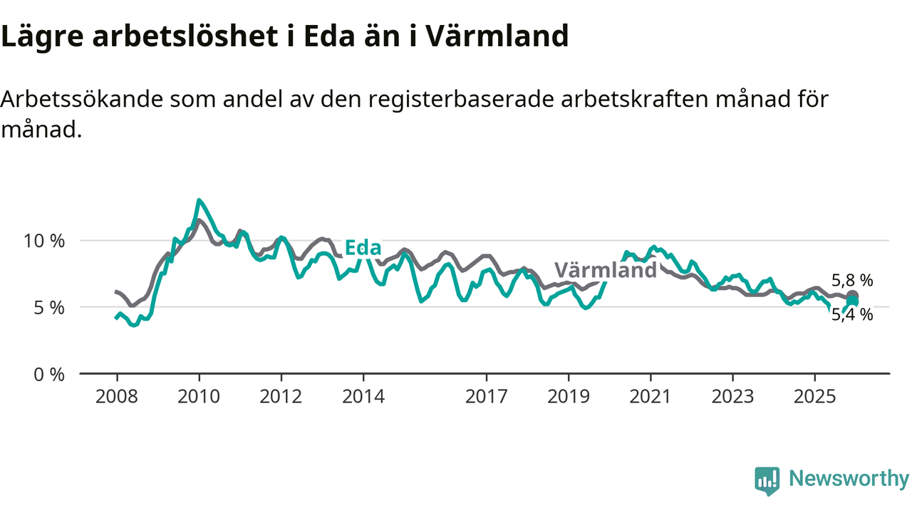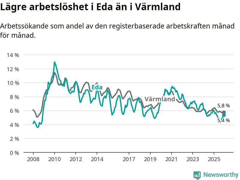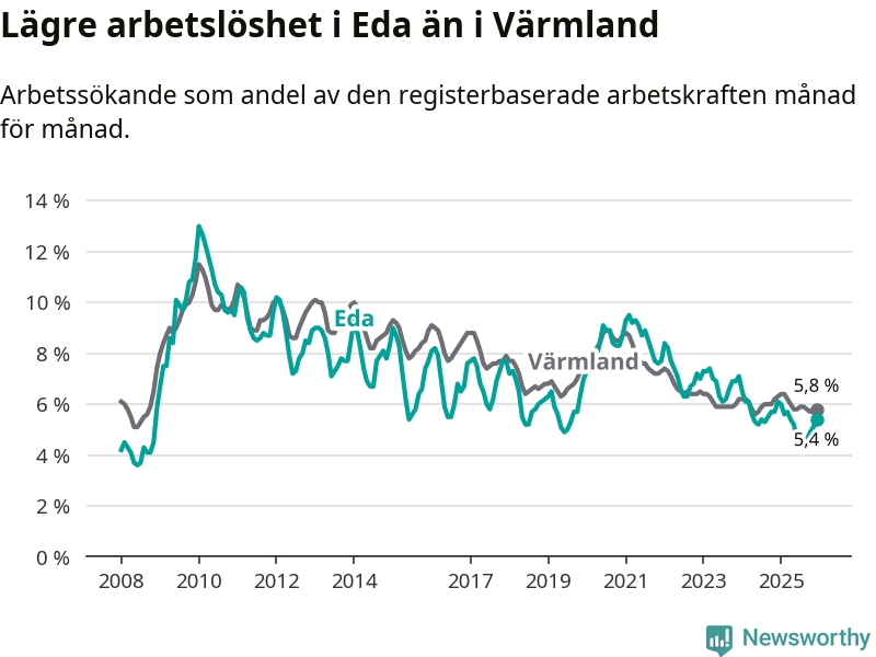 Det är 24:e månaden i följd som arbetslösheten i Eda är lägre än den var under samma tidpunkt året innan. Sedan december 2023 har arbetslösheten gått ner från 7,1 till 5,4 procent.