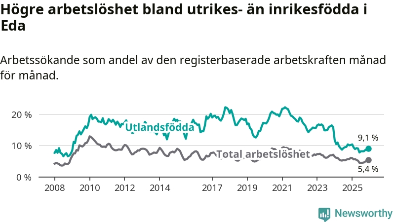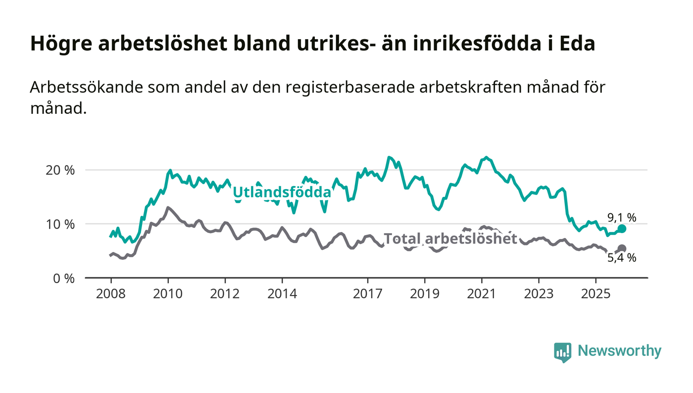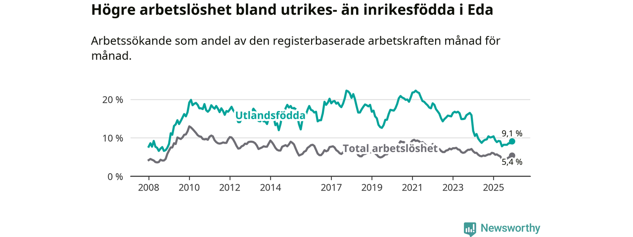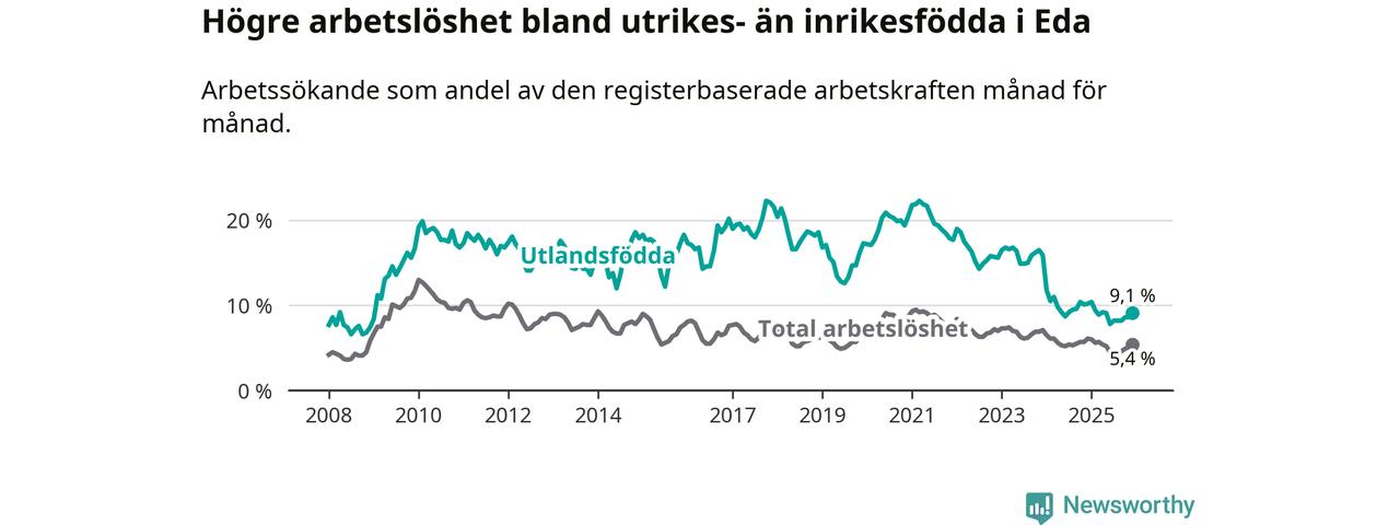 Arbetslösheten bland utlandsfödda var 9,1 procent i Eda under december månad, motsvarande 99 av 1 088 personer. Det är 1,1 procentenheter färre än vid samma tidpunkt i fjol (−15 om man räknar personer). Därmed är de utlandsföddas arbetslöshet lägre än vid samma tidpunkt i fjol för 24:e månaden i följd. Sedan december 2023 har arbetslösheten bland utlandsfödda minskat från 15,9 till 9,1 procent.
