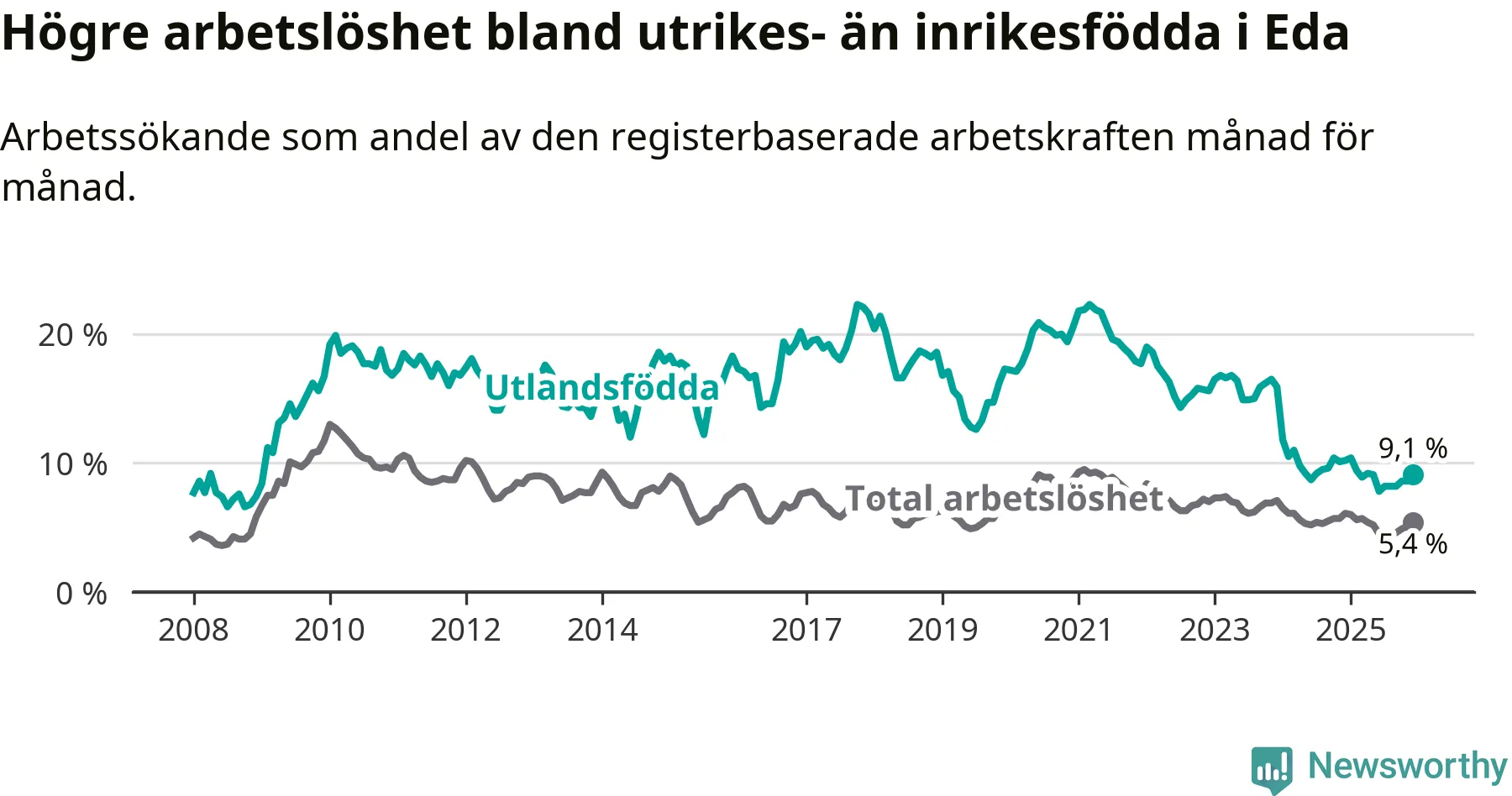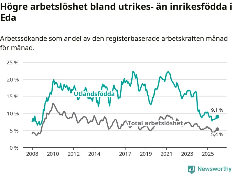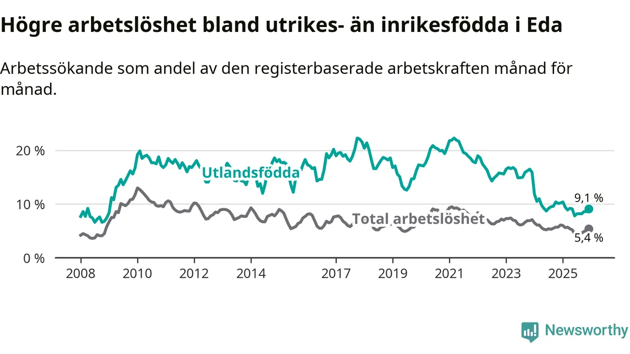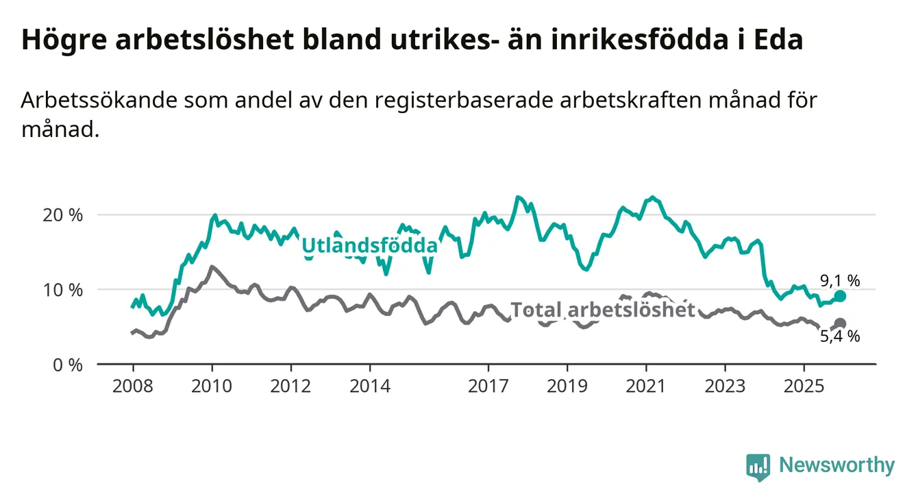 Arbetslösheten bland utlandsfödda var 9,1 procent i Eda under december månad, motsvarande 99 av 1 088 personer. Det är 1,1 procentenheter färre än vid samma tidpunkt i fjol (−15 om man räknar personer). Därmed är de utlandsföddas arbetslöshet lägre än vid samma tidpunkt i fjol för 24:e månaden i följd. Sedan december 2023 har arbetslösheten bland utlandsfödda minskat från 15,9 till 9,1 procent.