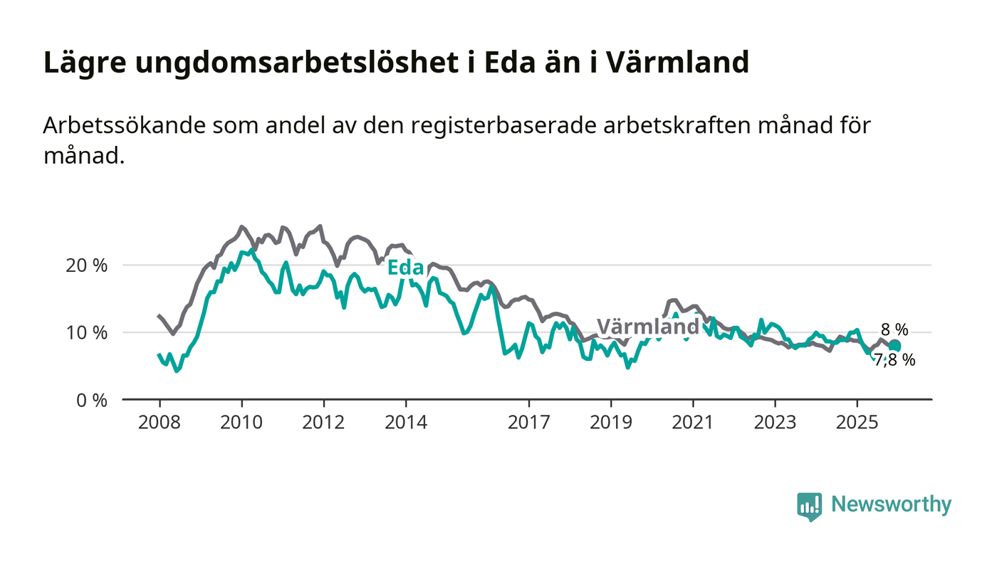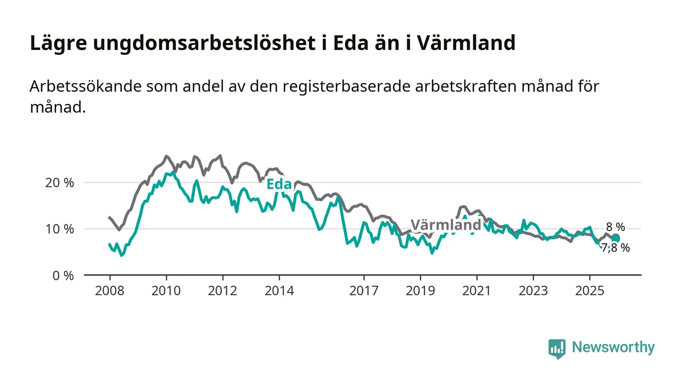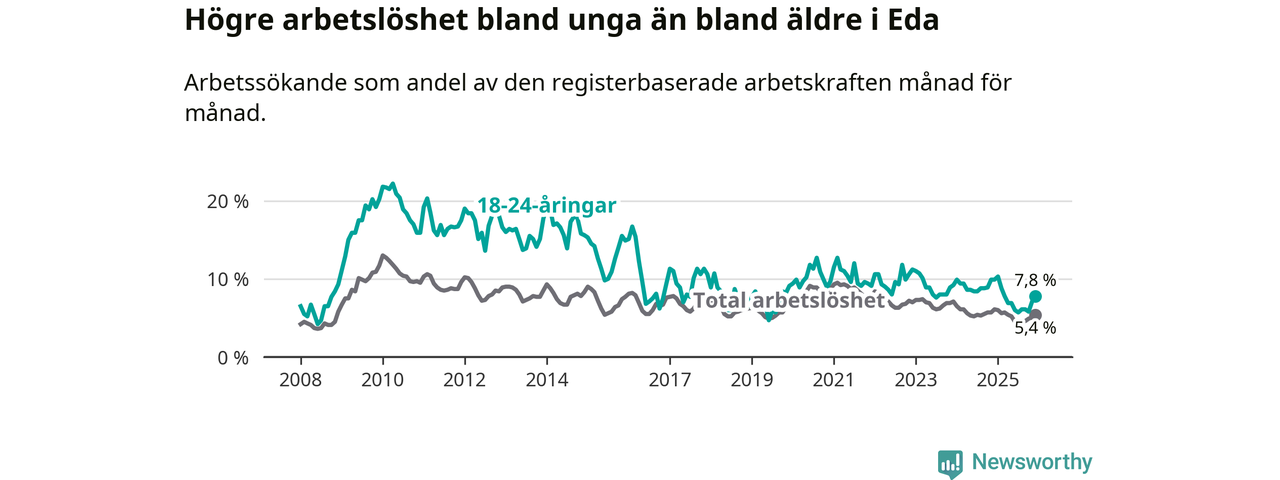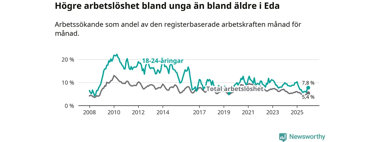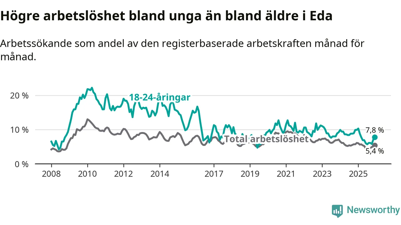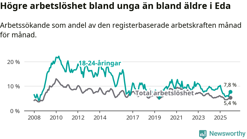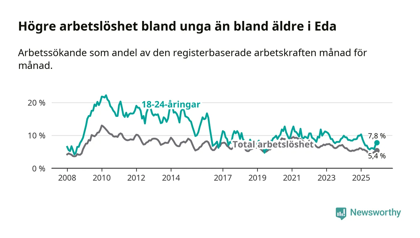 I och med den senaste månadens nedgång har de ungas arbetslöshet i Eda sjunkit elva månader i följd (ner från 10,3 procent i januari 2025 till 7,8 procent nu).