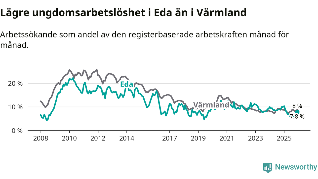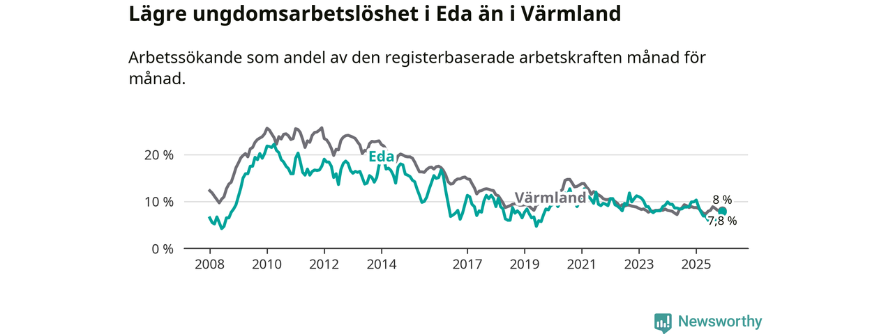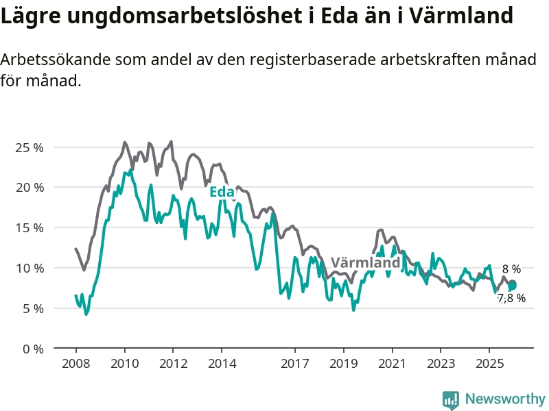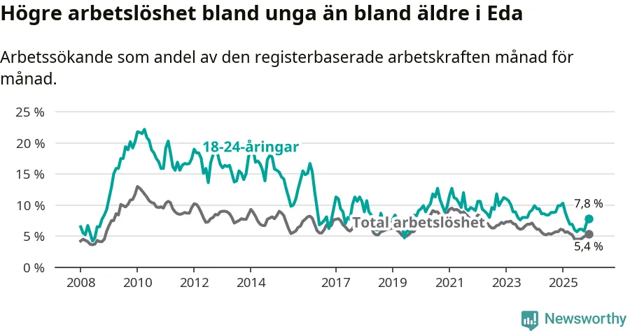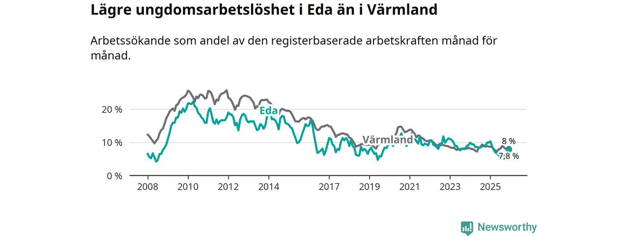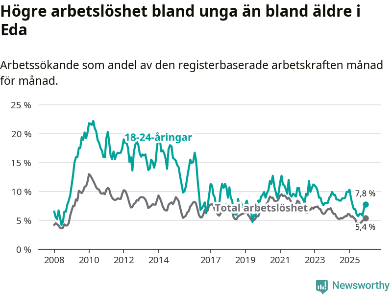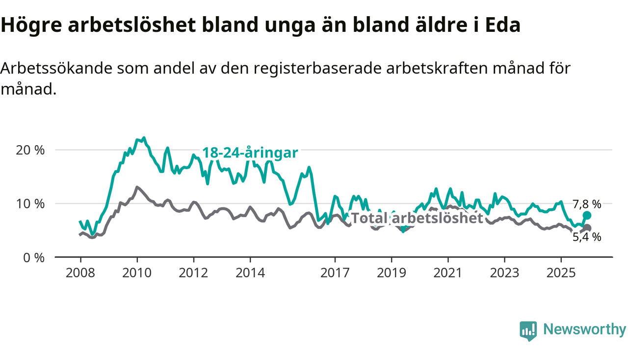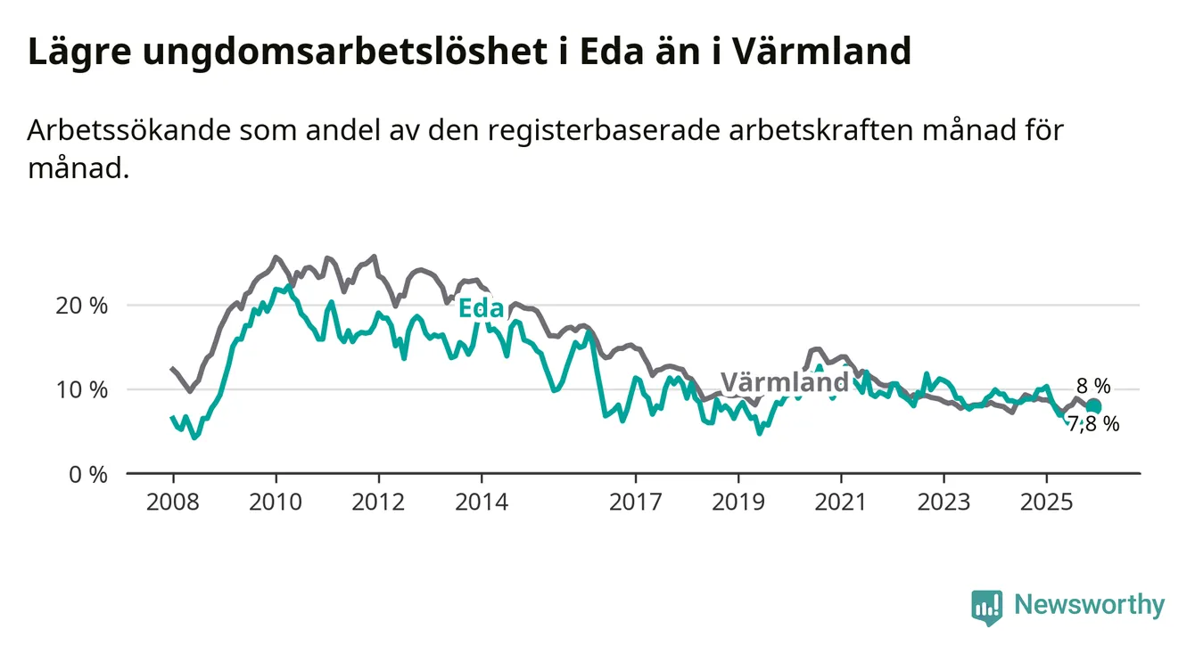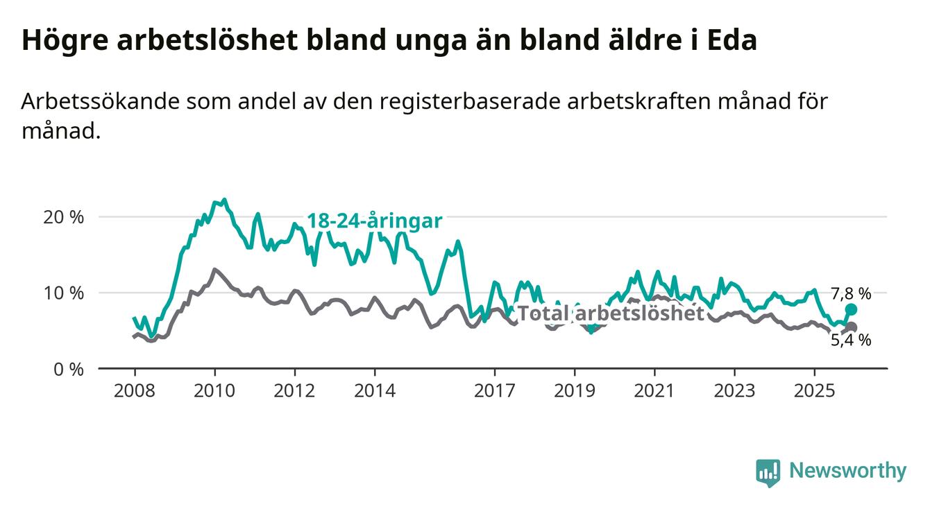I och med den senaste månadens nedgång har de ungas arbetslöshet i Eda sjunkit elva månader i följd (ner från 10,3 procent i januari 2025 till 7,8 procent nu).