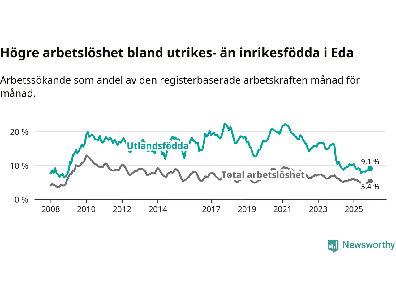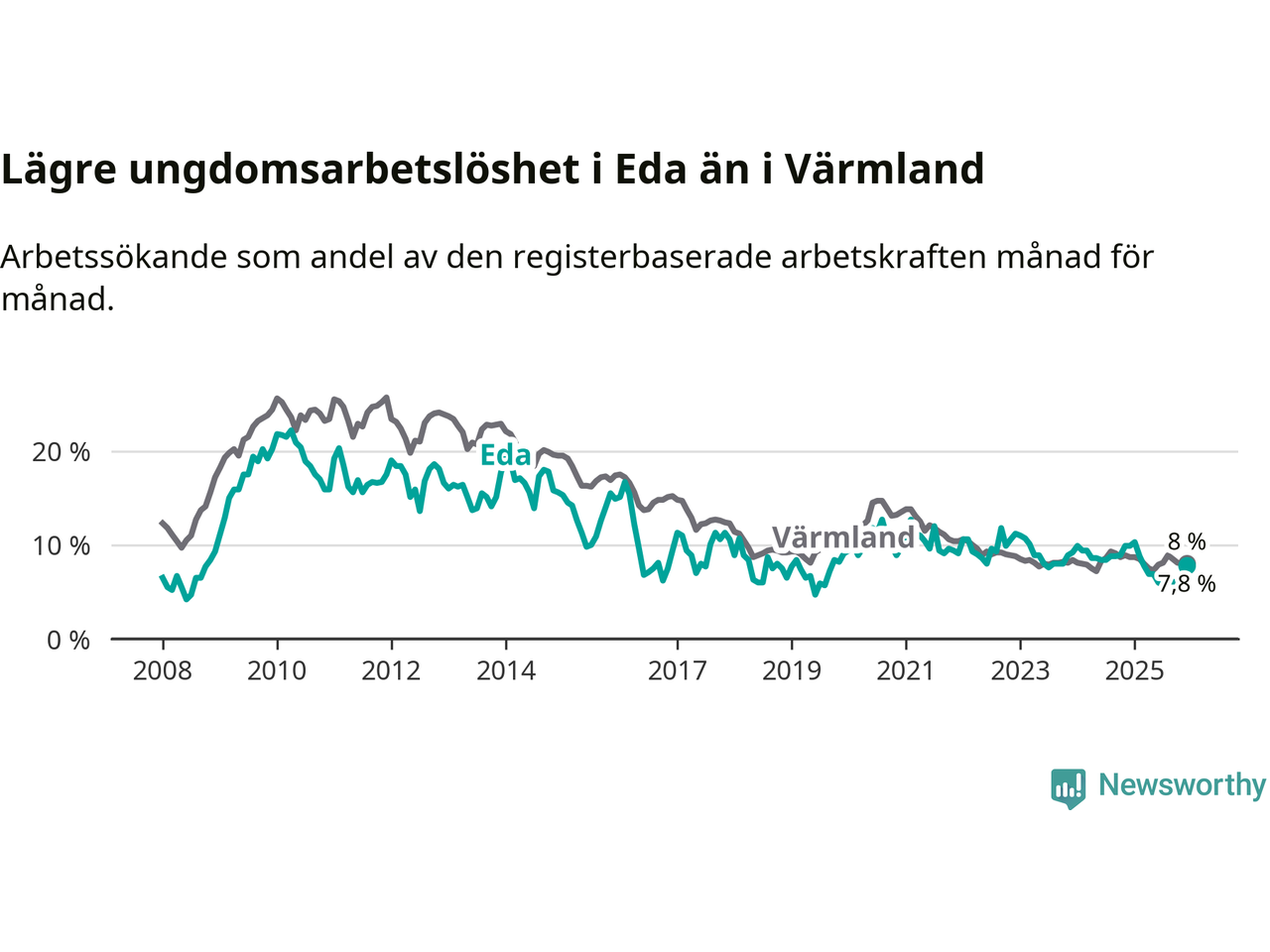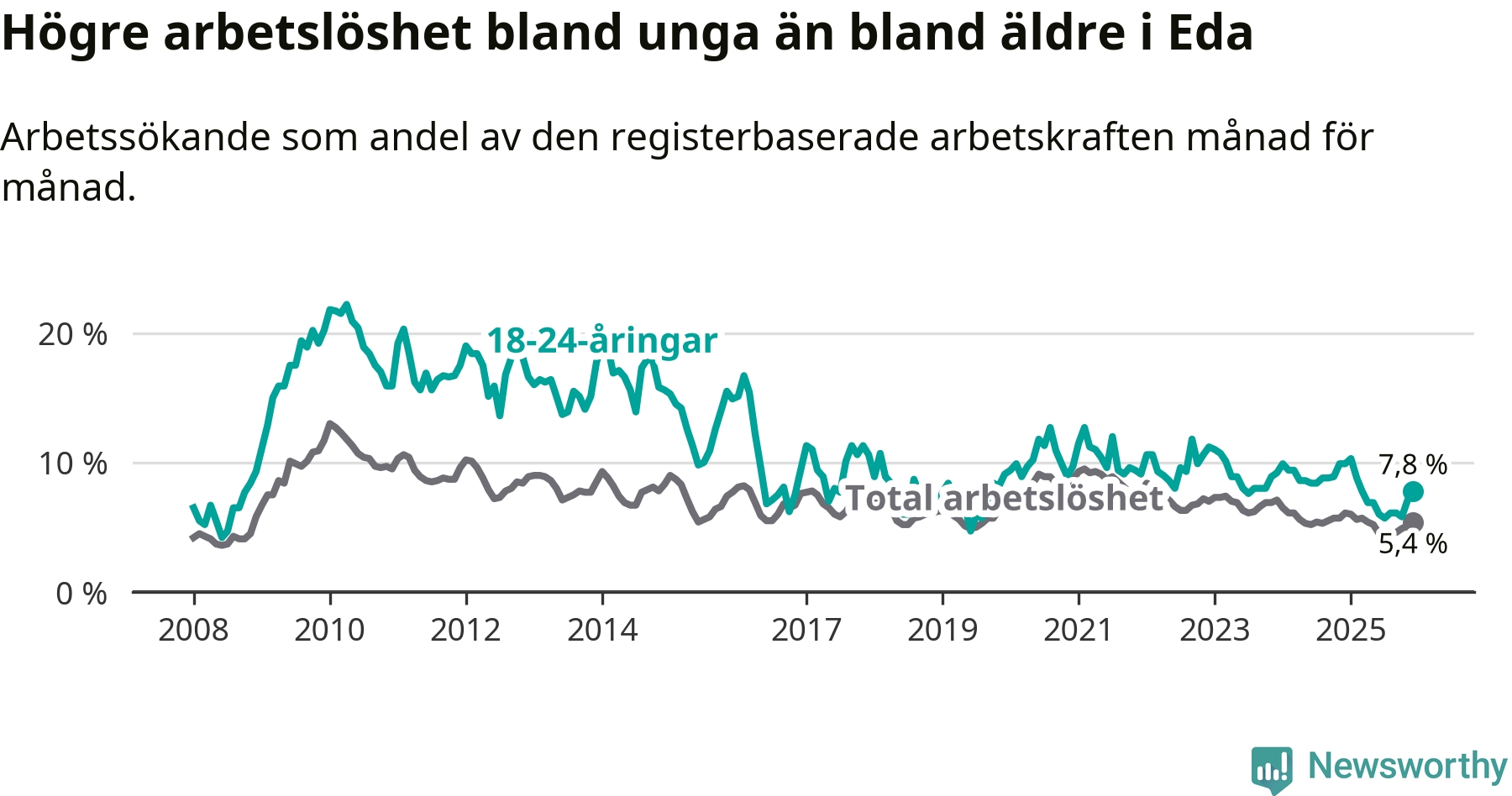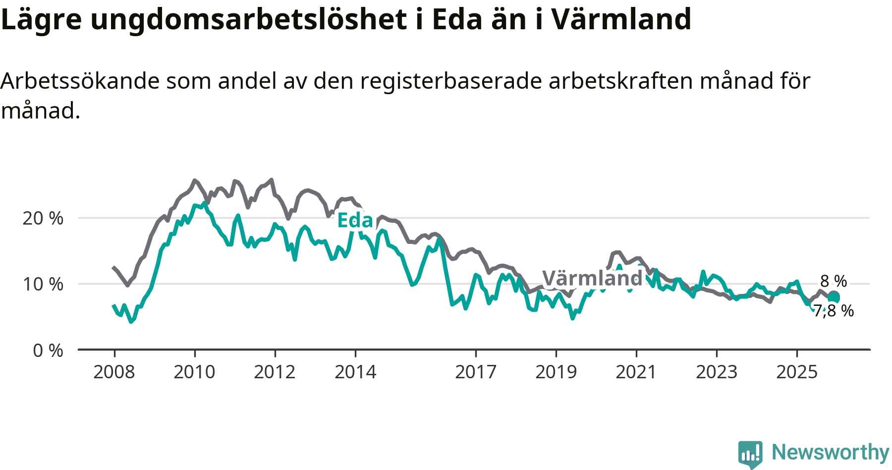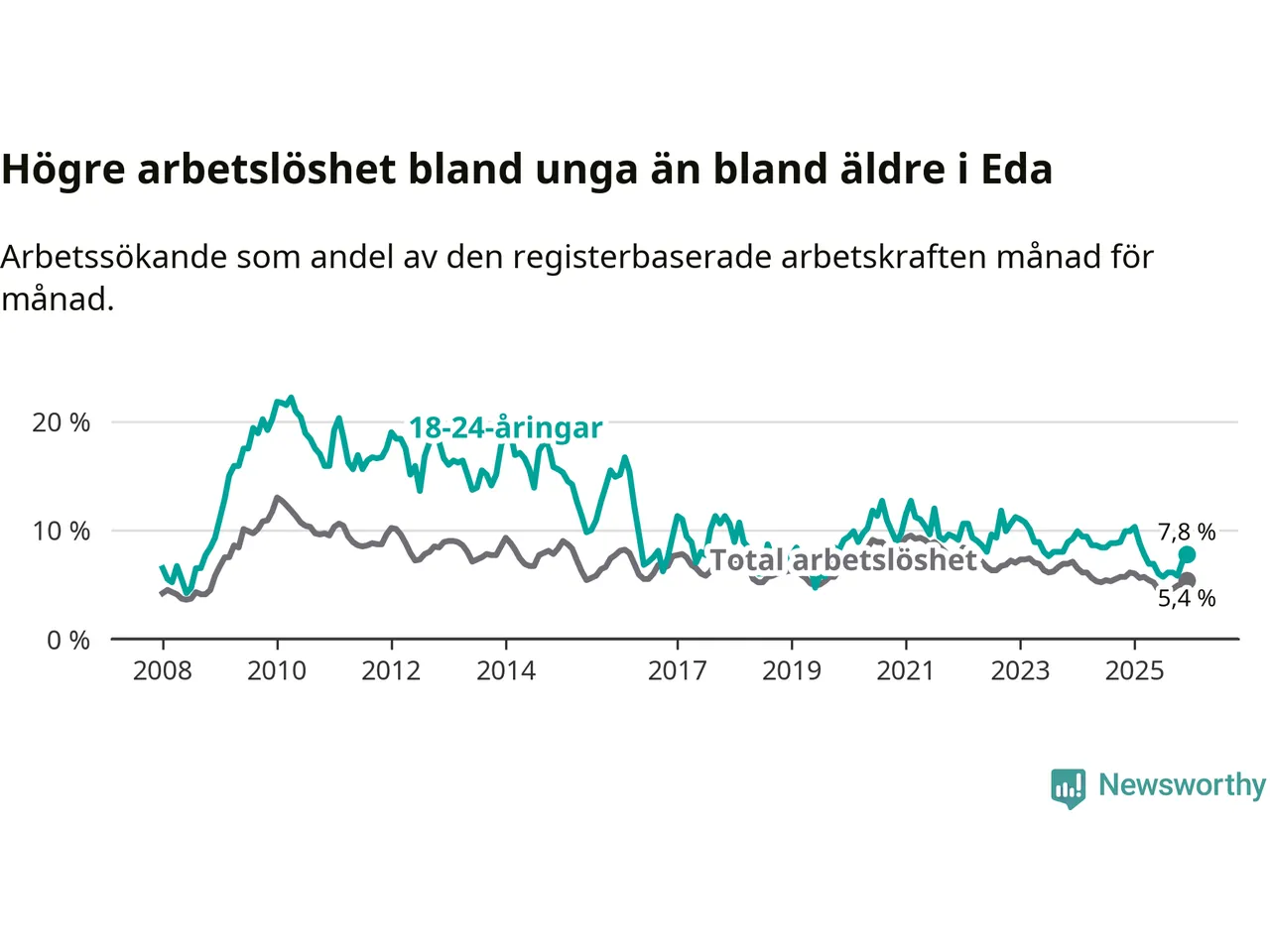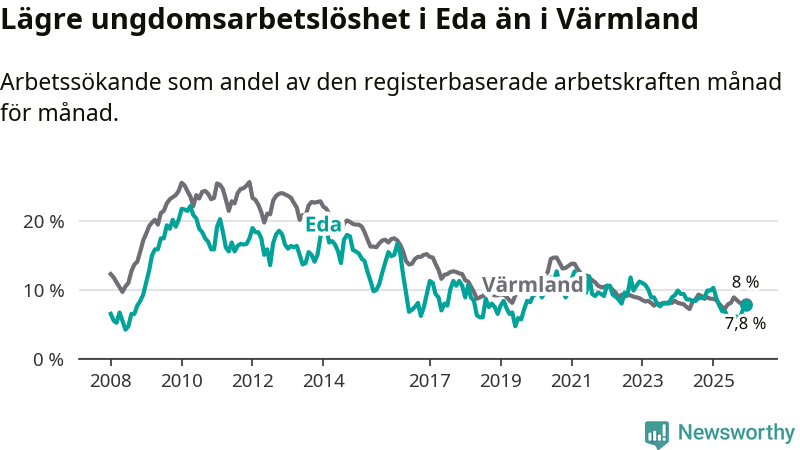 I och med den senaste månadens nedgång har de ungas arbetslöshet i Eda sjunkit elva månader i följd (ner från 10,3 procent i januari 2025 till 7,8 procent nu).