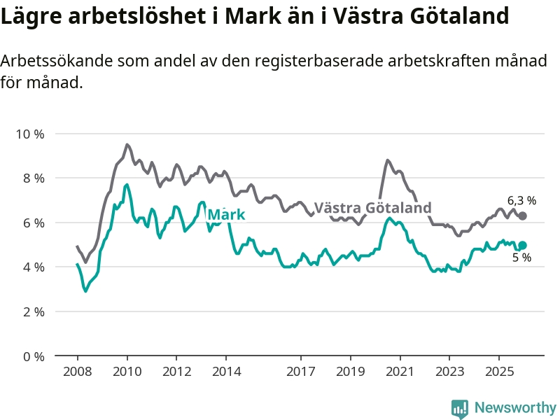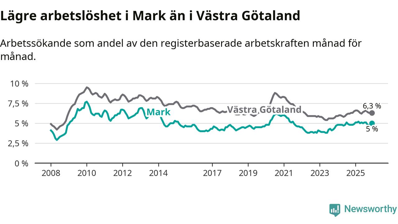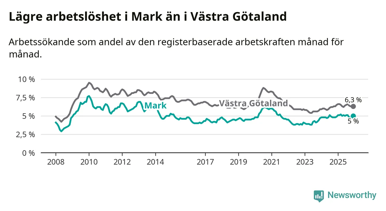 Graf: Arbetslöshet i Marks kommun och Västra Götalands län