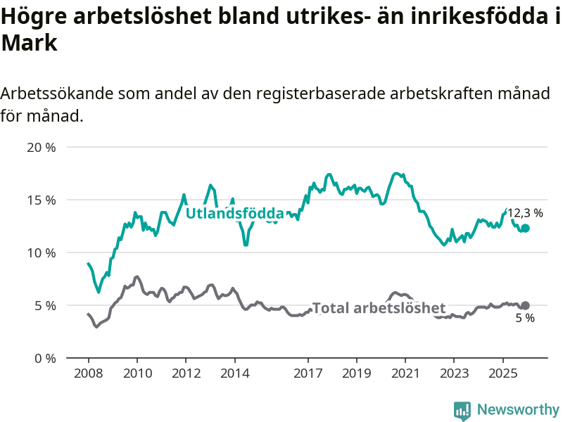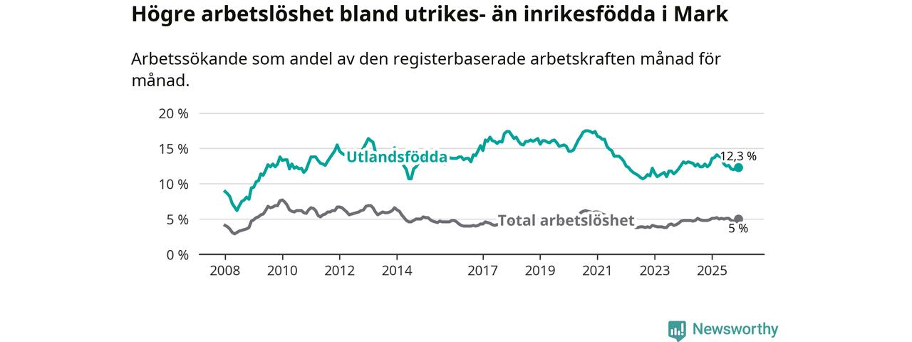 Arbetslösheten bland utlandsfödda var 12,3 procent i Mark under december månad, motsvarande 322 av 2 618 personer. Det är 0,4 procentenheter färre än vid samma tidpunkt i fjol (−9 om man räknar personer).