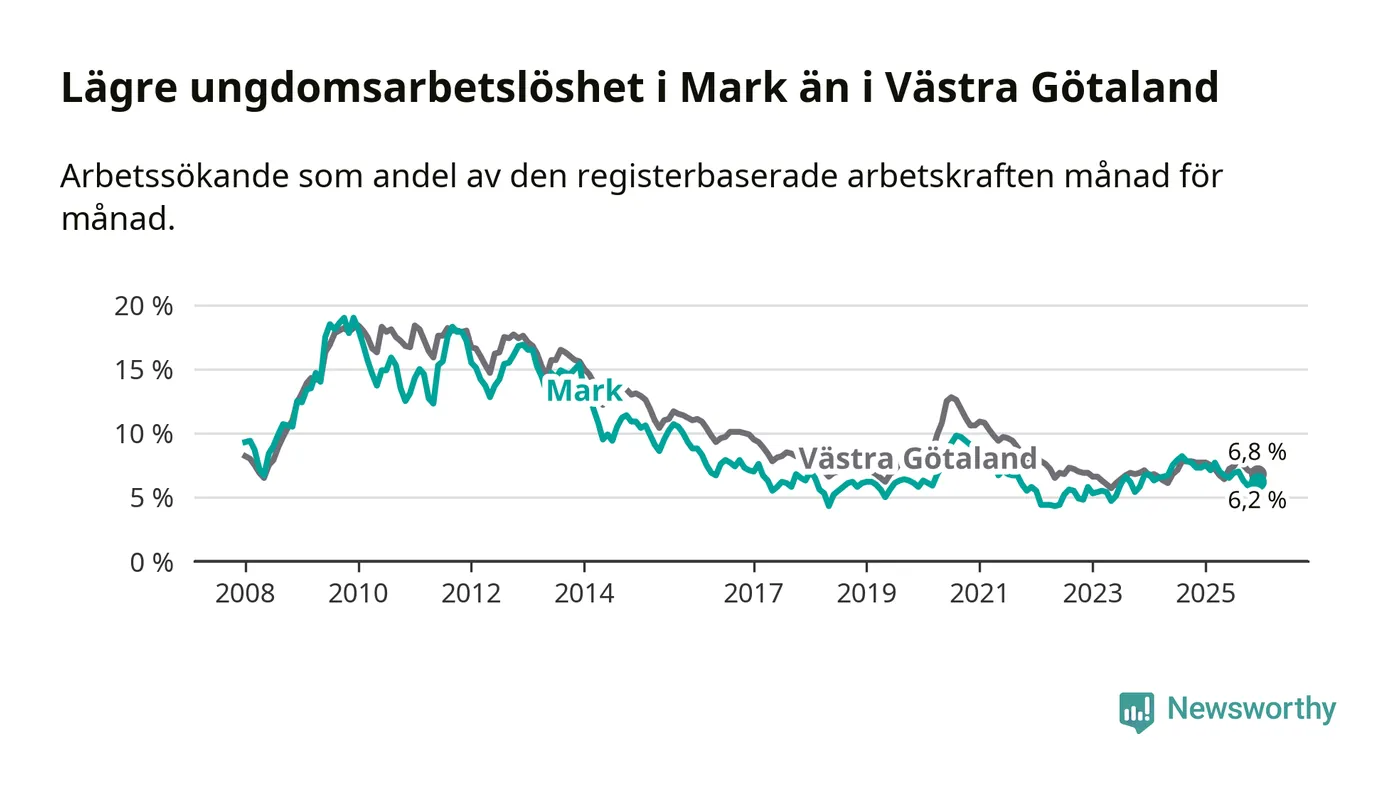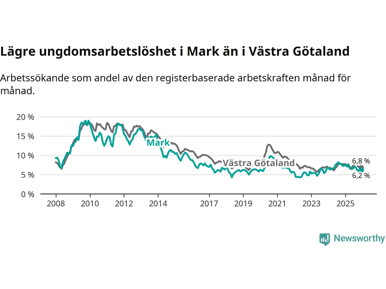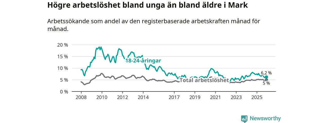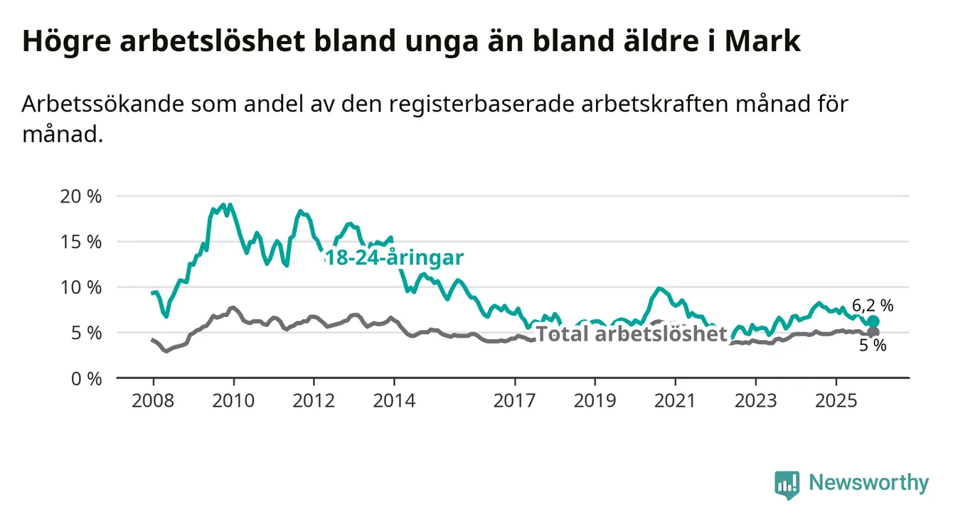 I och med den senaste månadens nedgång har de ungas arbetslöshet i Mark sjunkit sju månader i följd (ner från 6,7 procent i maj 2025 till 6,2 procent nu).