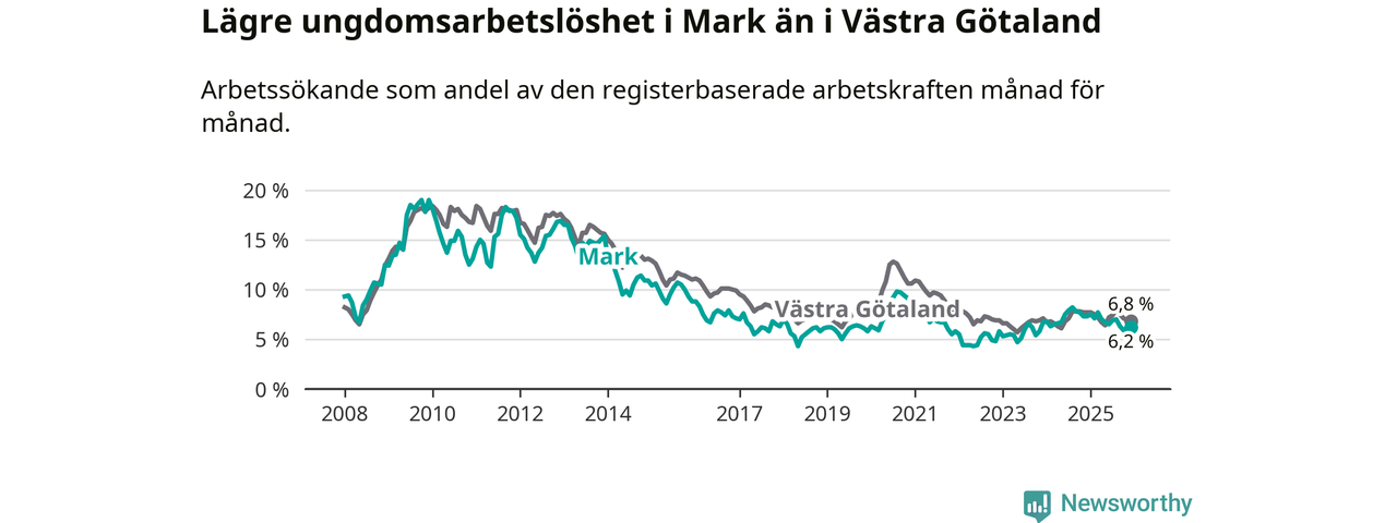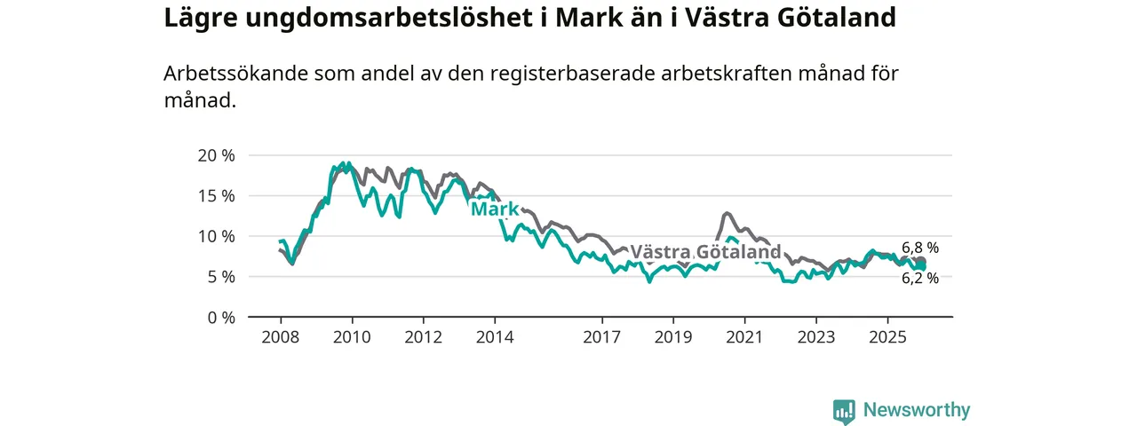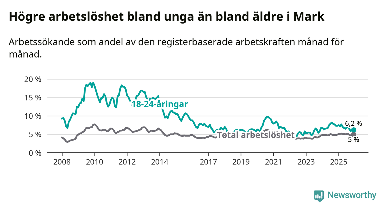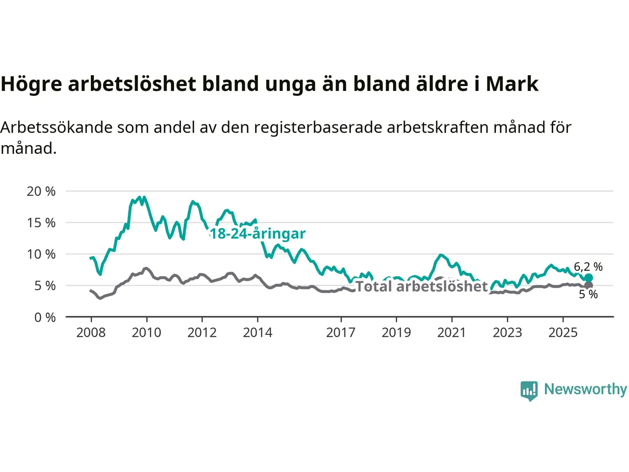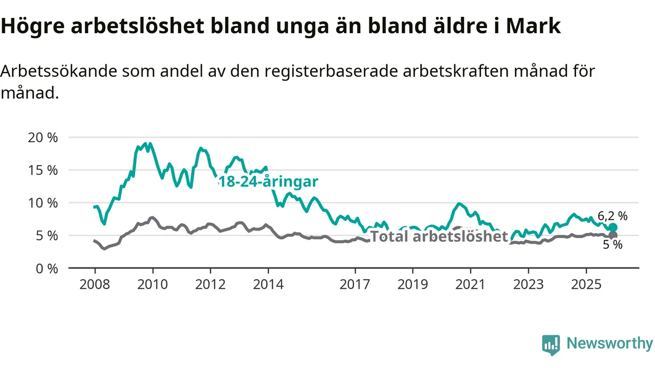 I och med den senaste månadens nedgång har de ungas arbetslöshet i Mark sjunkit sju månader i följd (ner från 6,7 procent i maj 2025 till 6,2 procent nu).