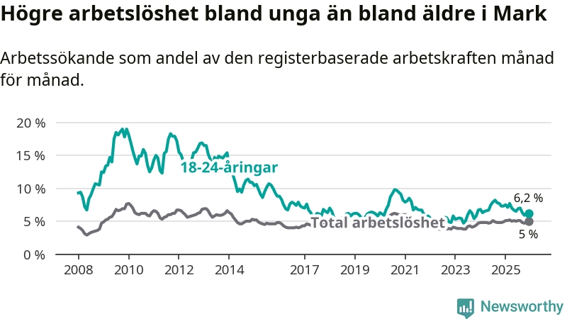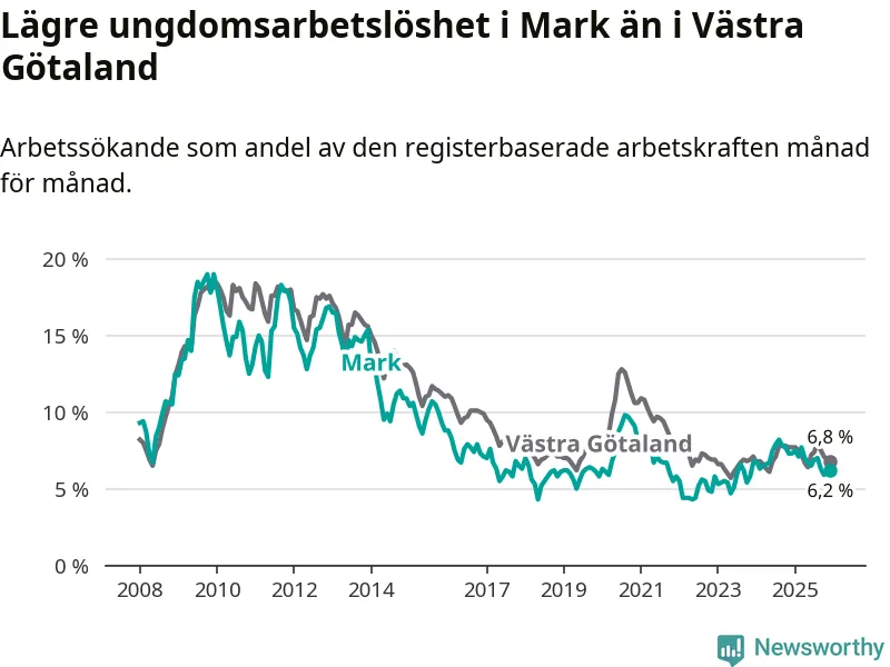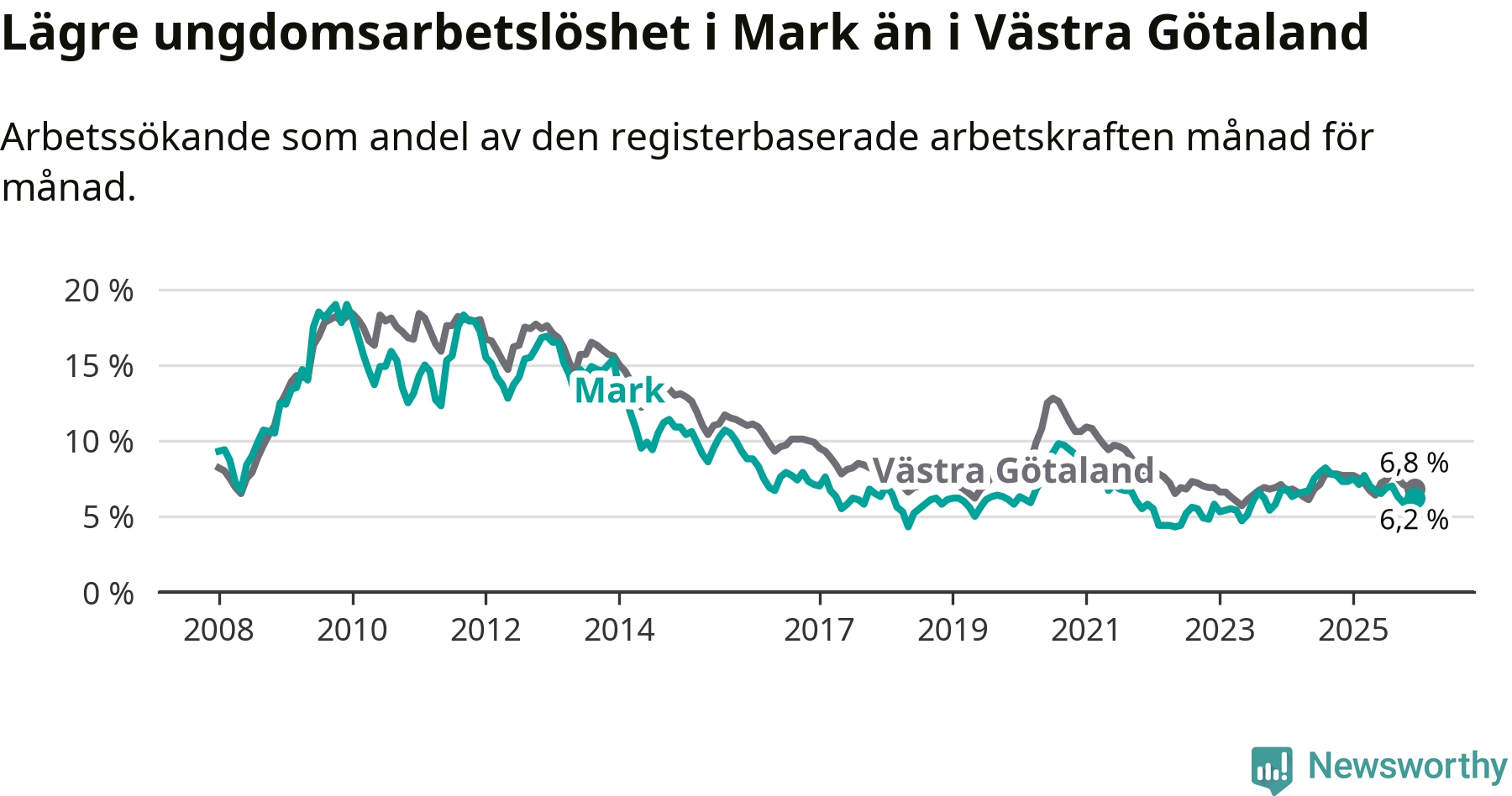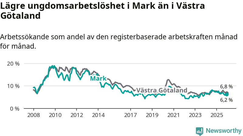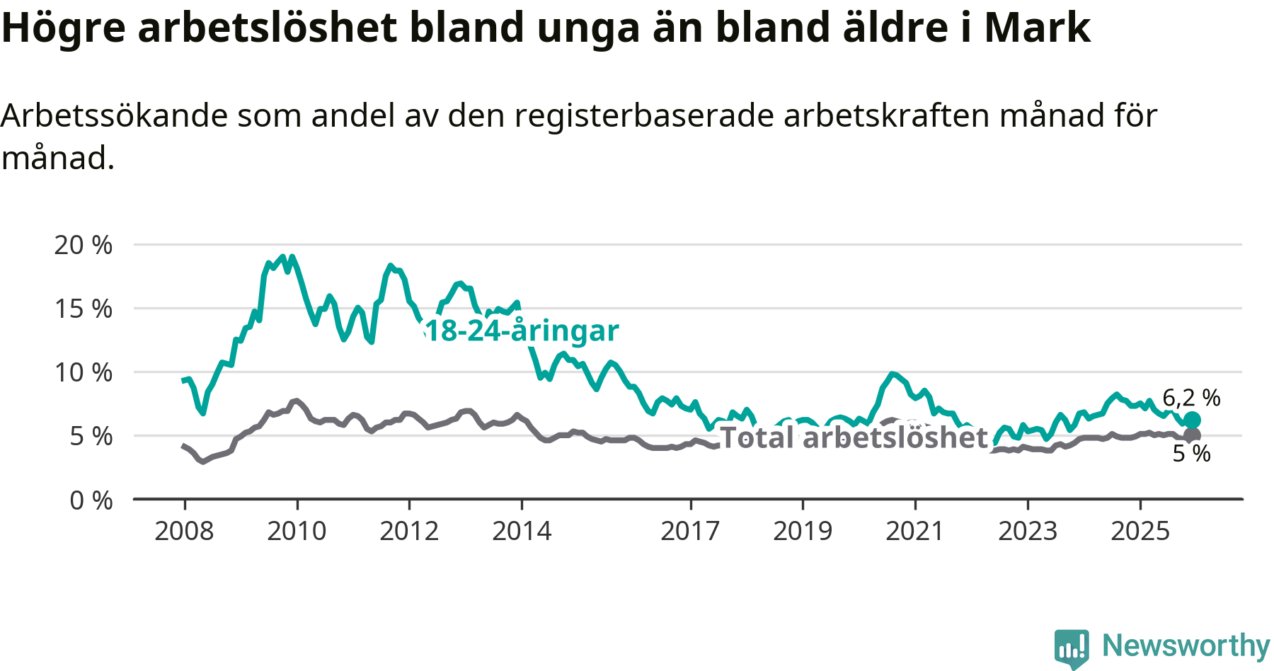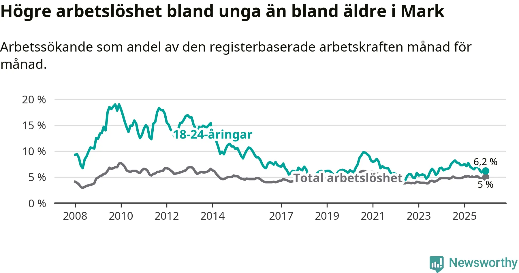I och med den senaste månadens nedgång har de ungas arbetslöshet i Mark sjunkit sju månader i följd (ner från 6,7 procent i maj 2025 till 6,2 procent nu).